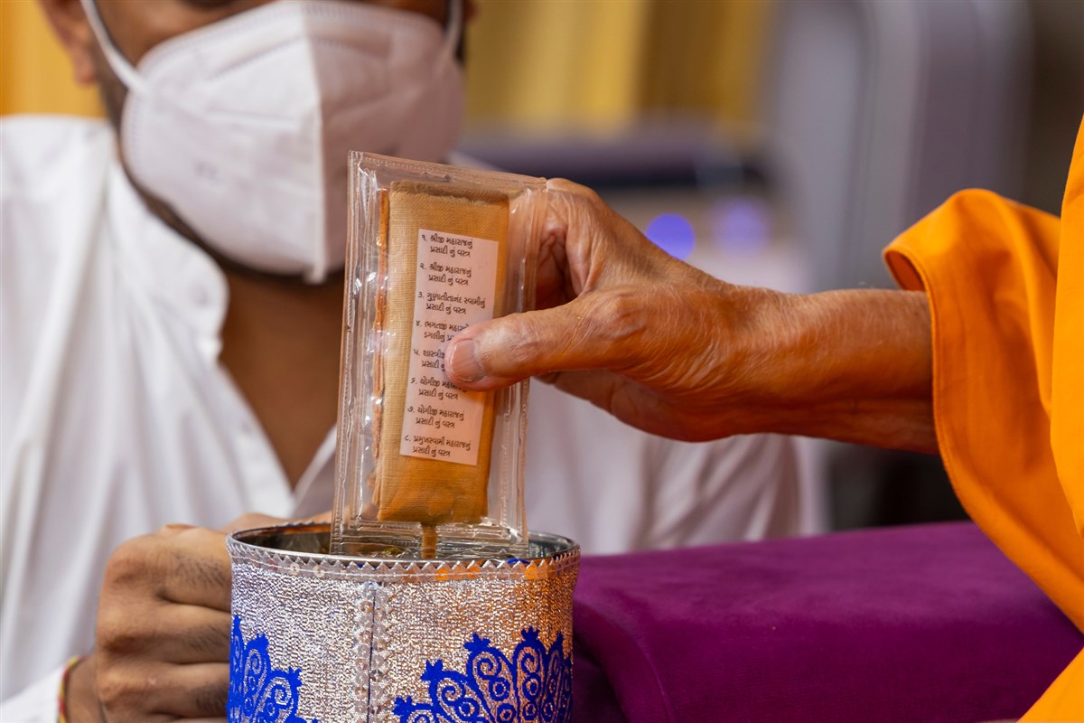 Swamishri sanctifies water with the holy relics of Bhagwan Swaminarayan and the Guru Parampara