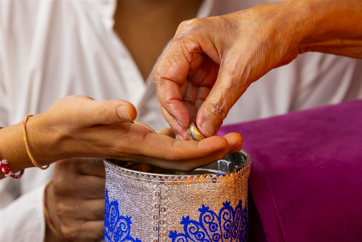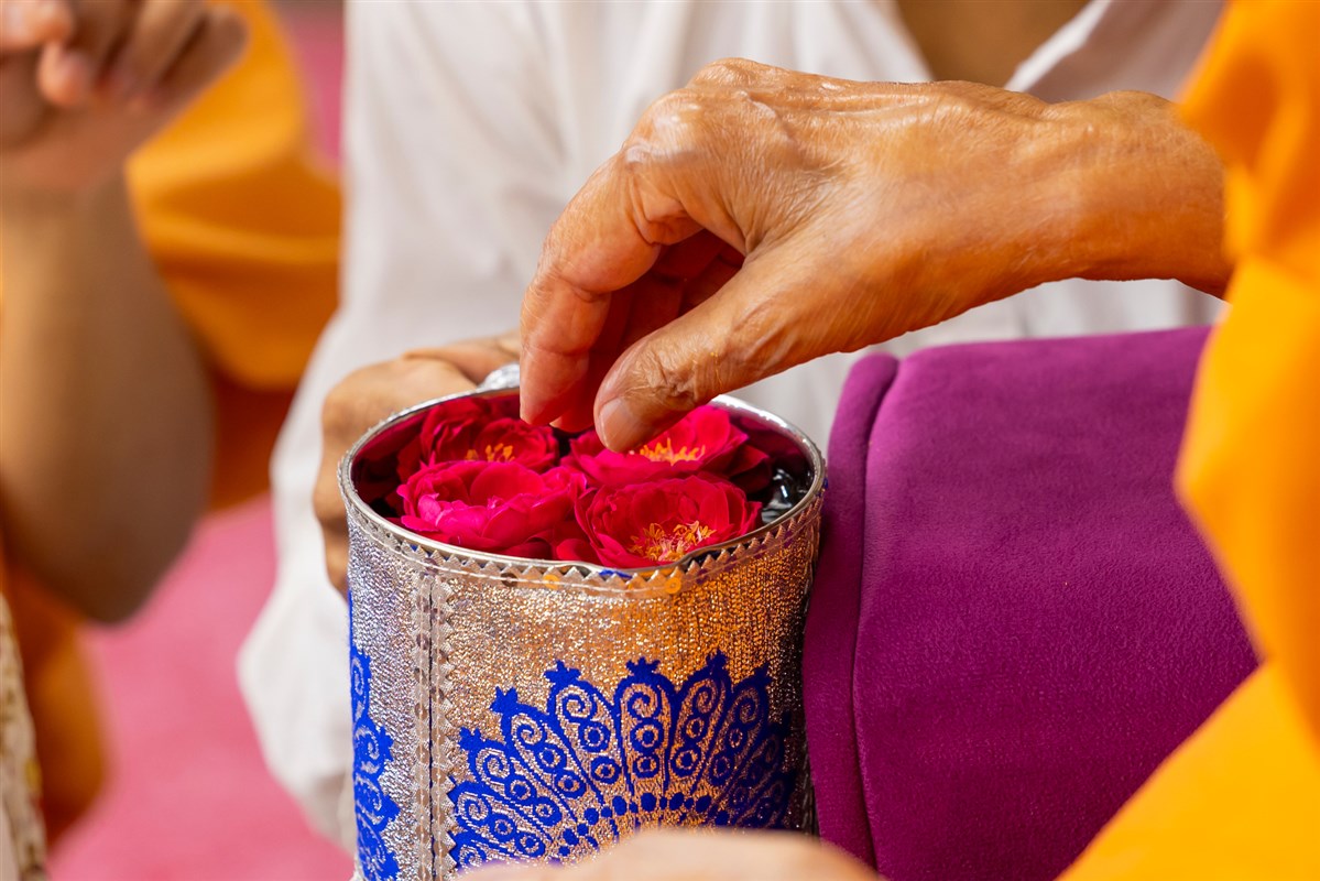 Swamishri adds flowers to the sanctified water