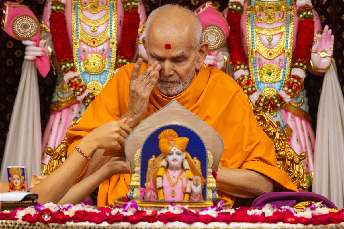 Param Pujya Mahant Swami Maharaj applies a tilak on his forehead