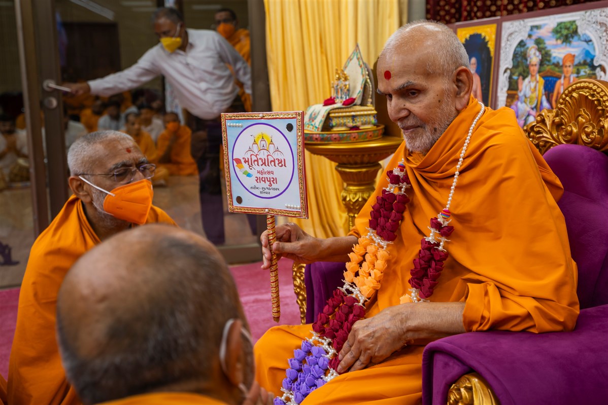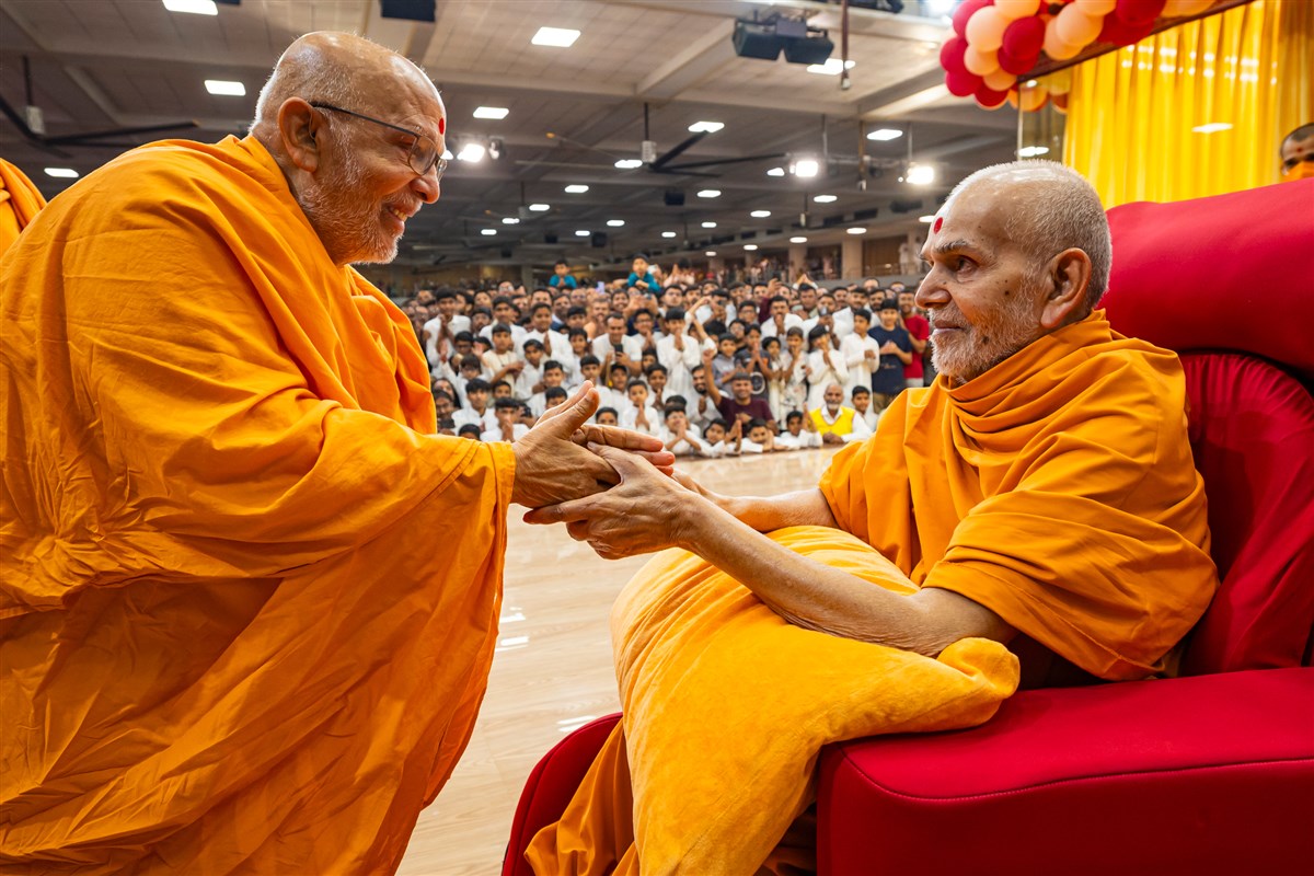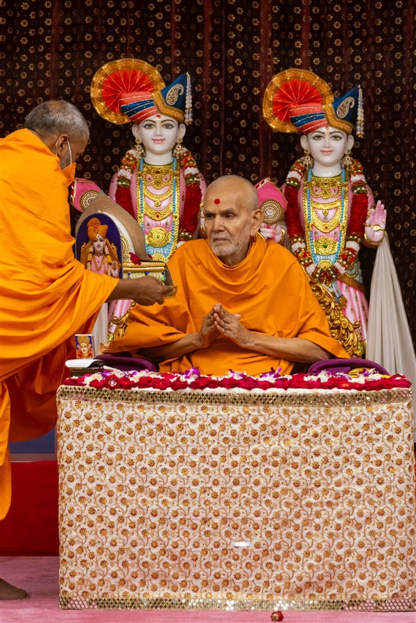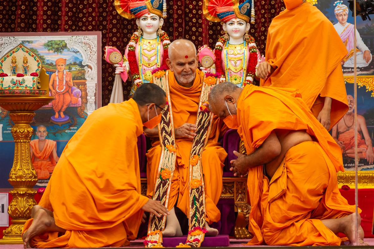 Swamis honor Swamishri with a garland