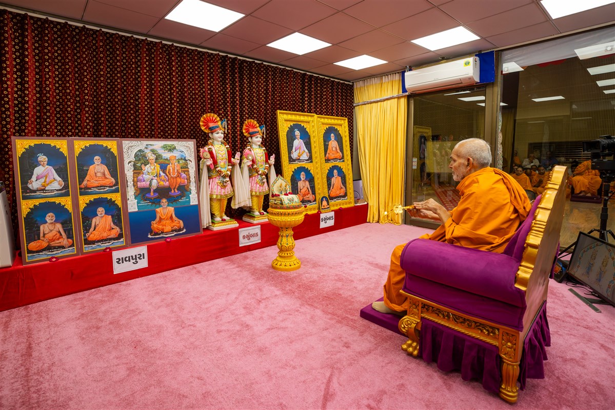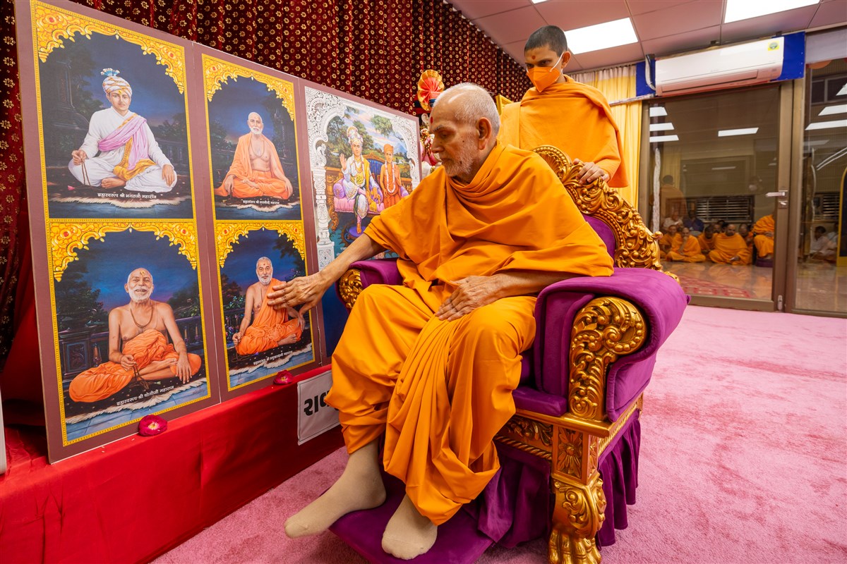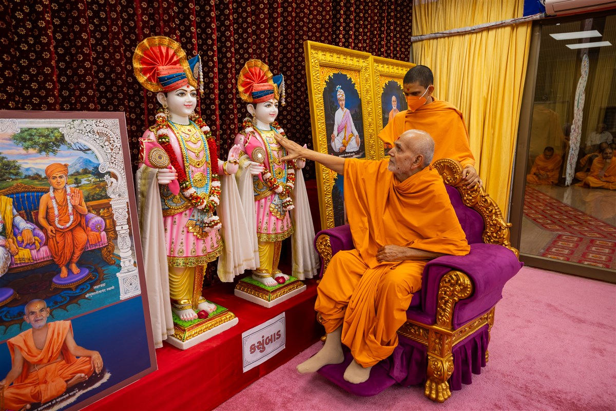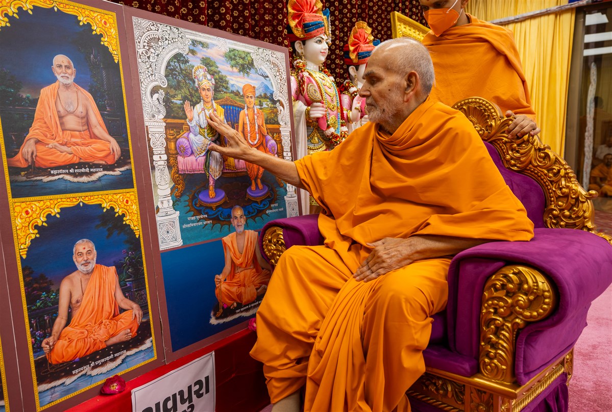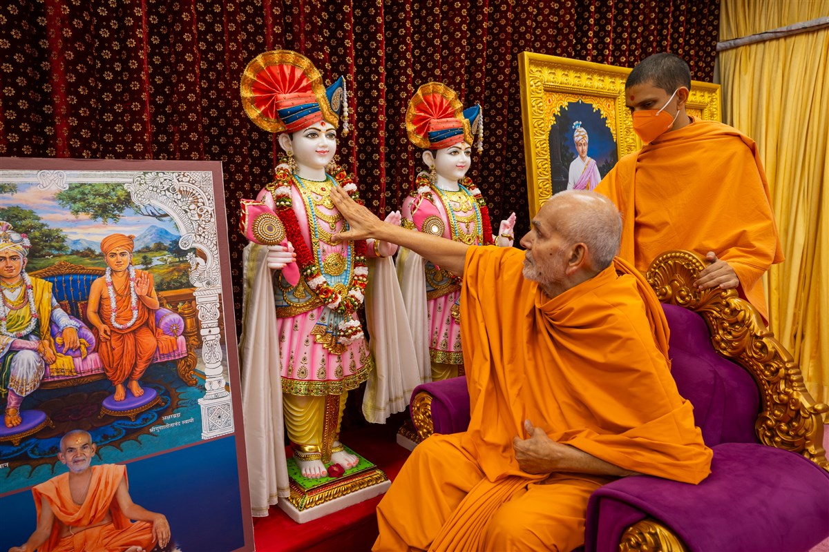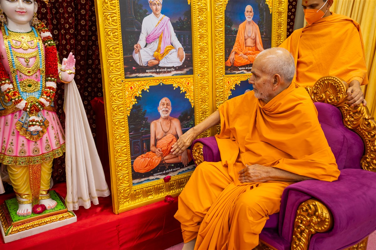 Swamishri engrossed in darshan of Shri Harikrishna Maharaj and Shri Gunatitanand Swami Maharaj