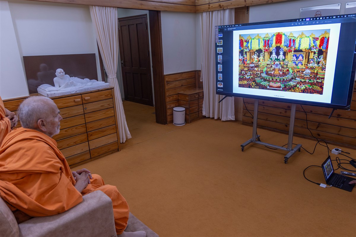 Swamishri doing darshan of the annakuts offered at BAPS mandirs