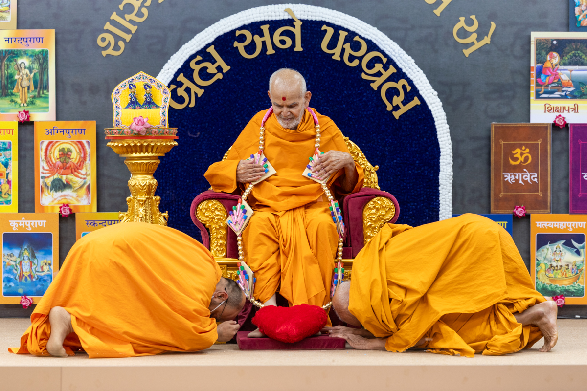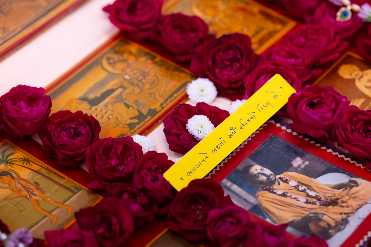 Swamishri places a flower at the feet of Shri Harikrishna Maharaj and Shri Gunatitanand Swami Maharaj