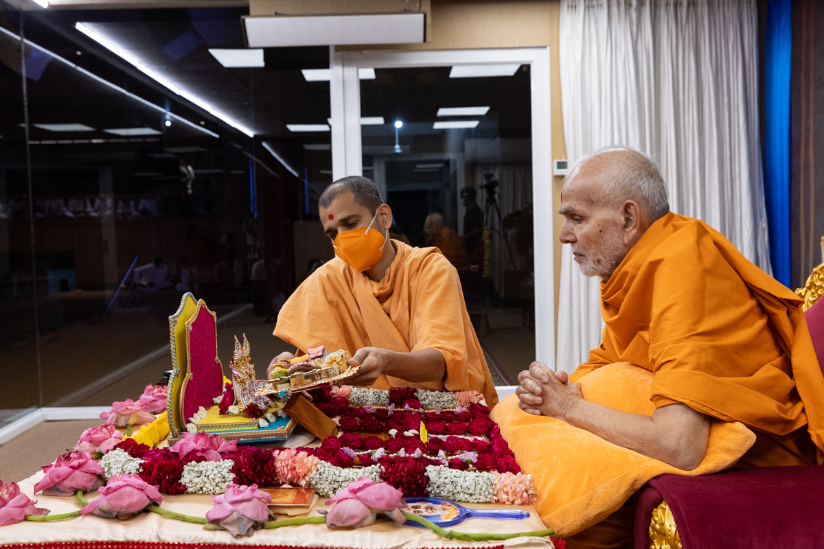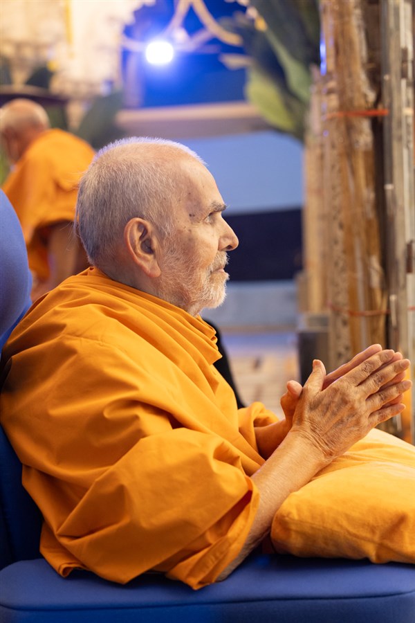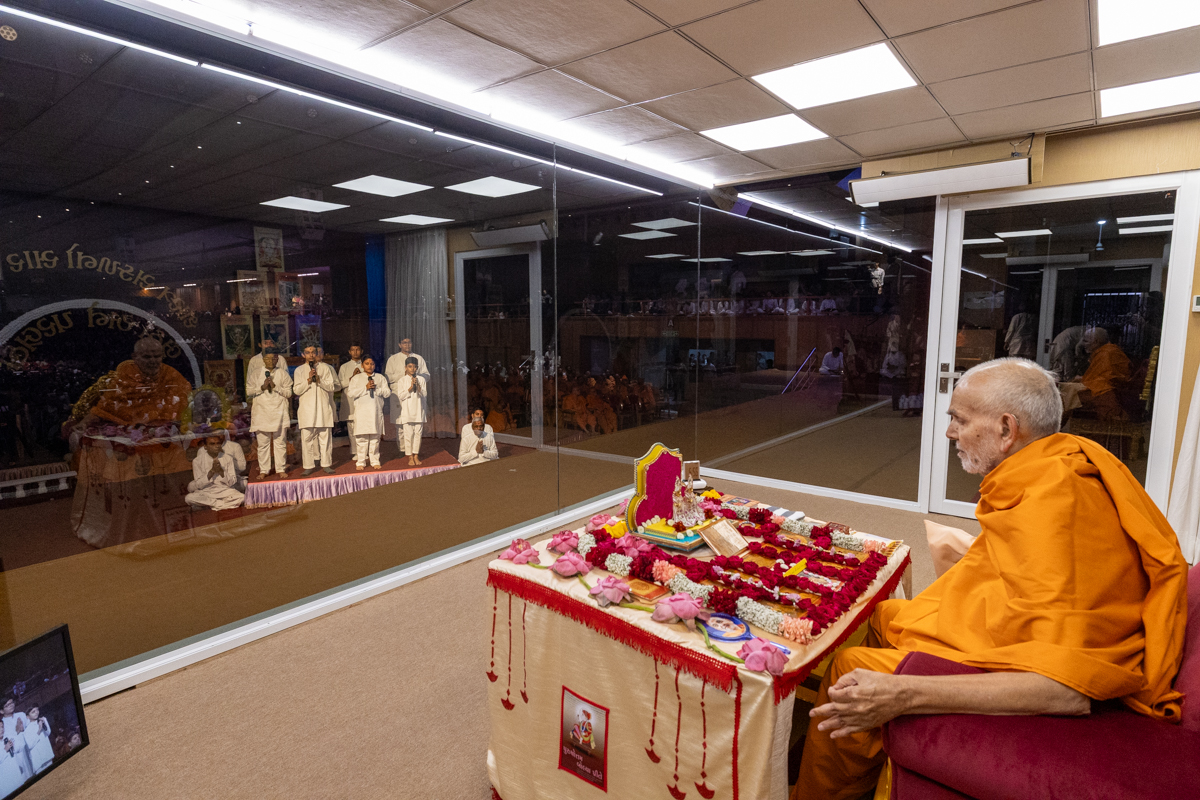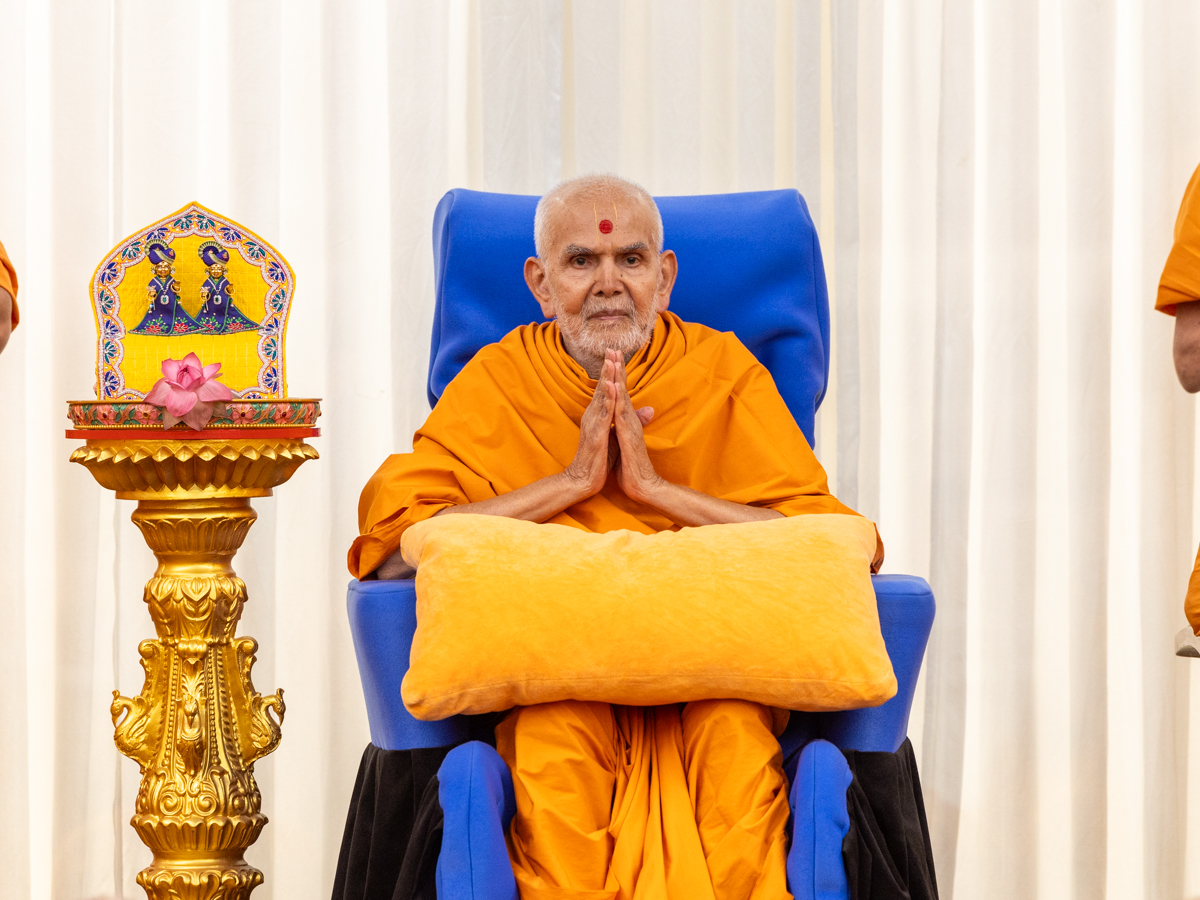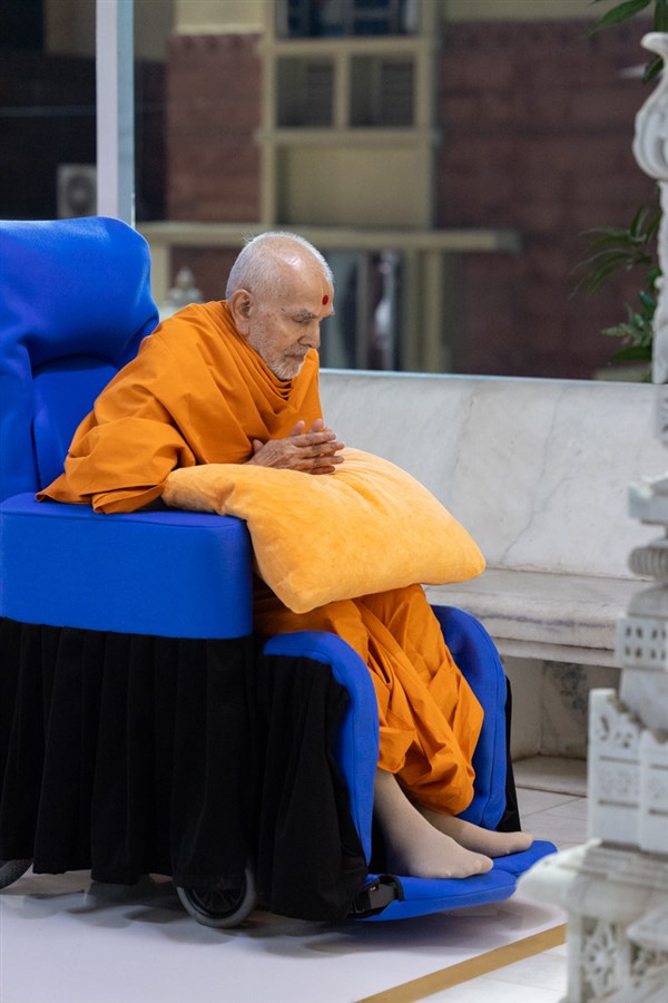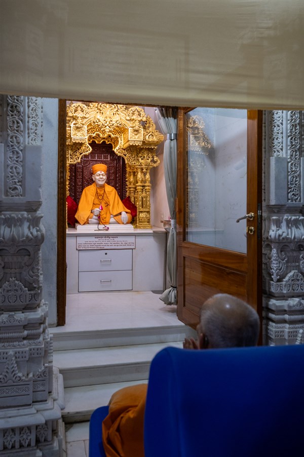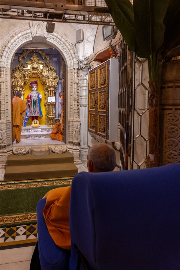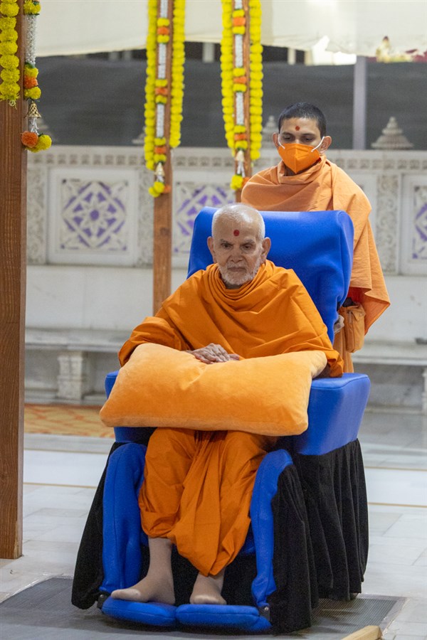 Param Pujya Mahant Swami Maharaj arrives to perform his daily puja