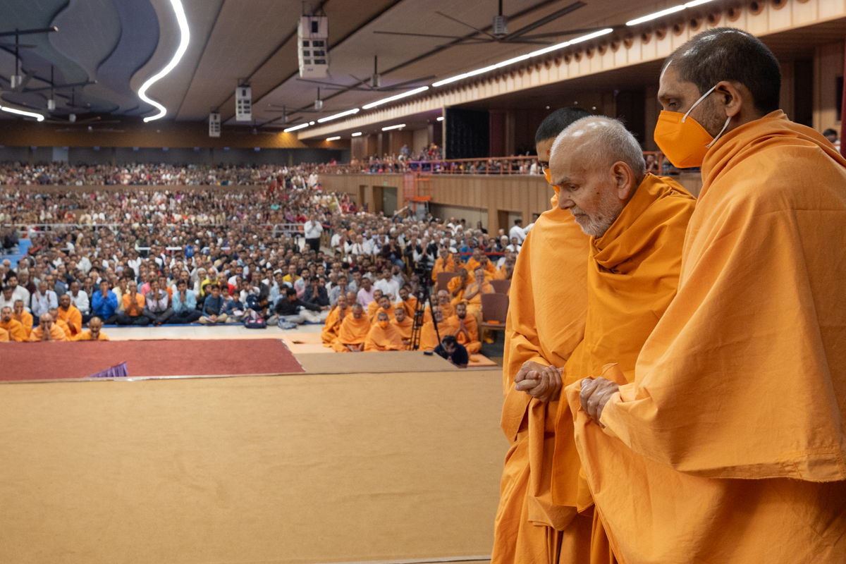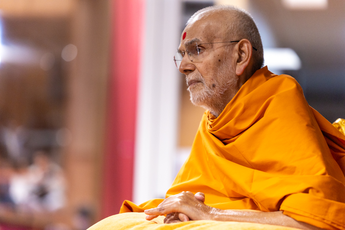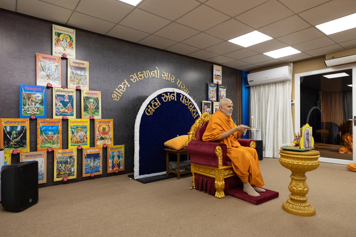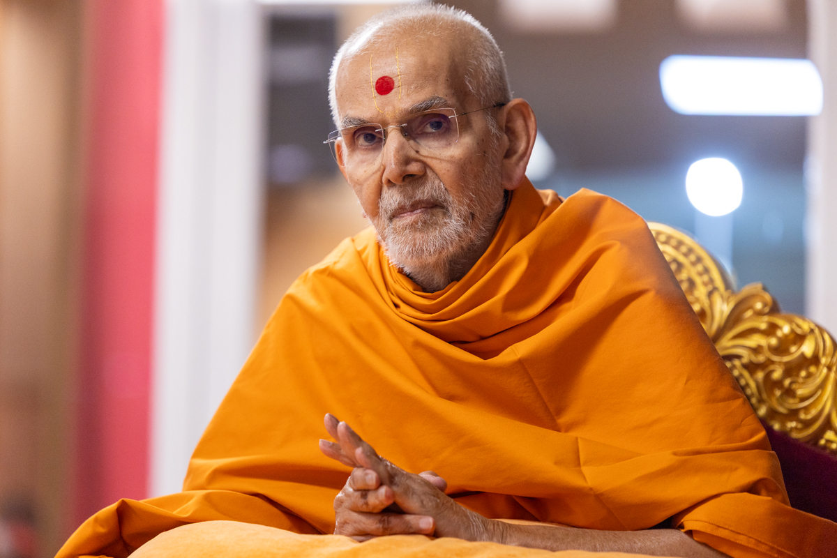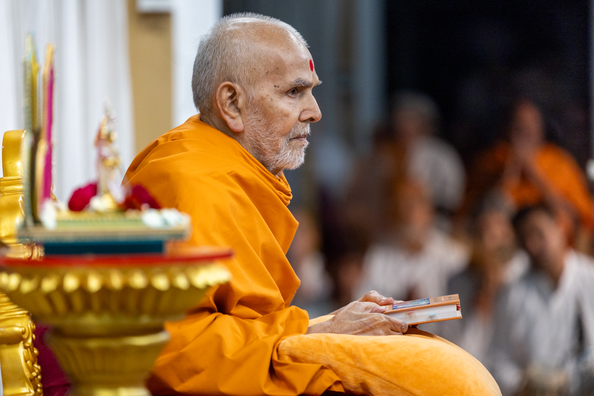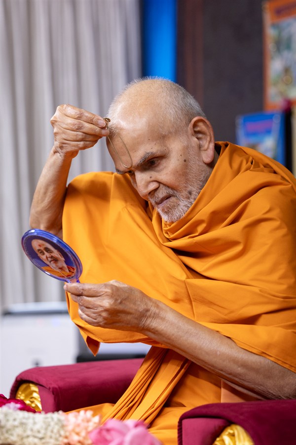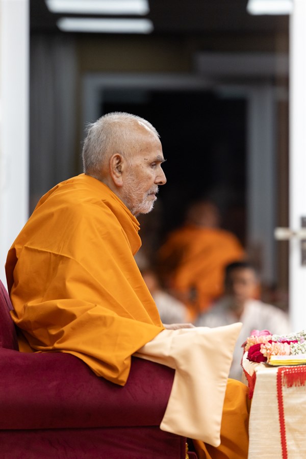 Param Pujya Mahant Swami Maharaj arrives to perform his daily puja