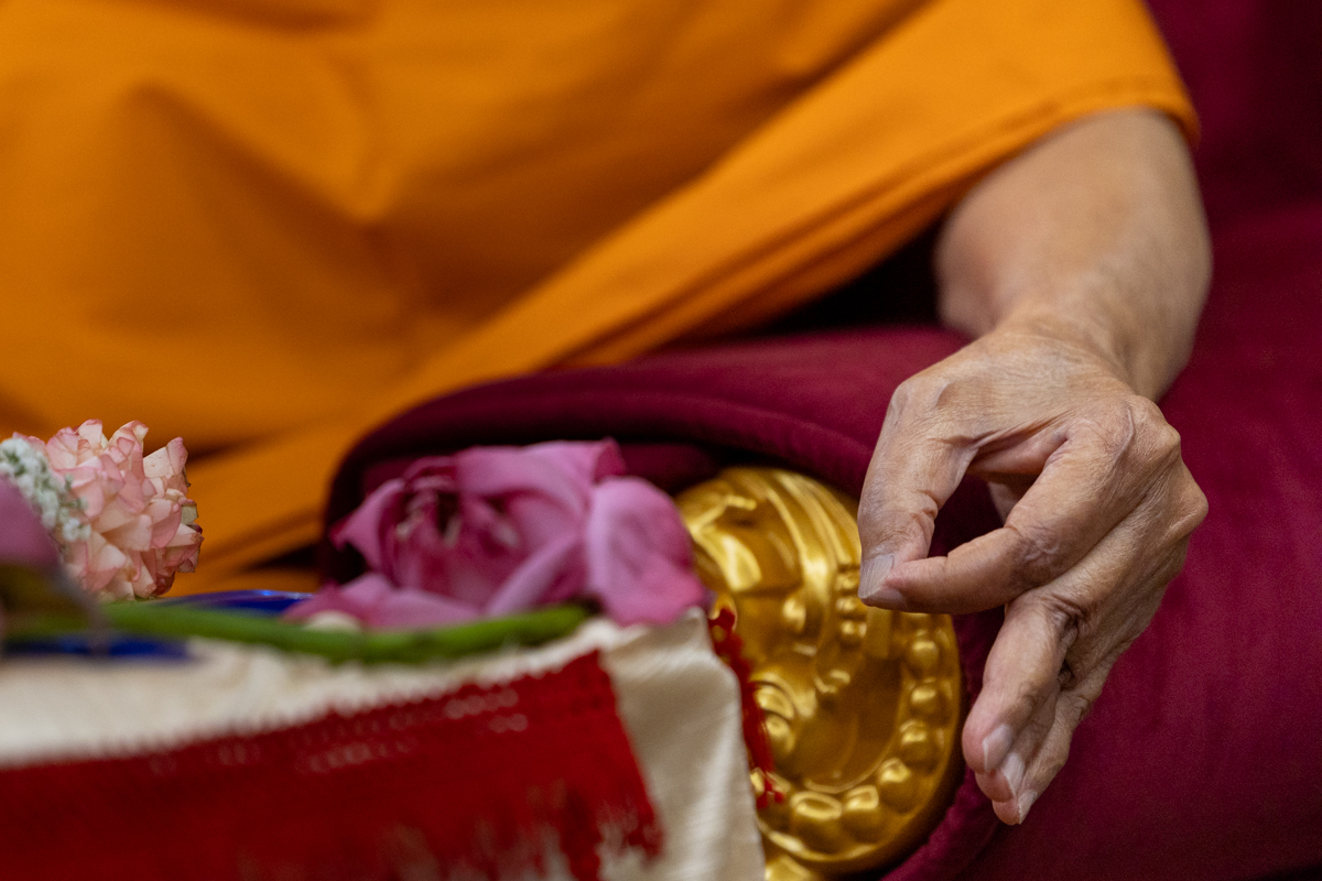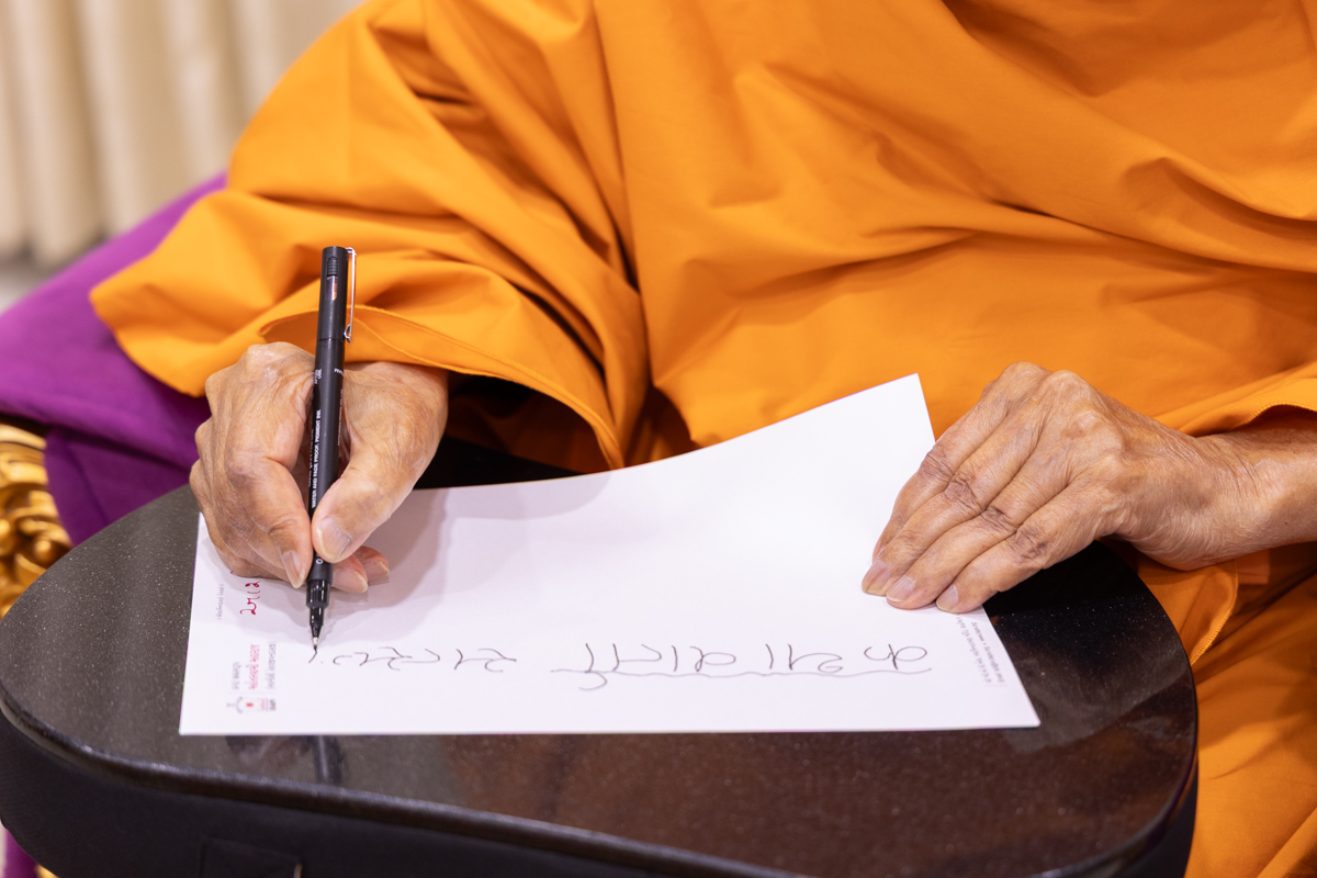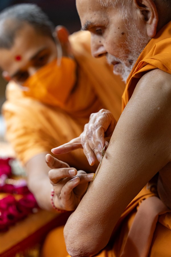 Swamishri sanctifies water with the holy relics of Bhagwan Swaminarayan and the Guru Parampara