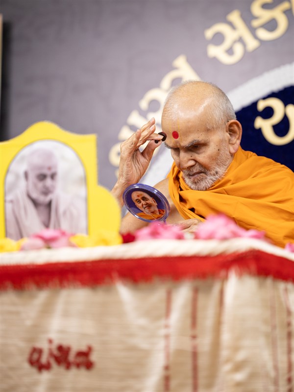 Swamishri engrossed in darshan of Bhagwan Swaminarayan, Aksharbrahma Gunatitanand Swami and Shri Gopalanand Swami
