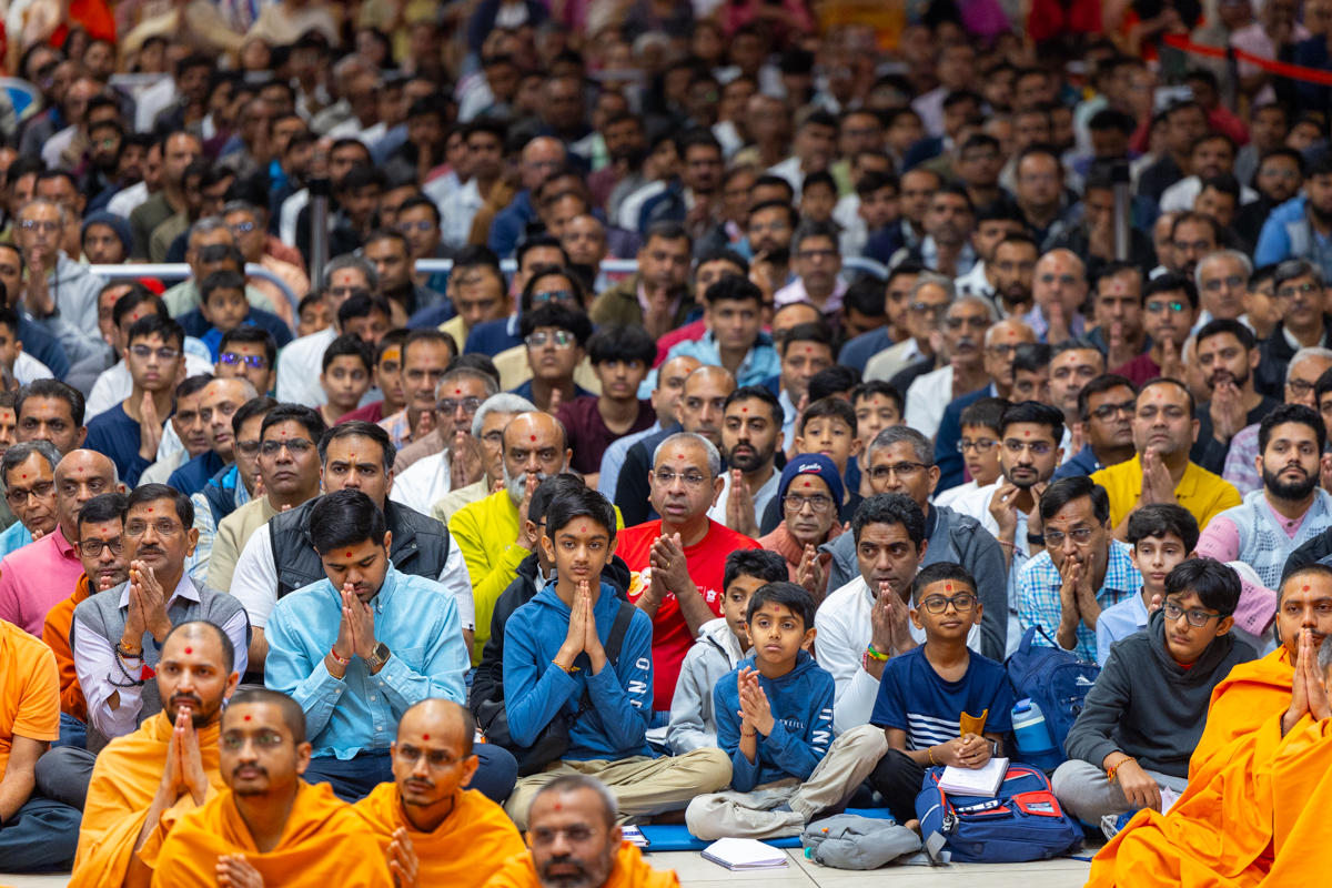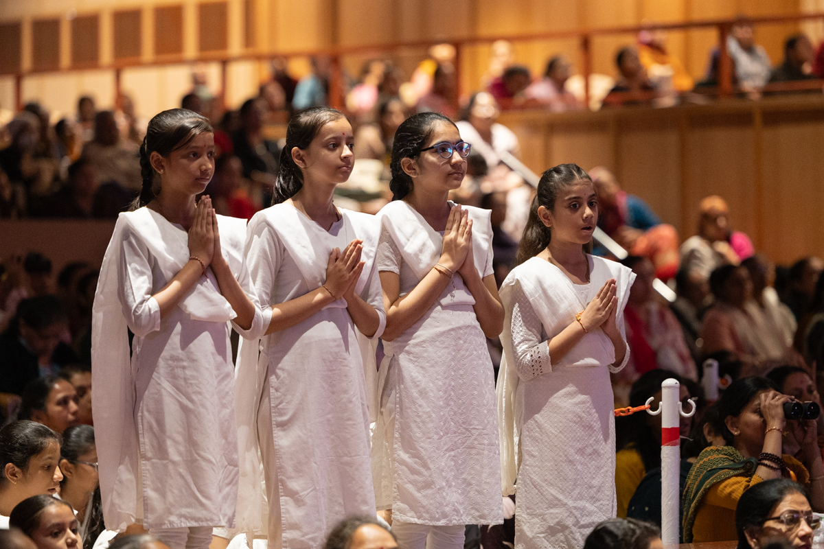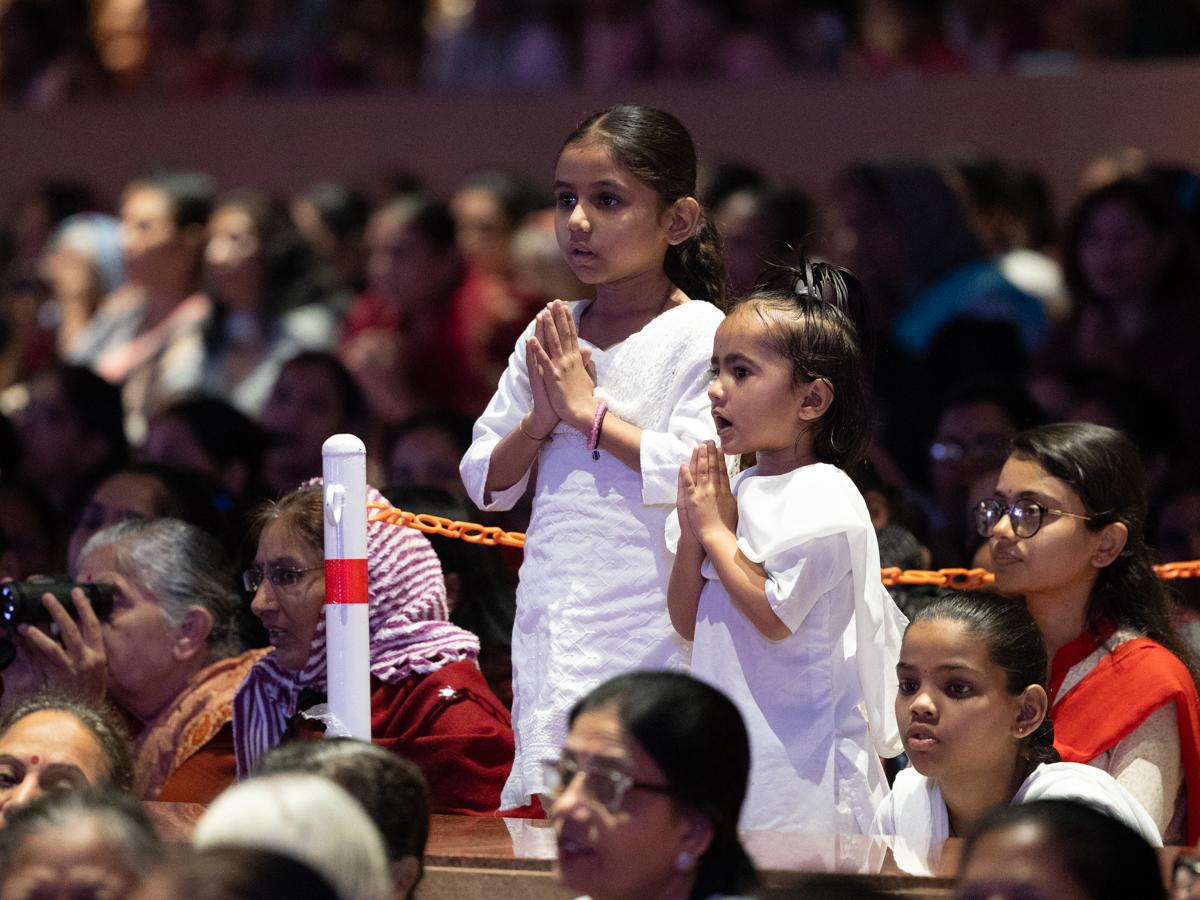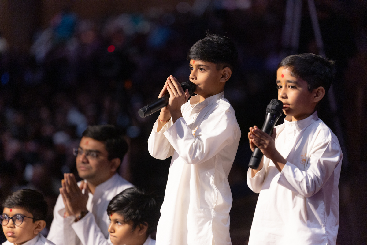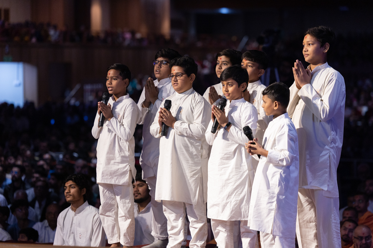 Balaks lead everyone in reciting the sadhana mantra and daily prayer in Swamishri's puja