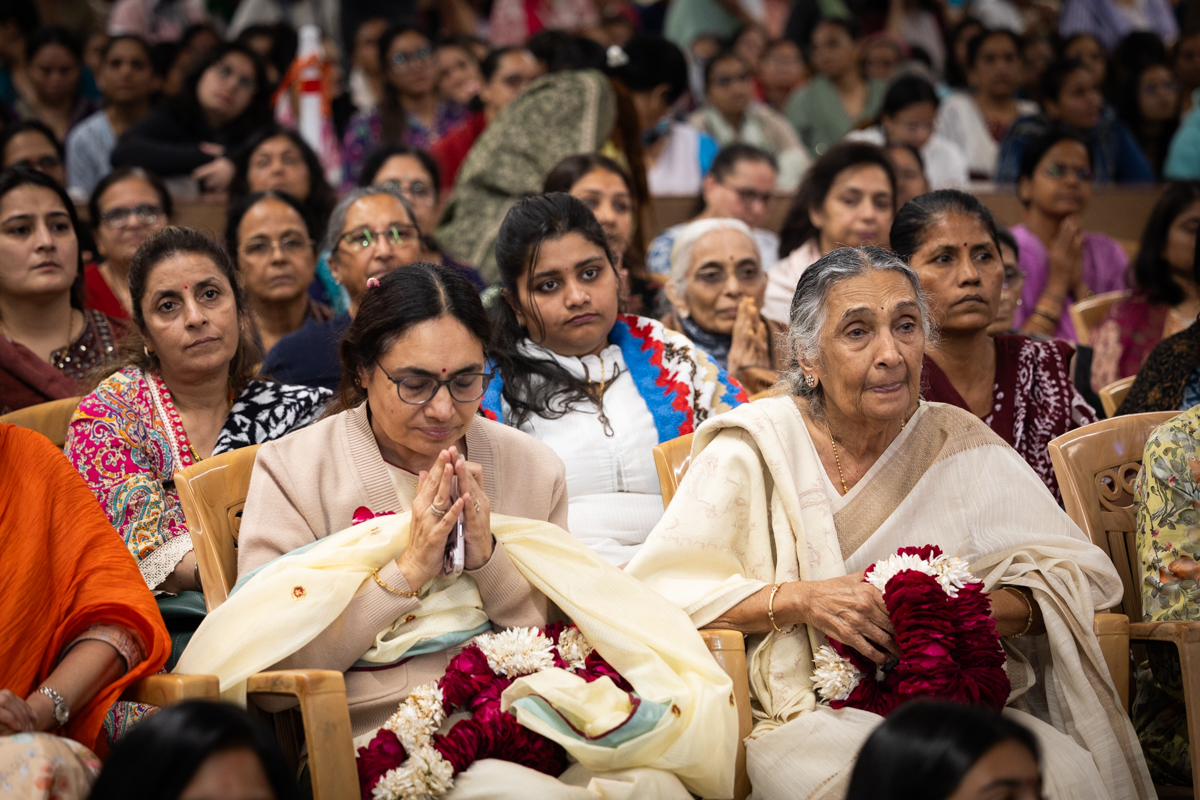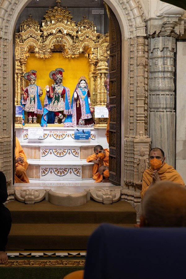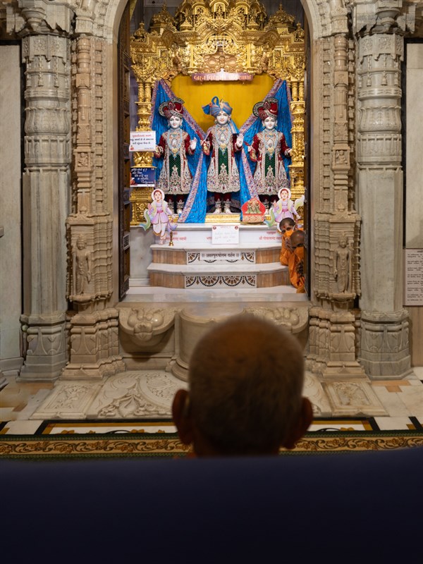 Swamishri engrossed in darshan of Shri Harikrishna Maharaj, Bhagwan Shri Krishna and Shri Radhaji