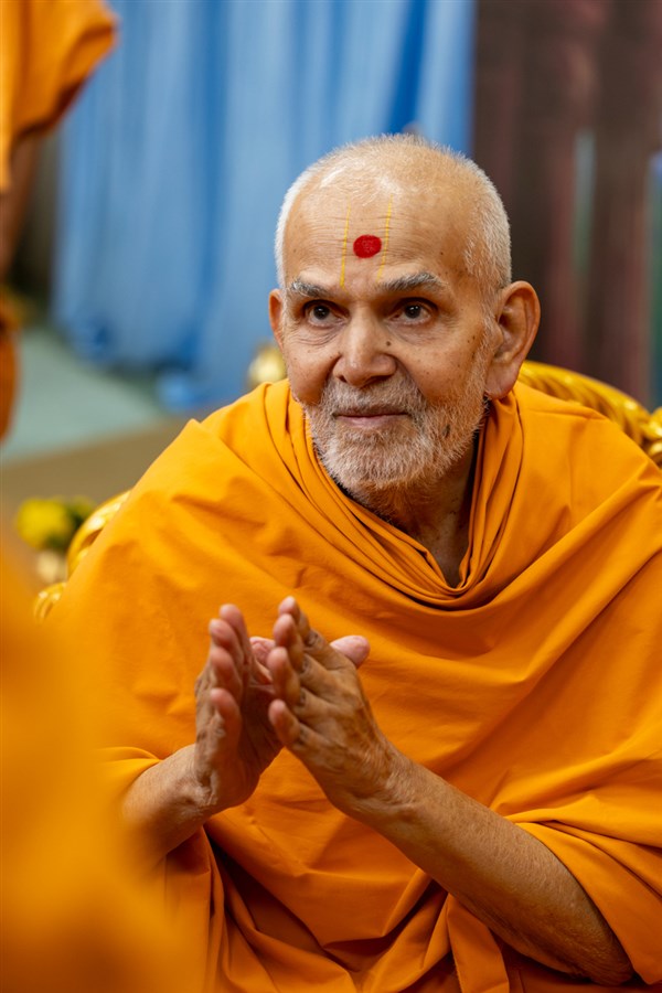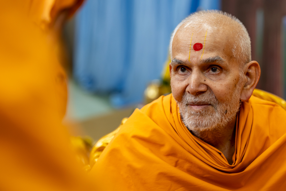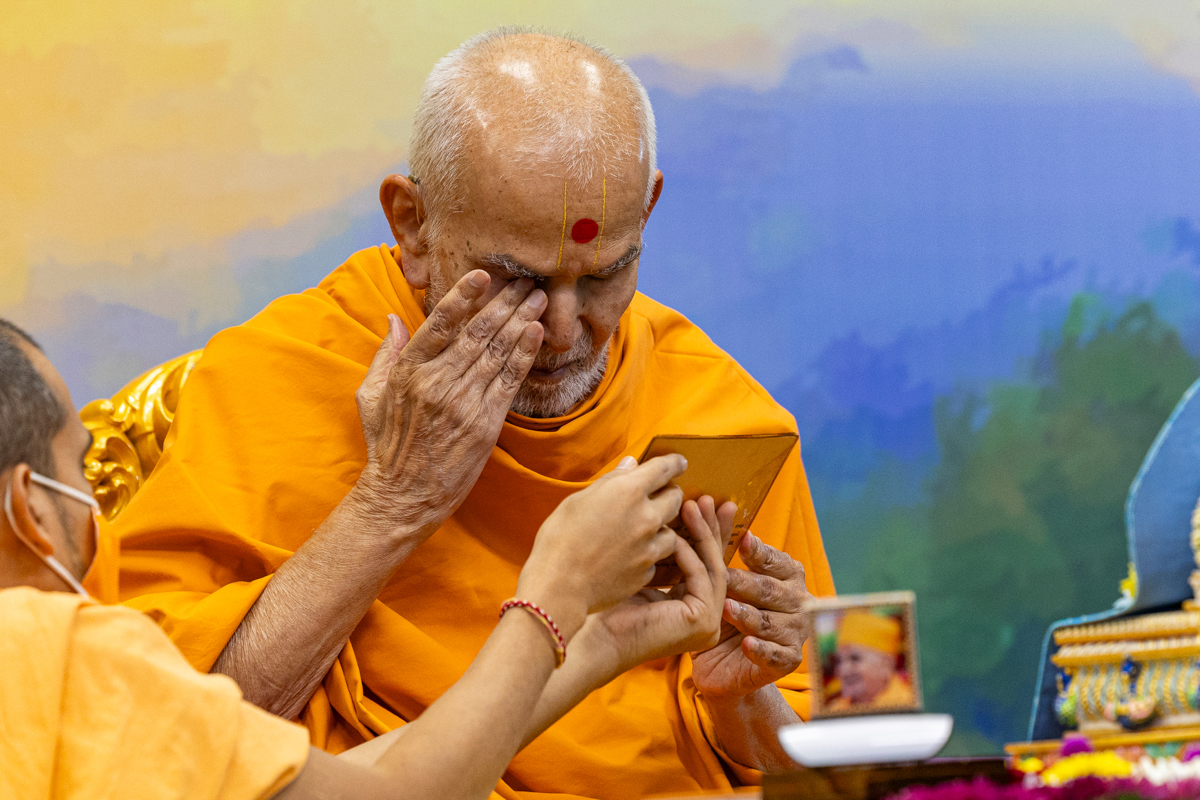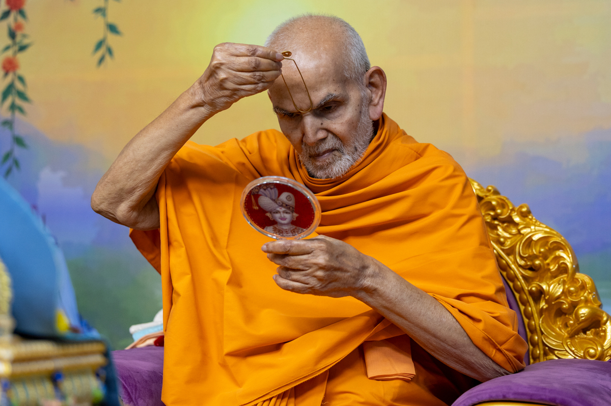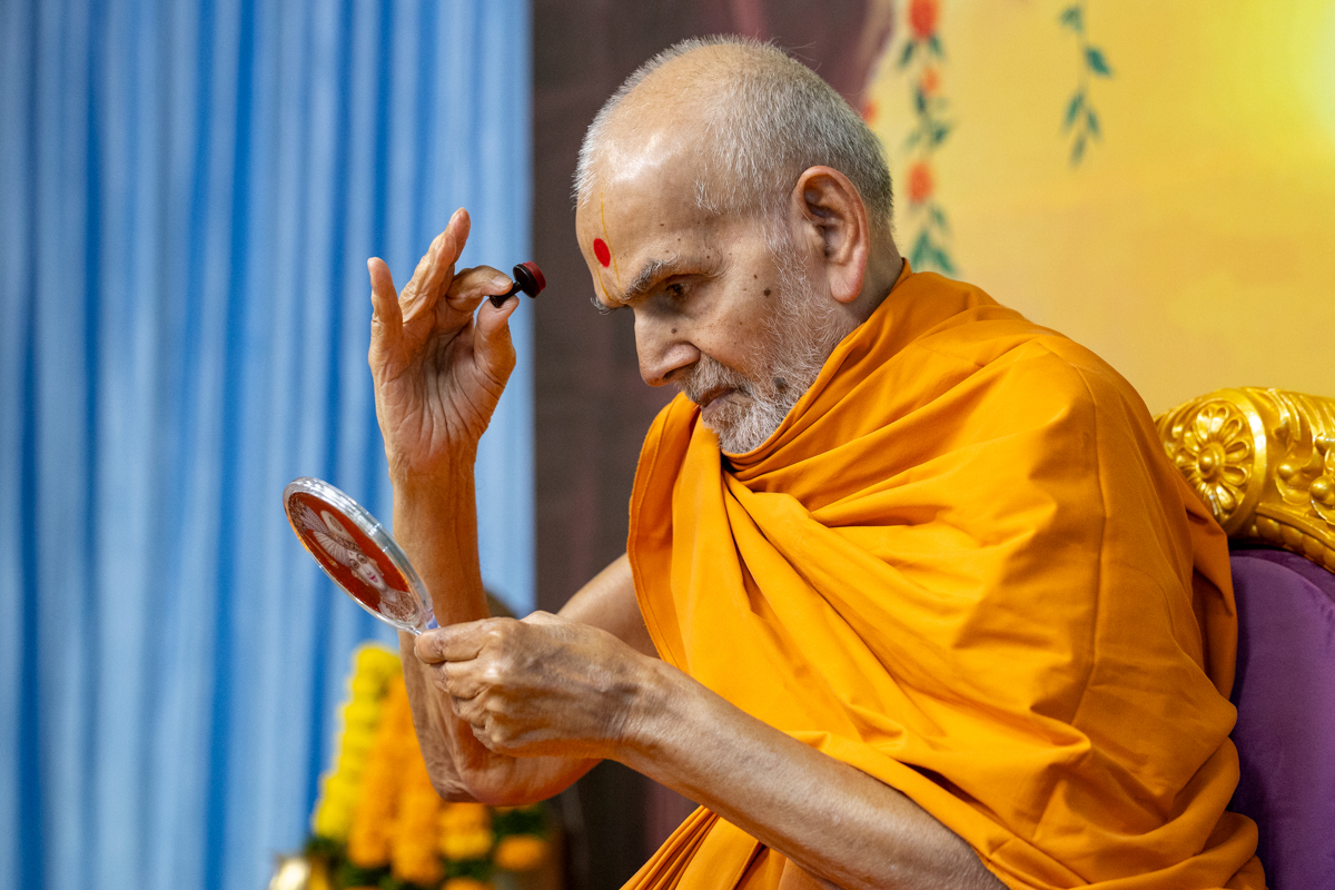 Param Pujya Mahant Swami Maharaj applies a tilak on his forehead