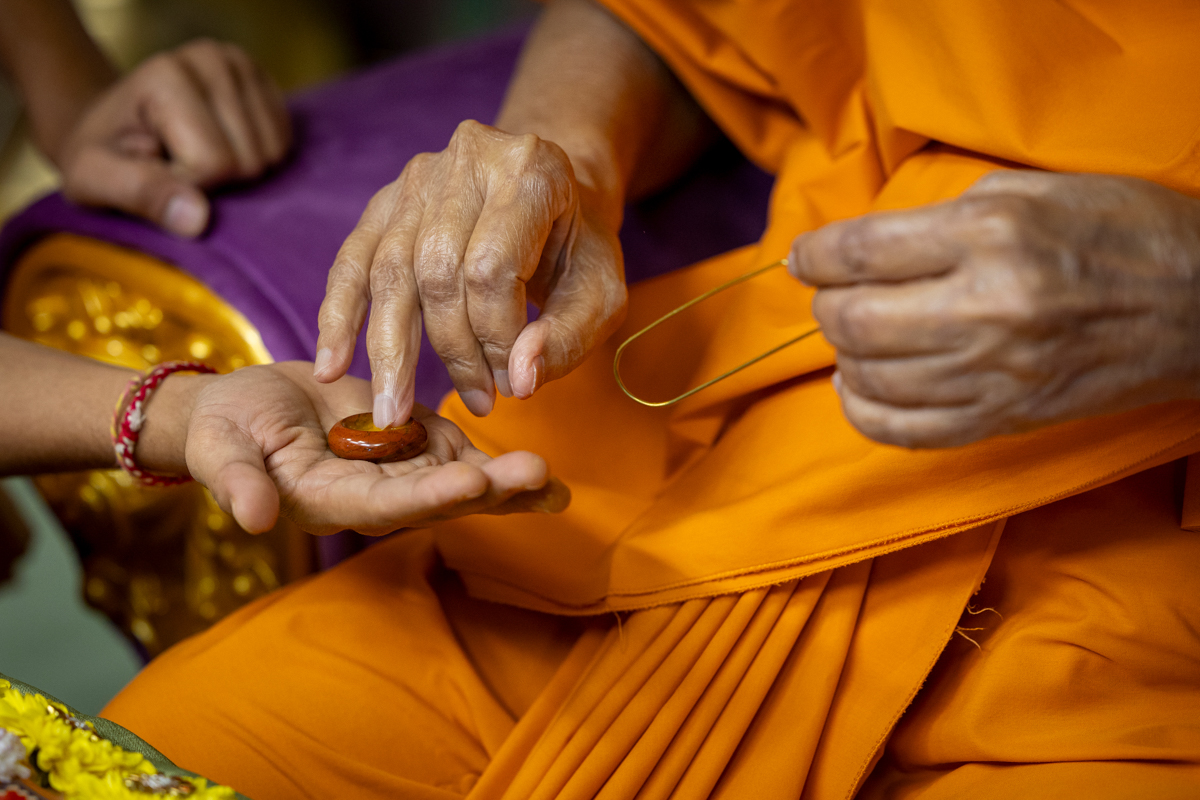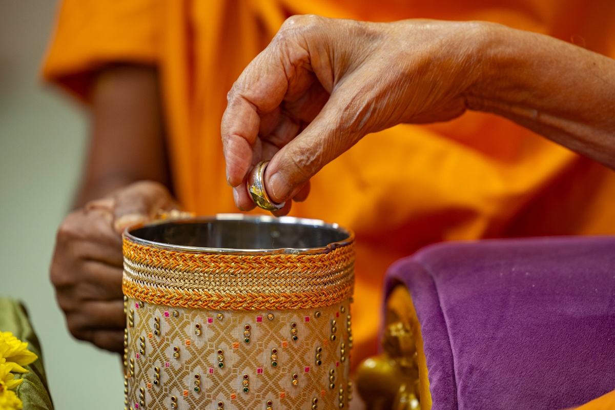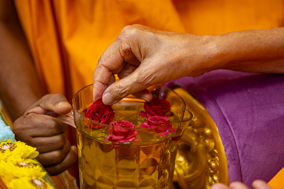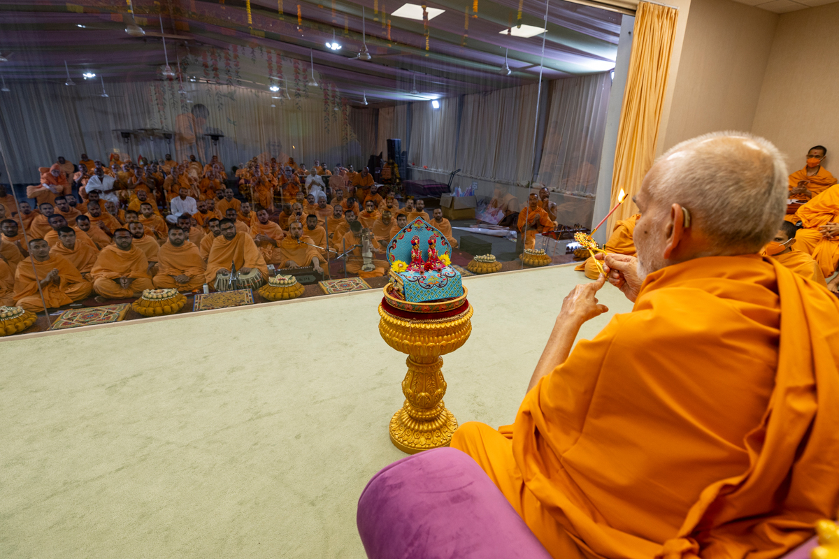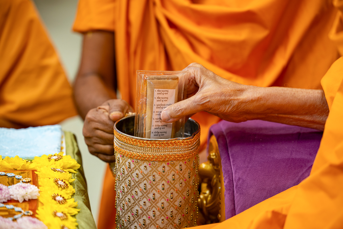 Swamishri sanctifies water with the holy relics of Bhagwan Swaminarayan and the Guru Parampara
