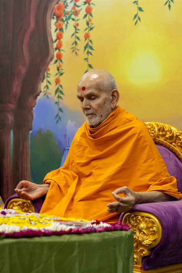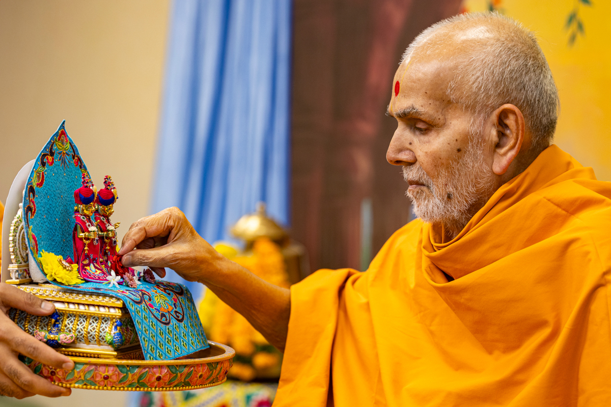 Swamishri places a flower at the feet of Shri Harikrishna Maharaj and Shri Gunatitanand Swami Maharaj