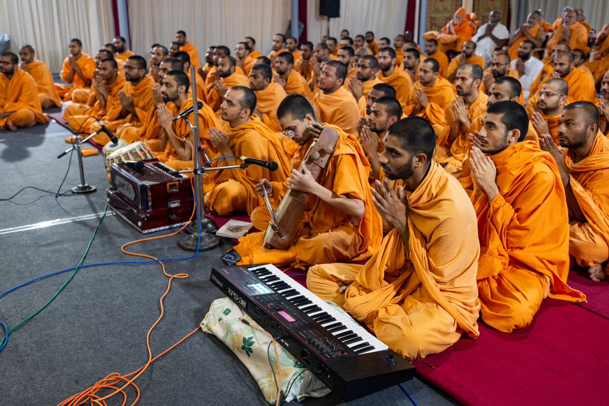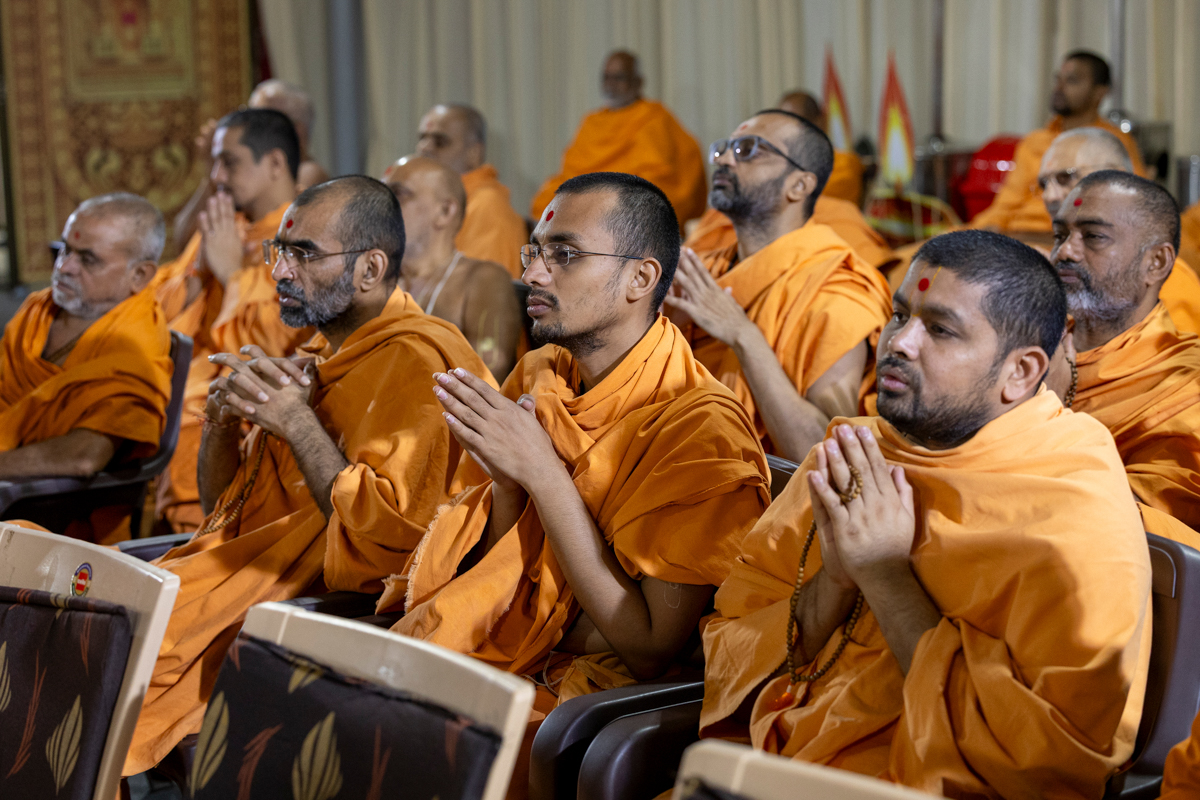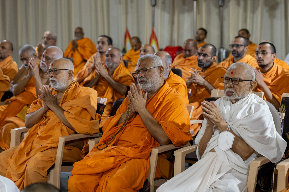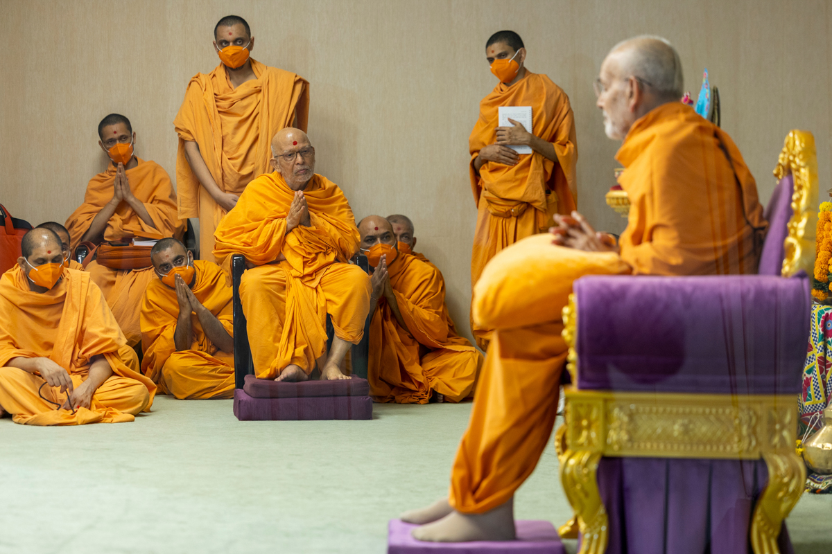 Pujya Ghanshyamcharan Swami and swamis doing darshan of Swamishri
