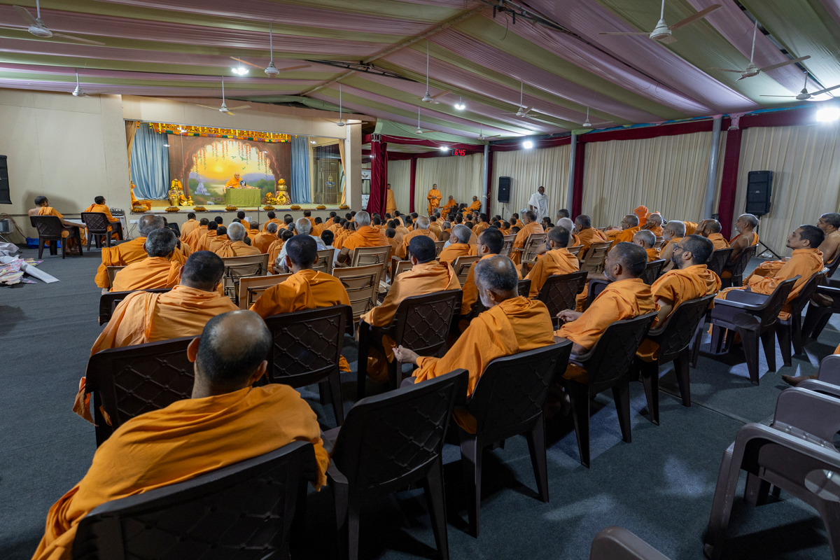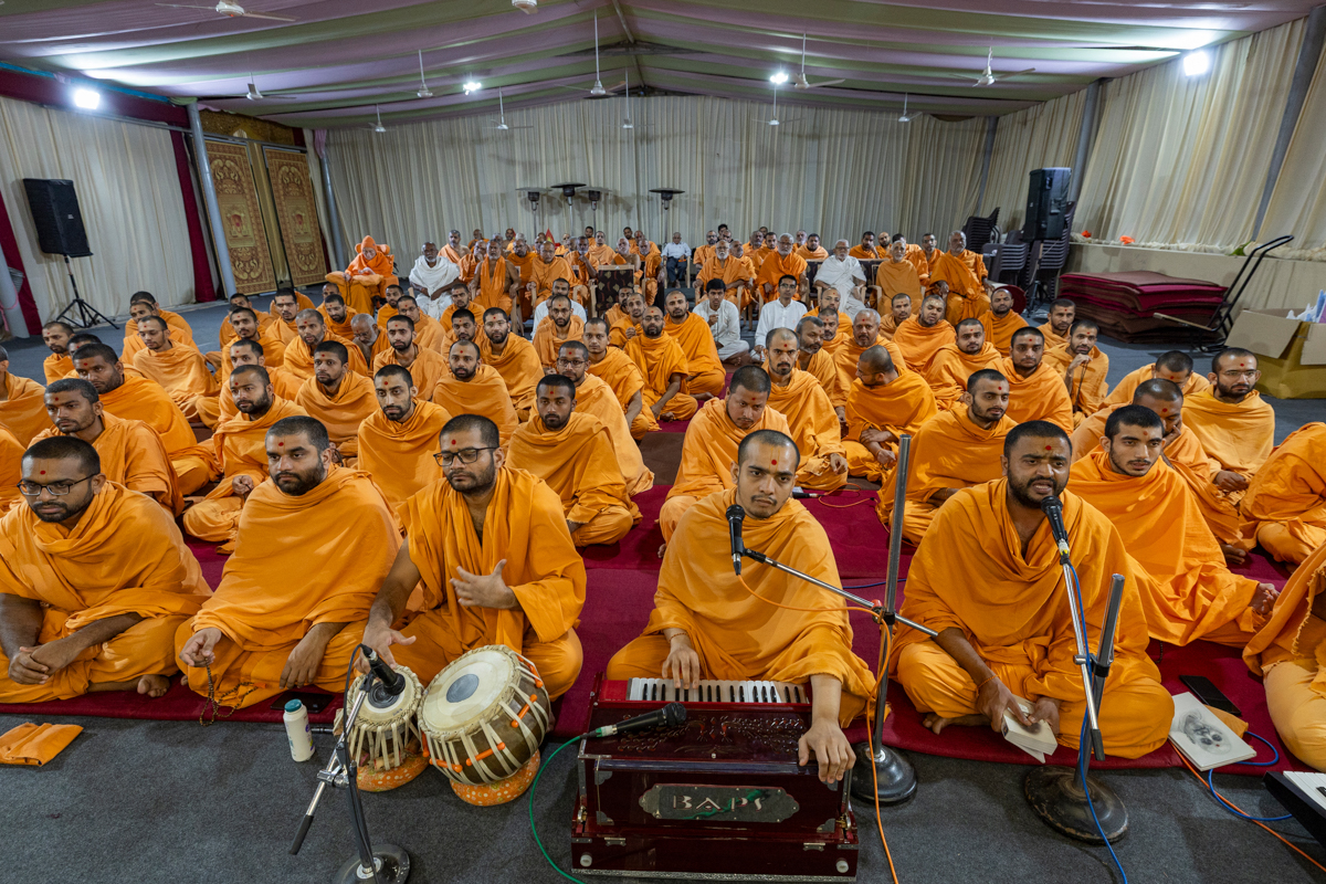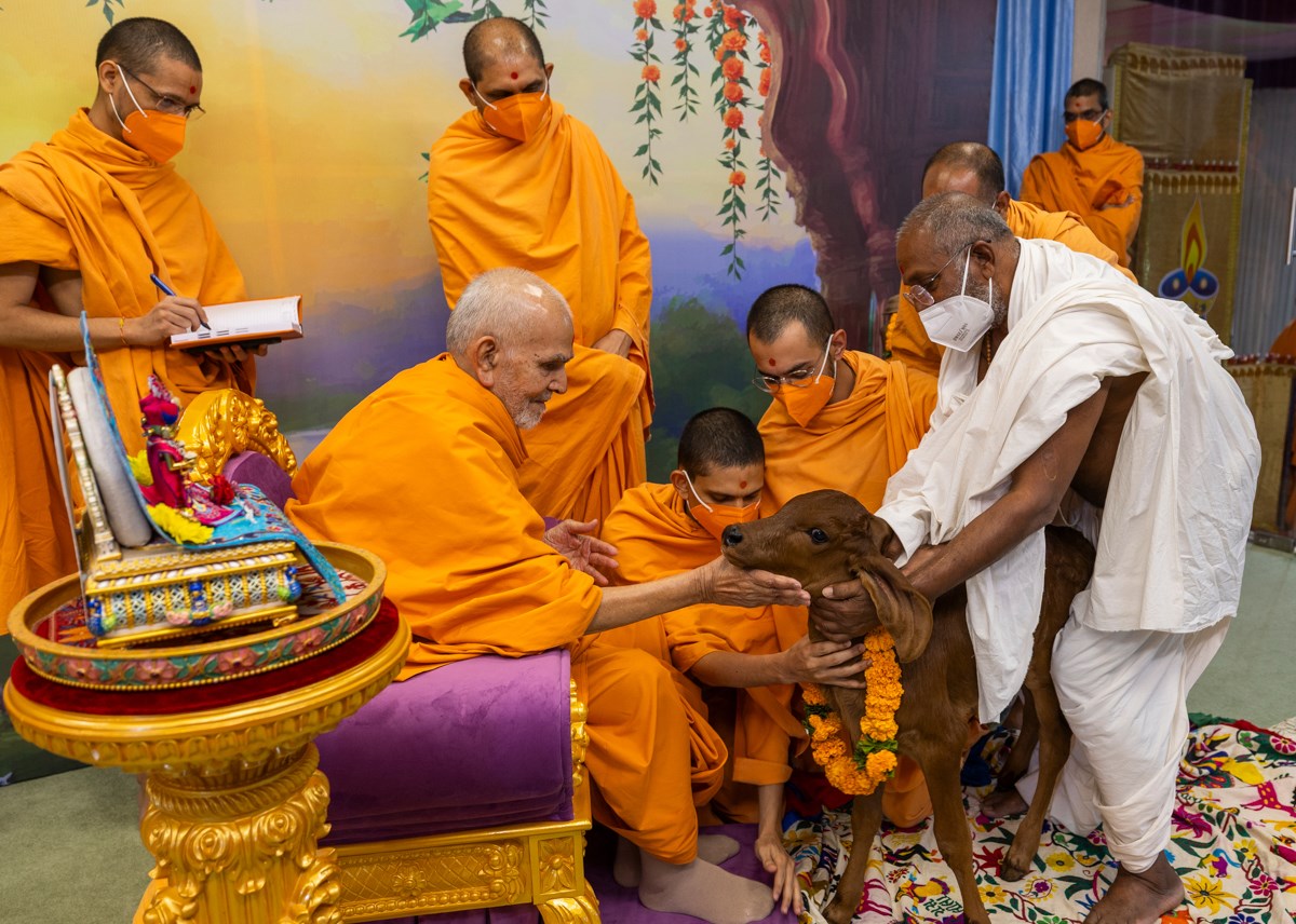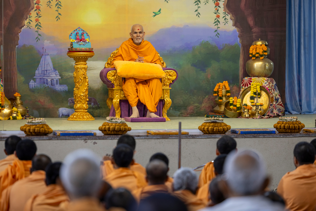 Pujya Ghanshyamcharan Swami and swamis doing darshan of Swamishri