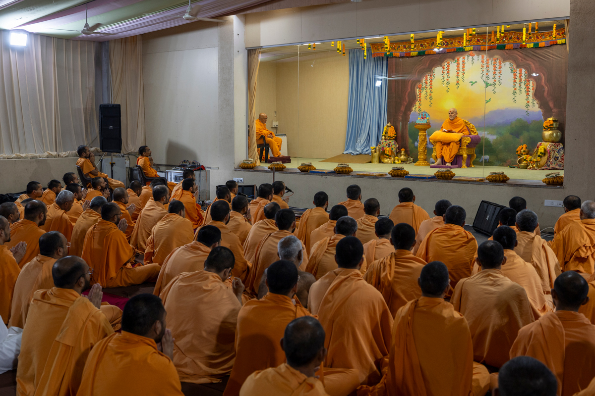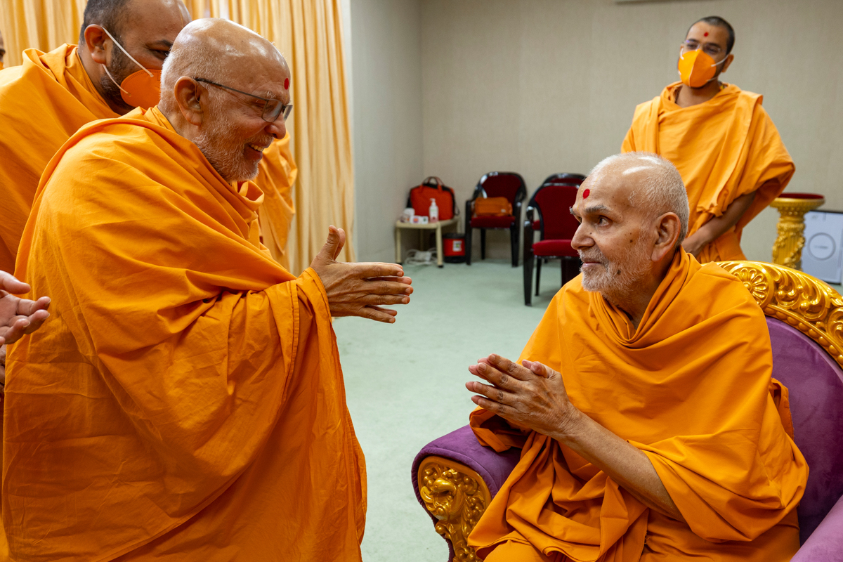 Swamishri interacts with Pujya Ghanshyamcharan Swami