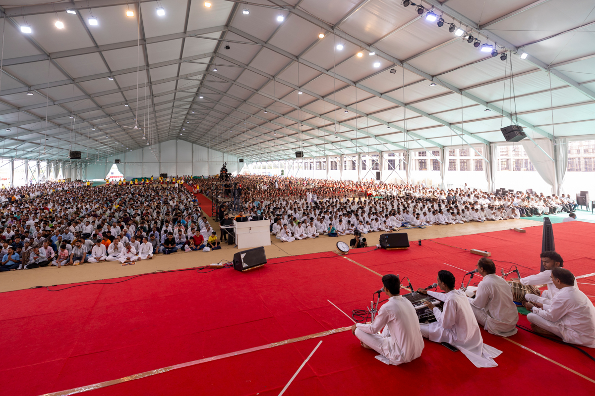 Youths sing kirtans at the beginning of the evening satsang assembly