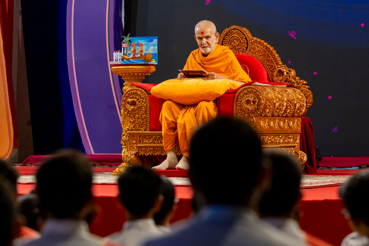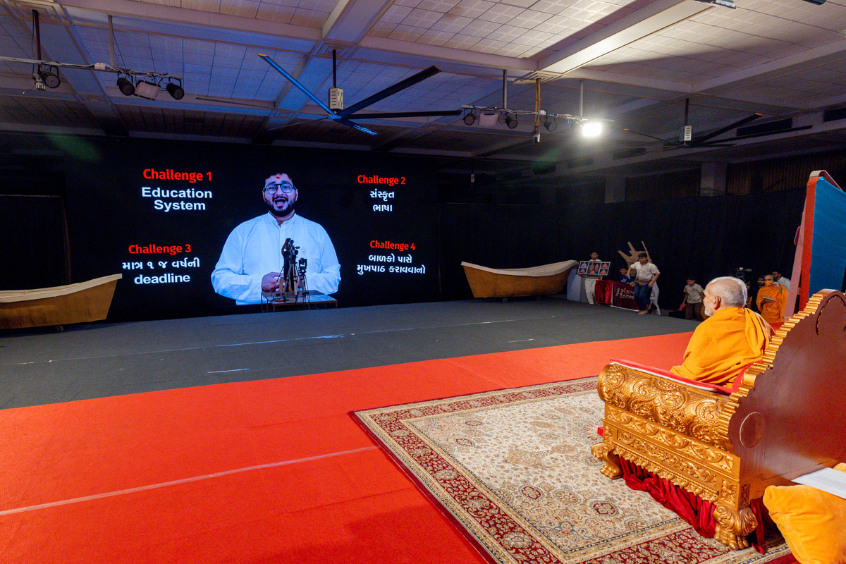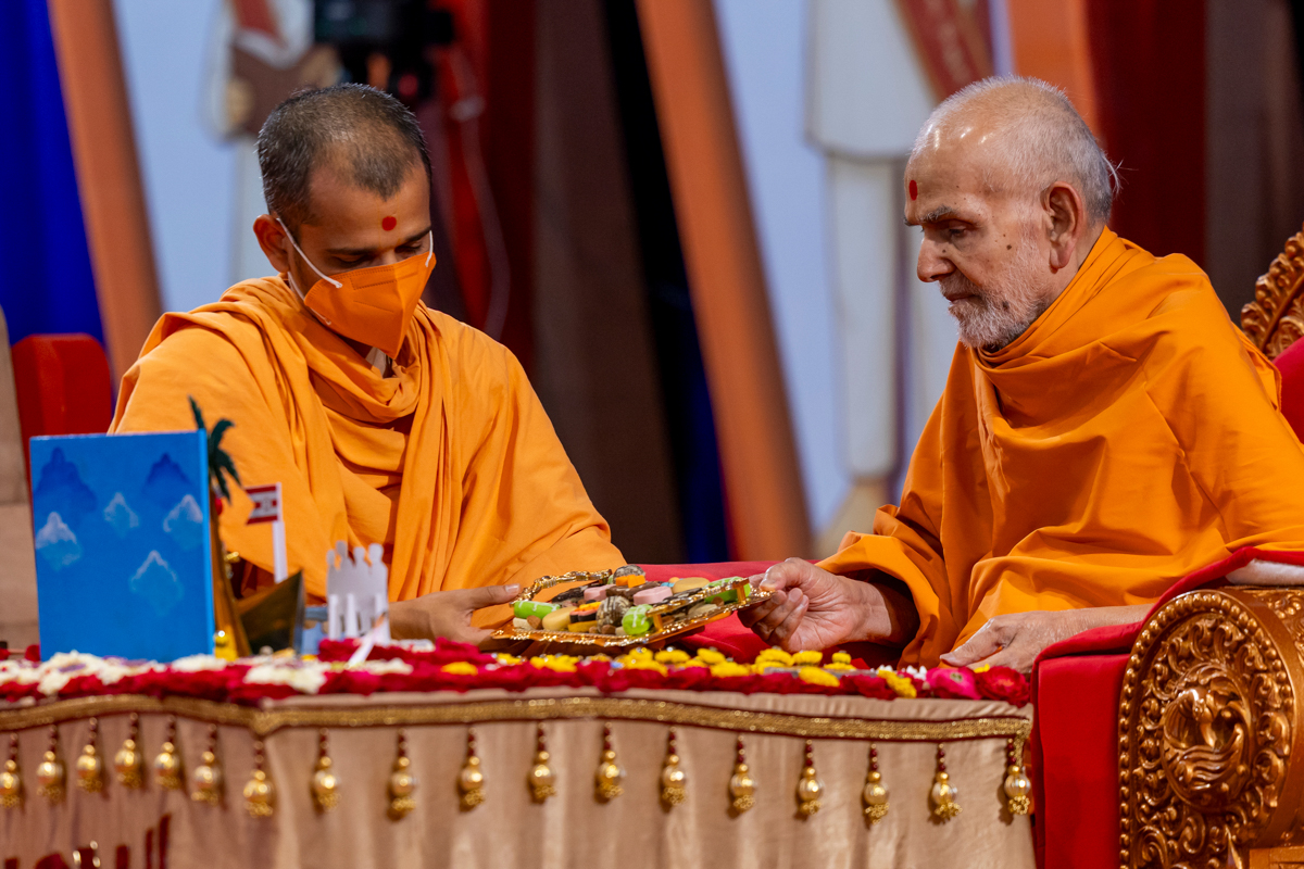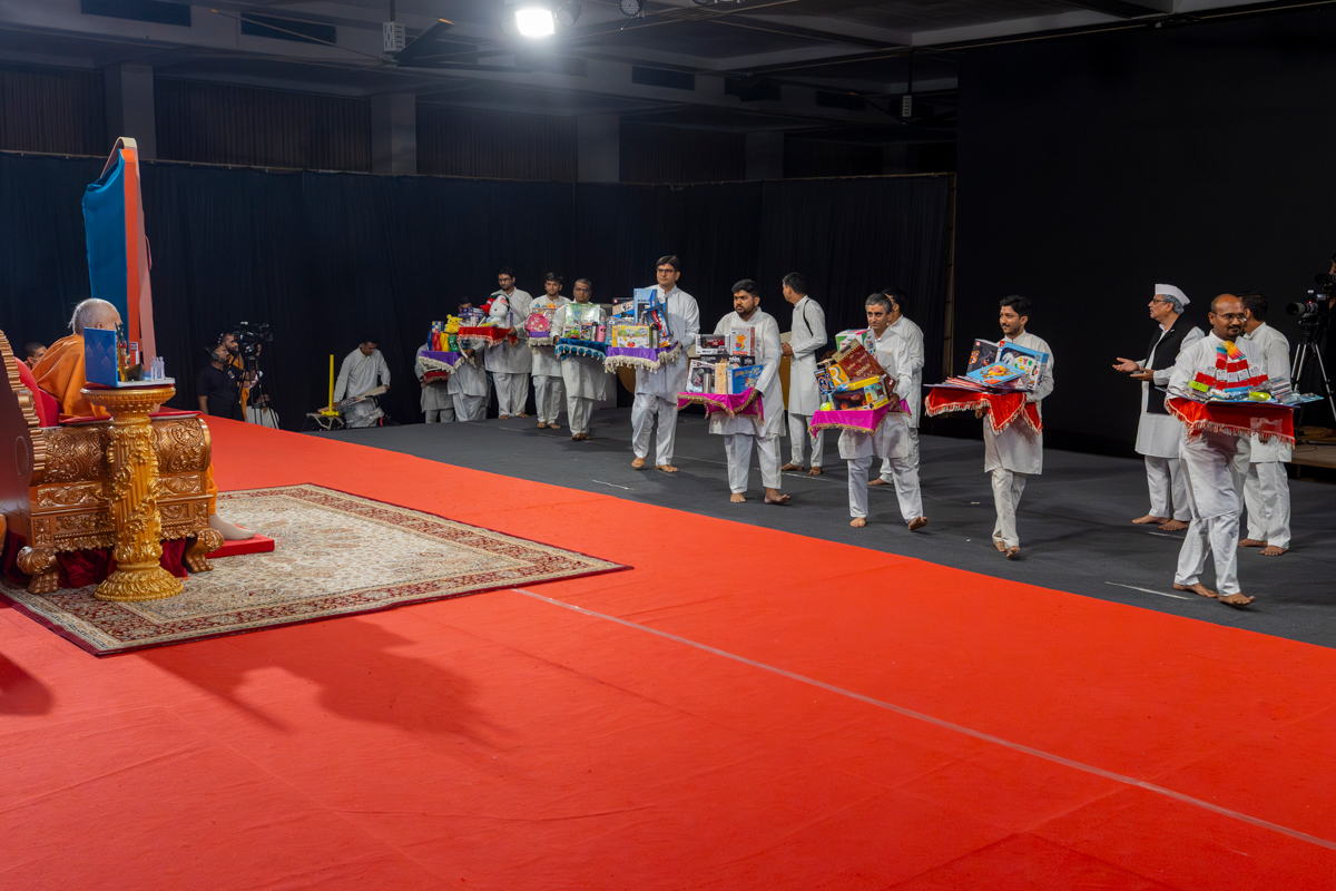 Karyakars display gift items to Swamishri that are given to balaks and balikas during the Mission Rajipo project