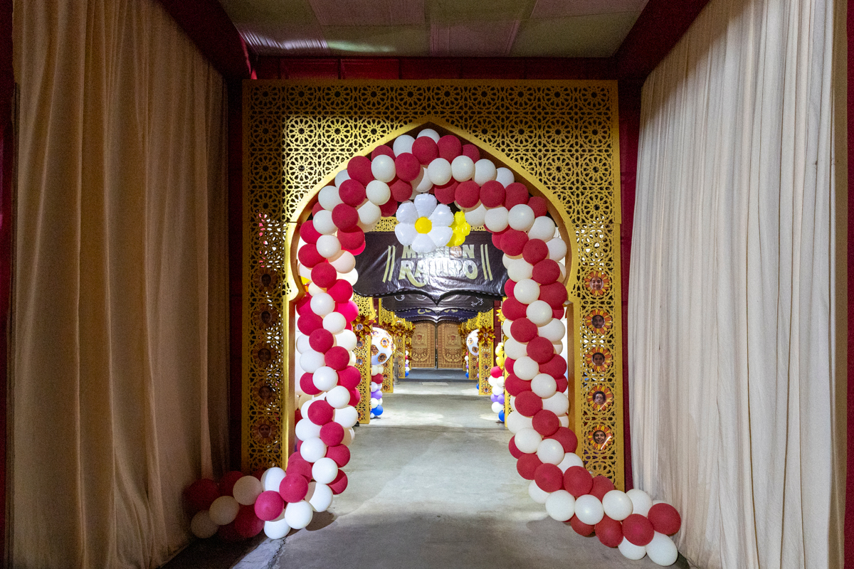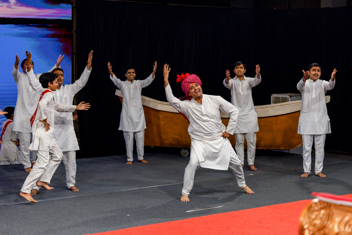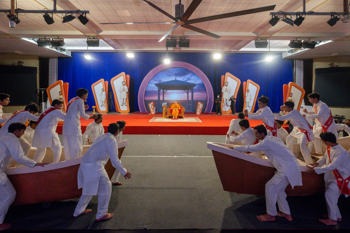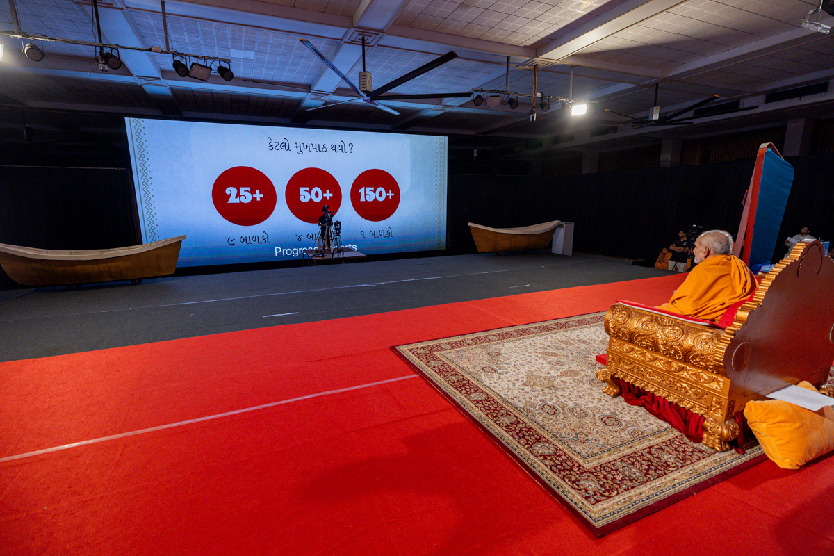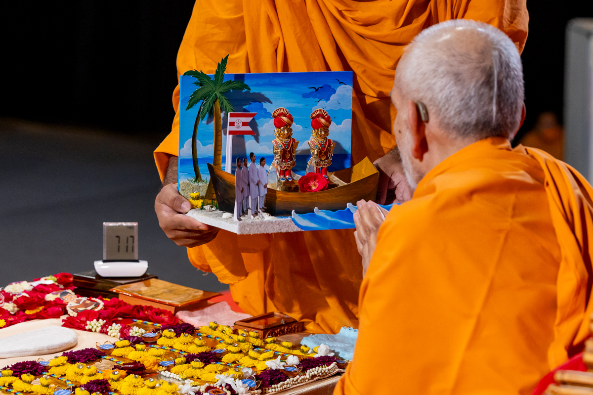 Karyakars display gift items to Swamishri that are given to balaks and balikas during the Mission Rajipo project