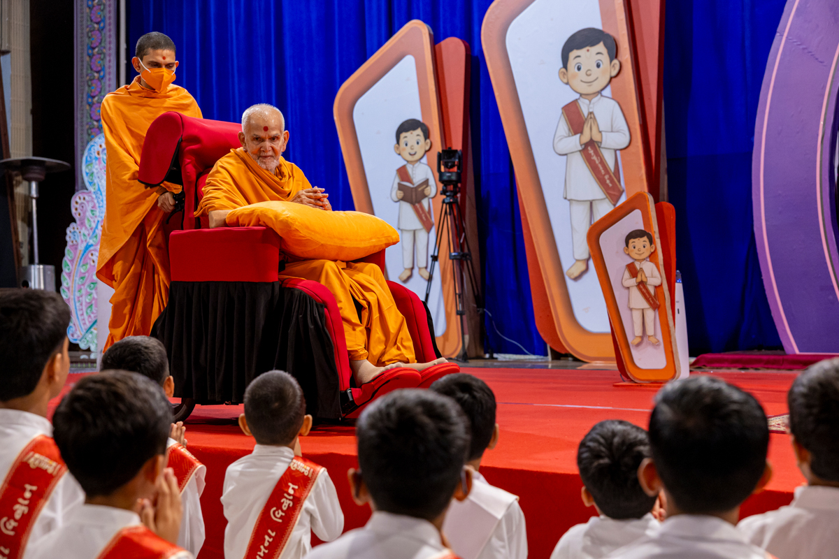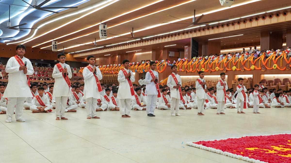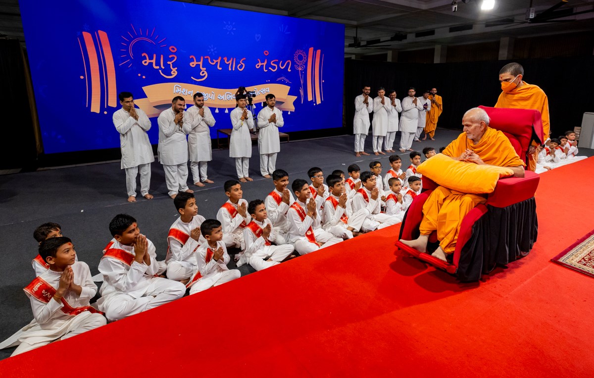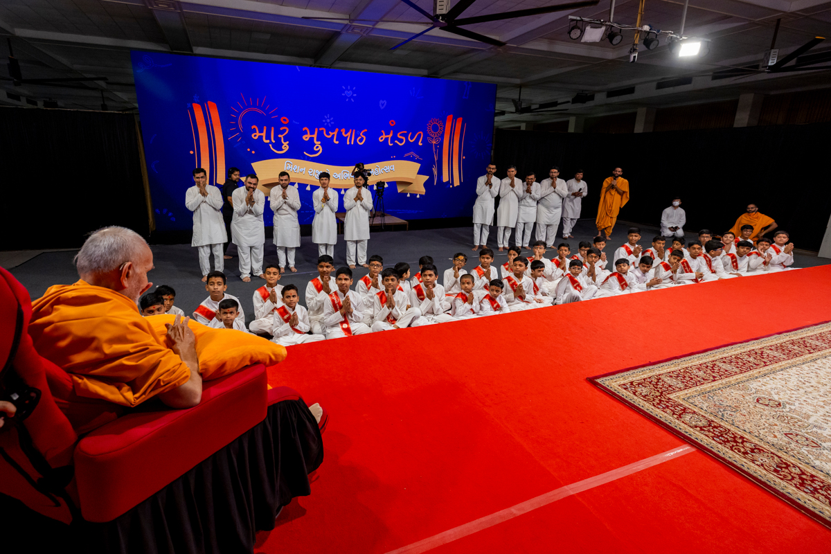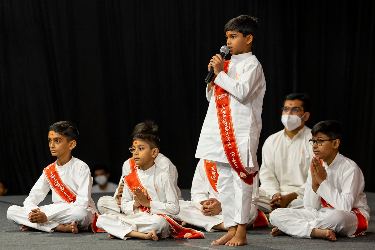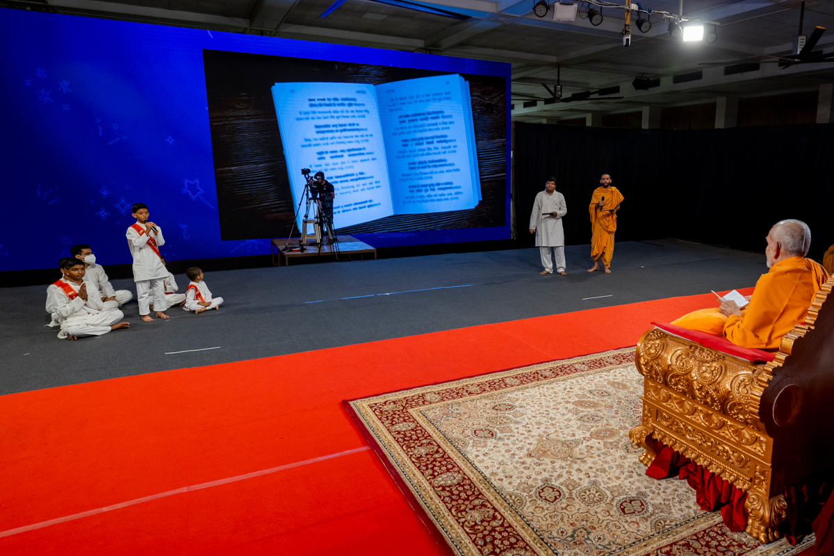 Balaks lead everyone in reciting the sadhana mantra and daily prayer in Swamishri's puja