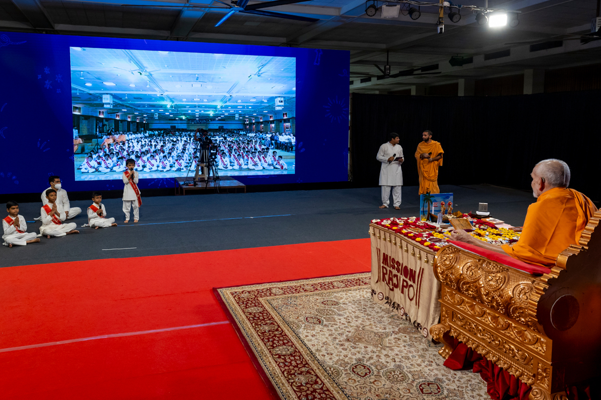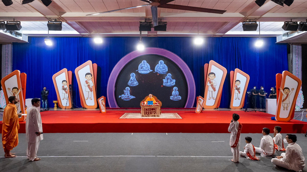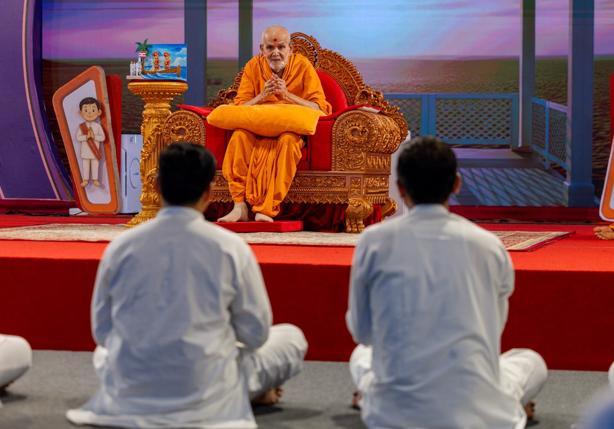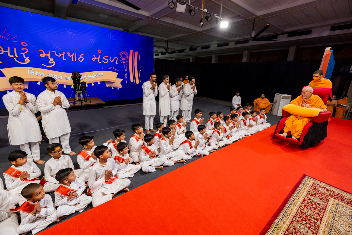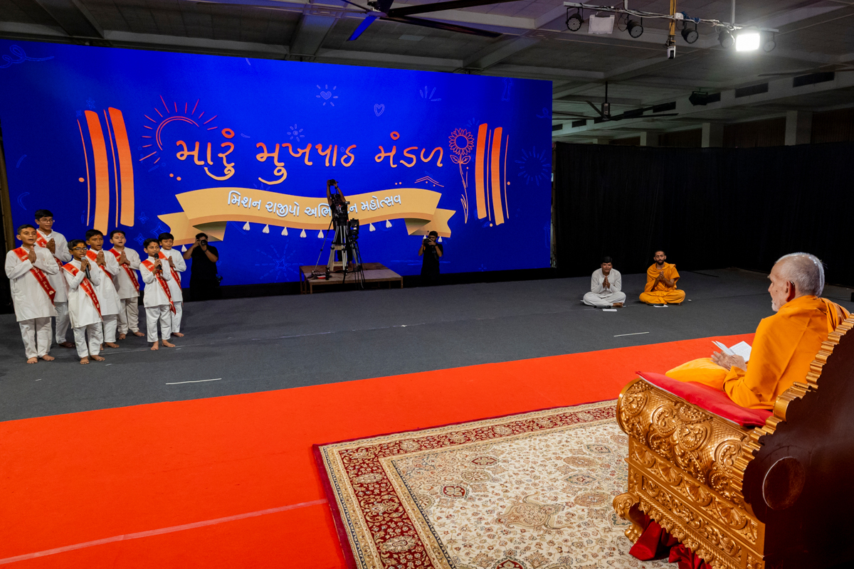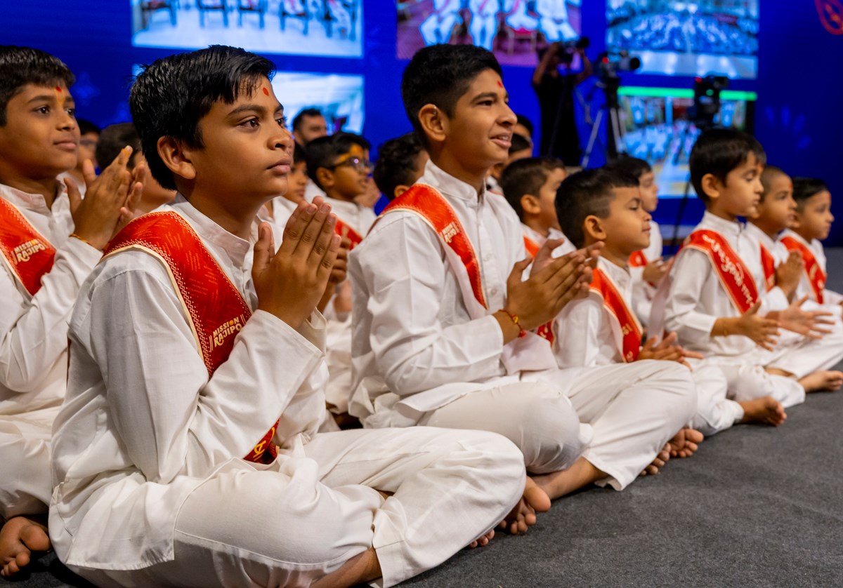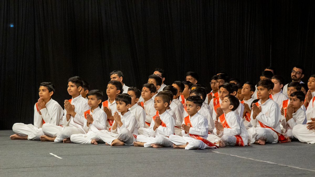 Balaks lead everyone in reciting the sadhana mantra and daily prayer in Swamishri's puja