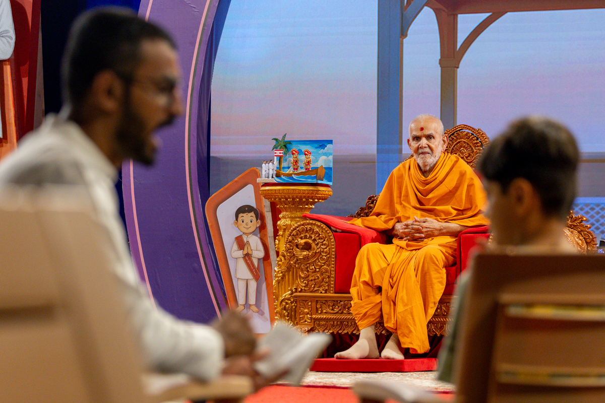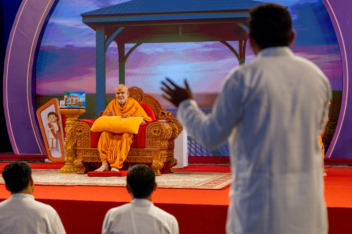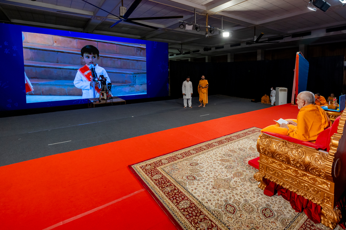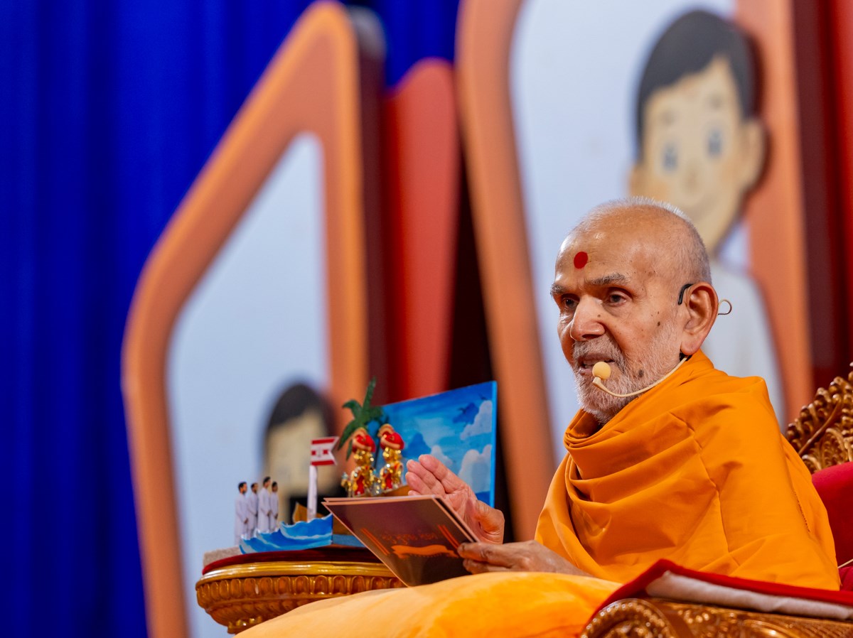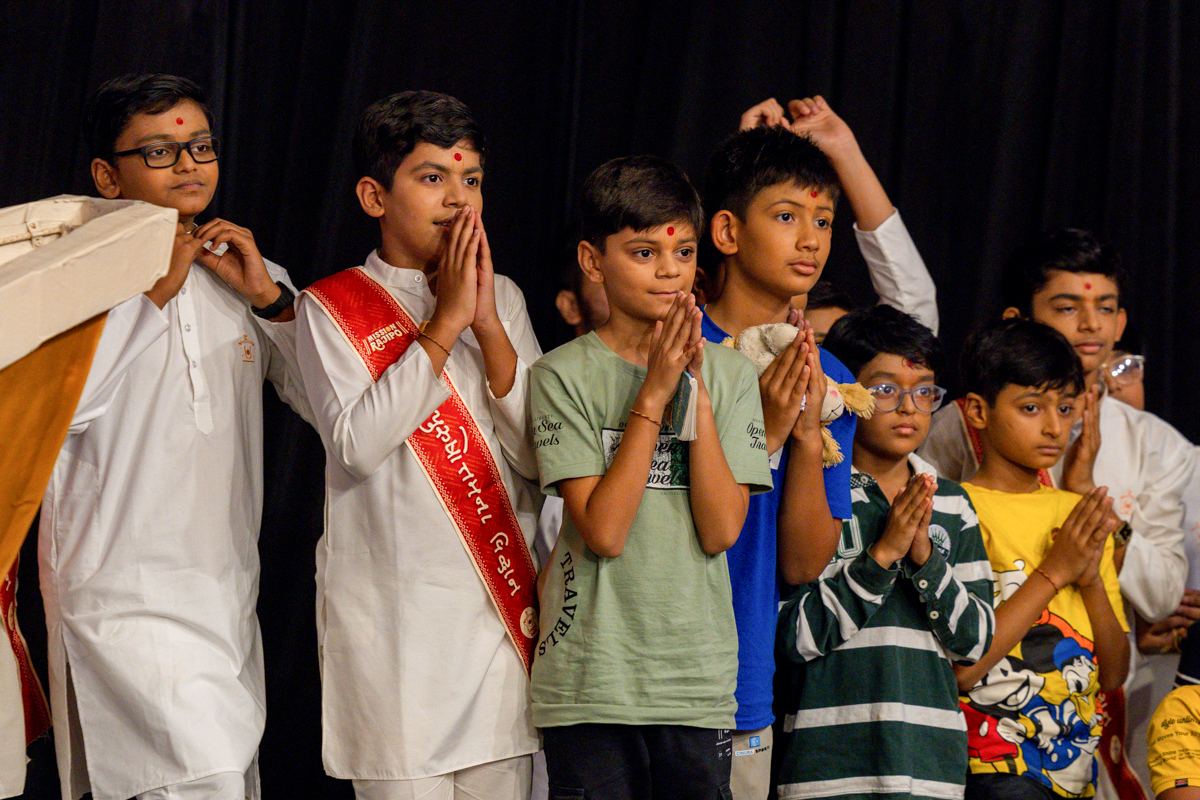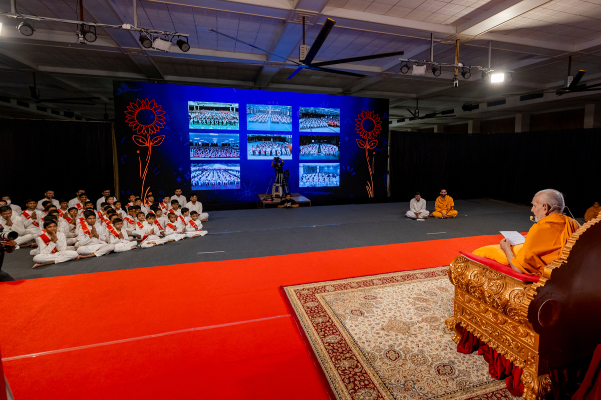 Balaks lead everyone in reciting the sadhana mantra and daily prayer in Swamishri's puja