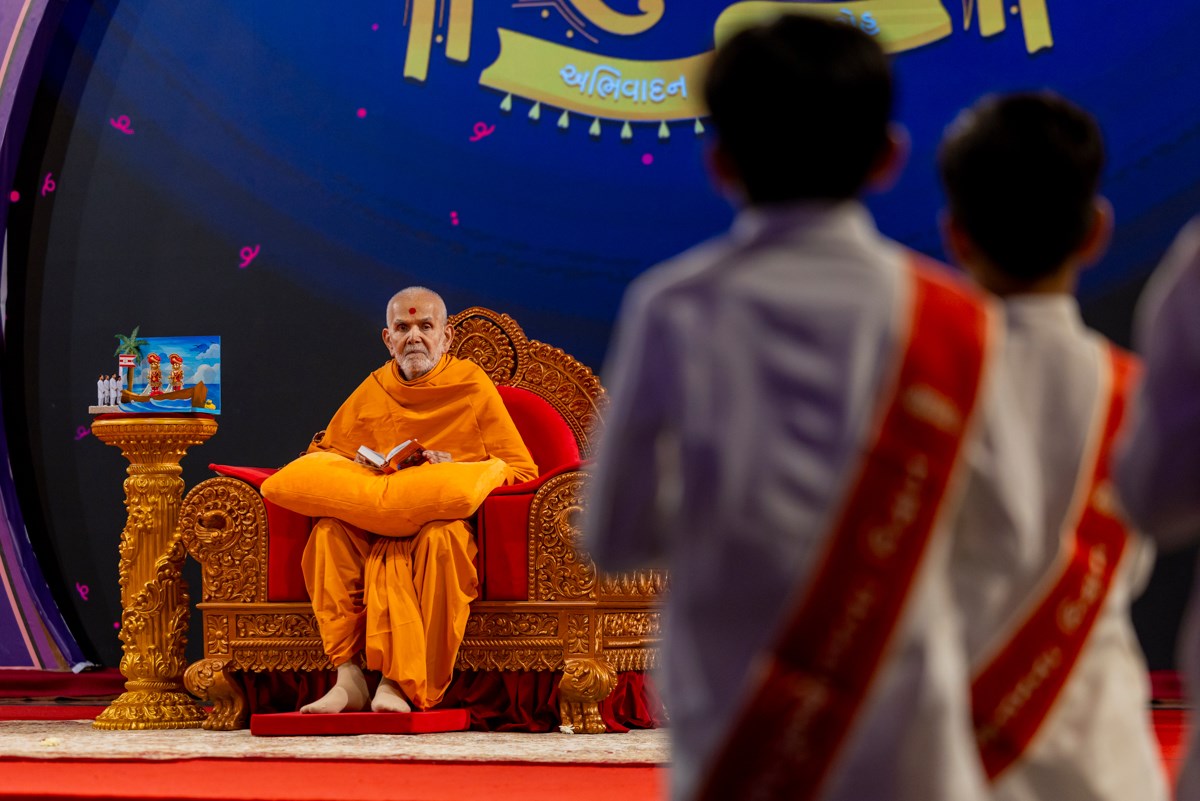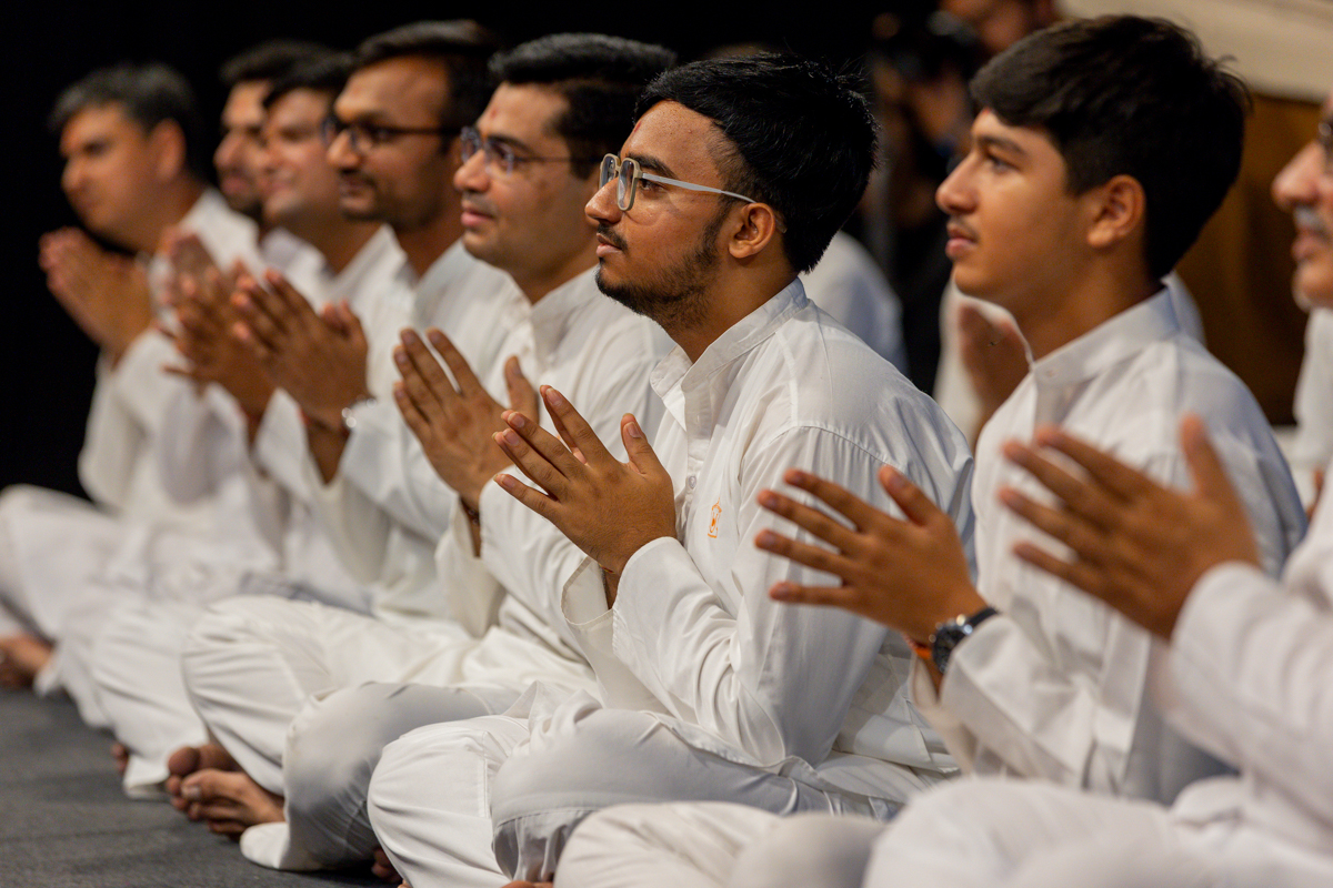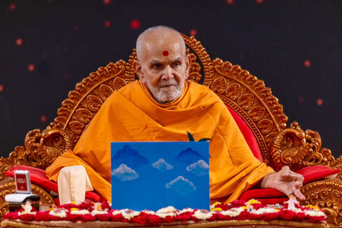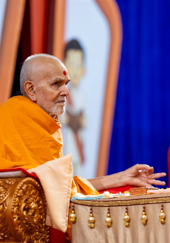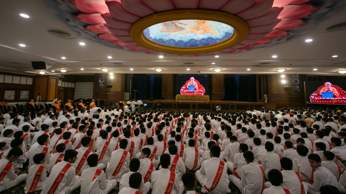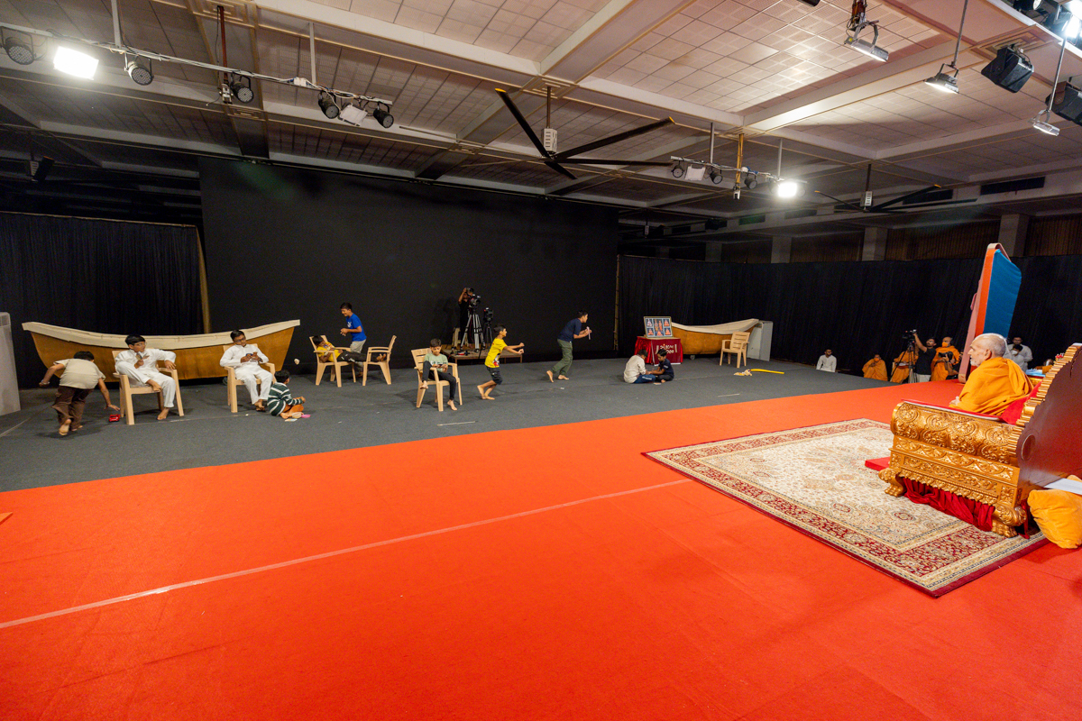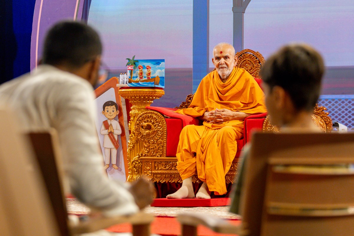 Balaks lead everyone in reciting the sadhana mantra and daily prayer in Swamishri's puja