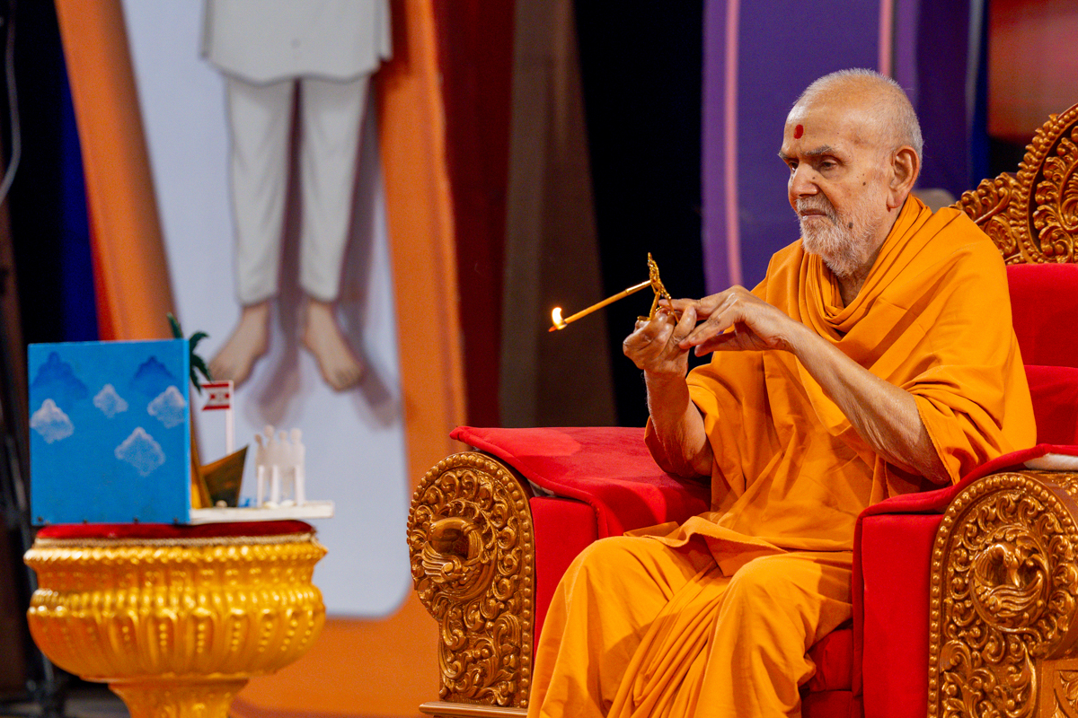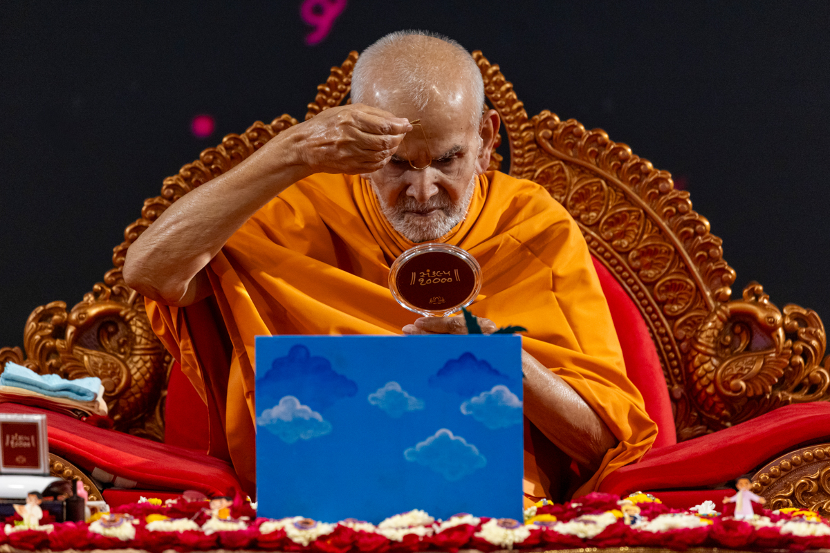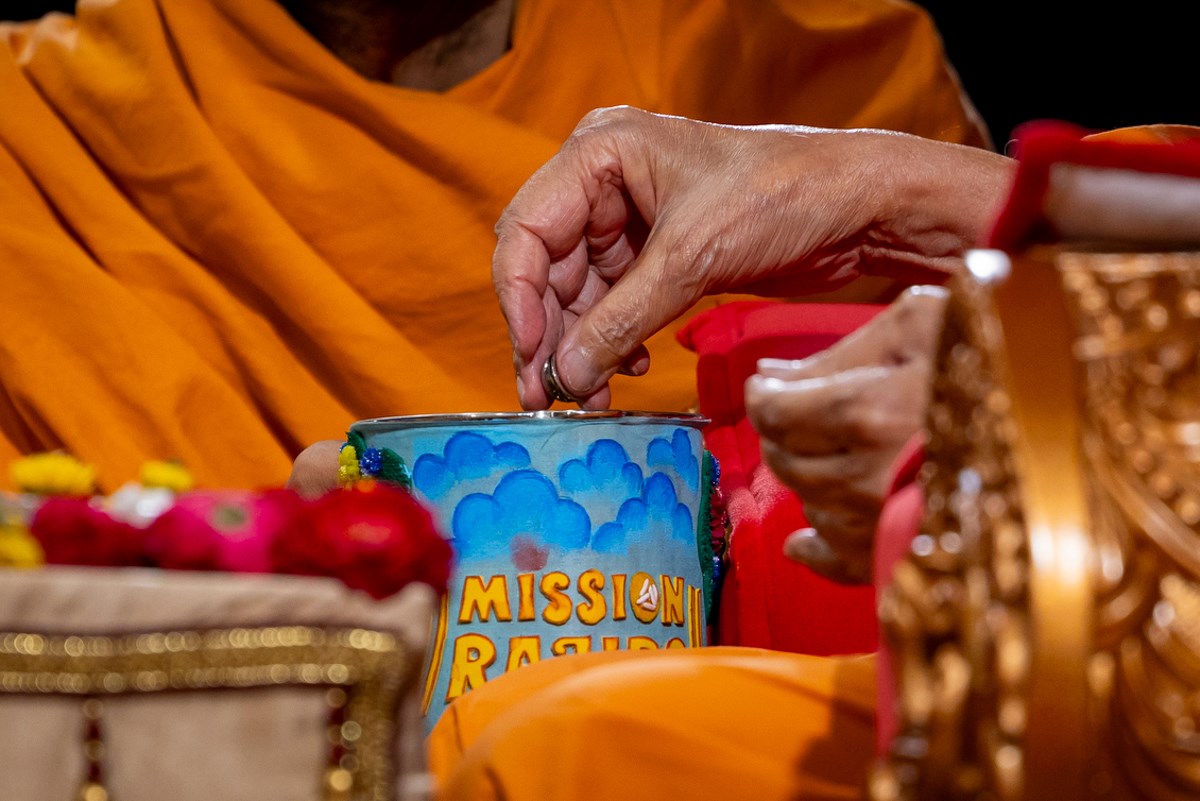 Swamishri sanctifies water with the holy relics of Bhagwan Swaminarayan and the Guru Parampara