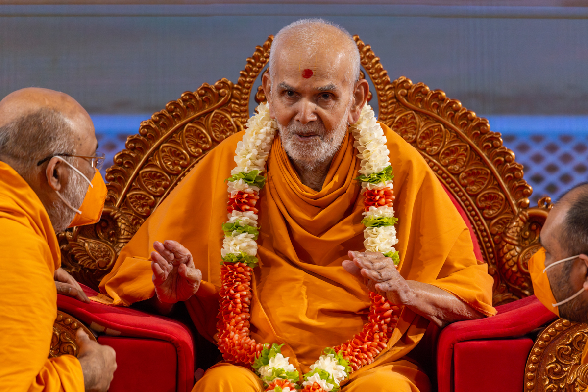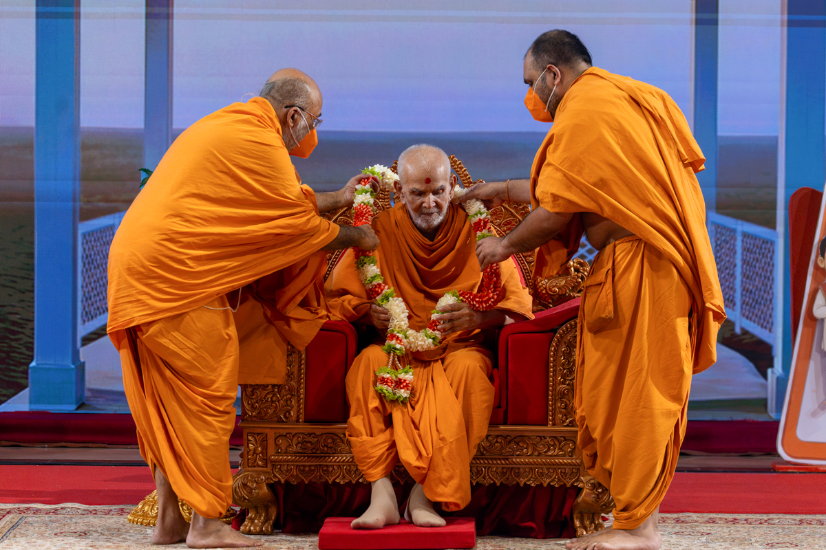 Vishwaswarup Swami and Bhagvatsetu Swami honor Swamishri with a garland at the beginning of the evening karyakar felicitation assembly