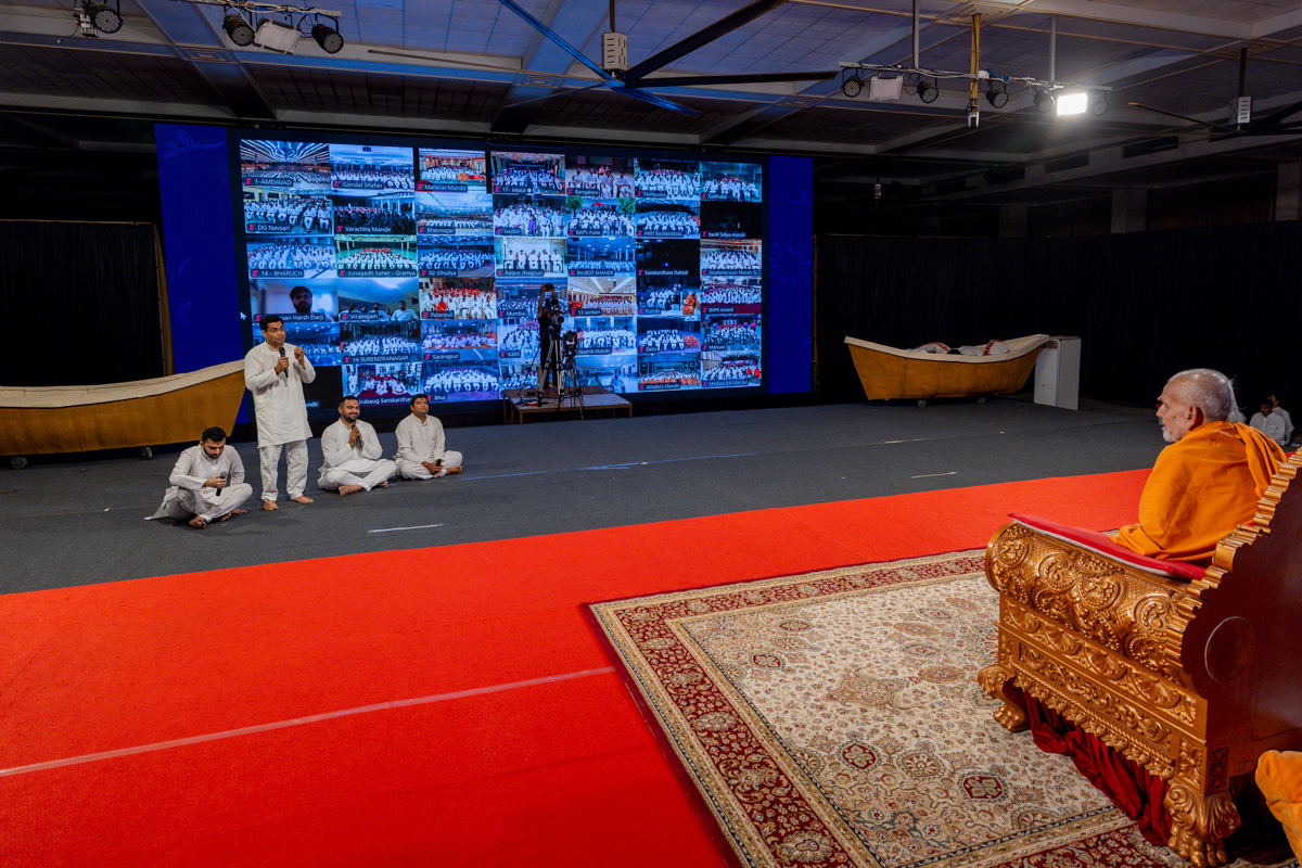 Balaks, balikas and karyakars doing Swamishri's puja darshan via video conference