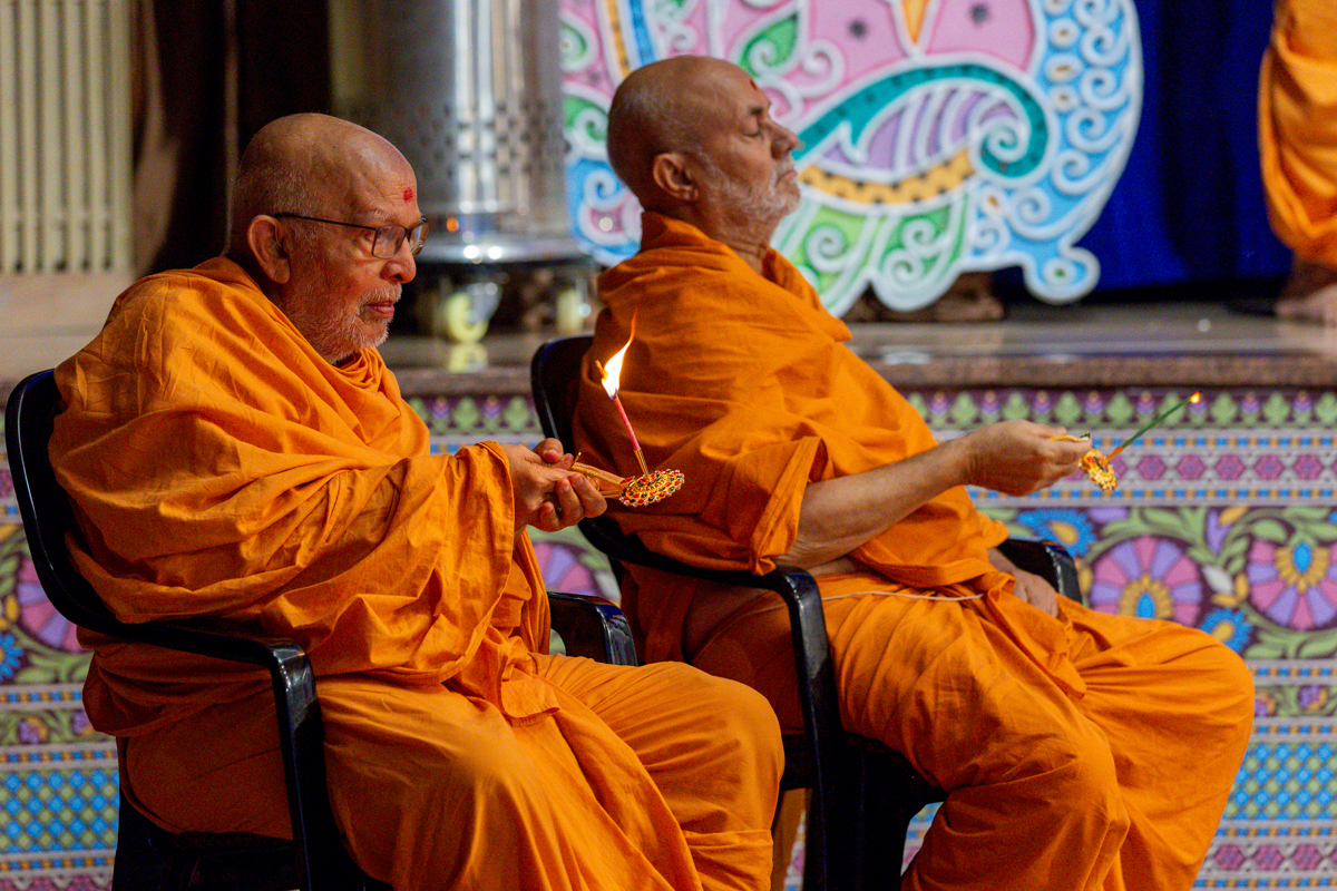 Pujya Ghanshyamcharan Swami and Pujya Viveksagar Swami doing Swamishri's puja darshan