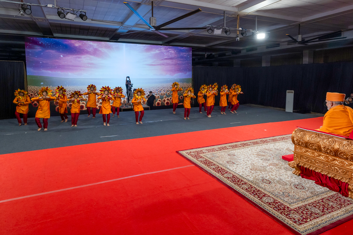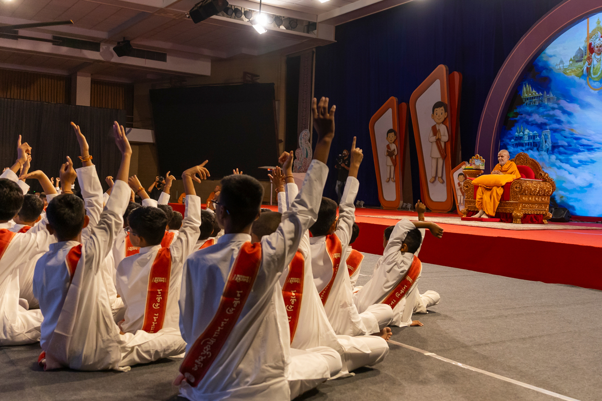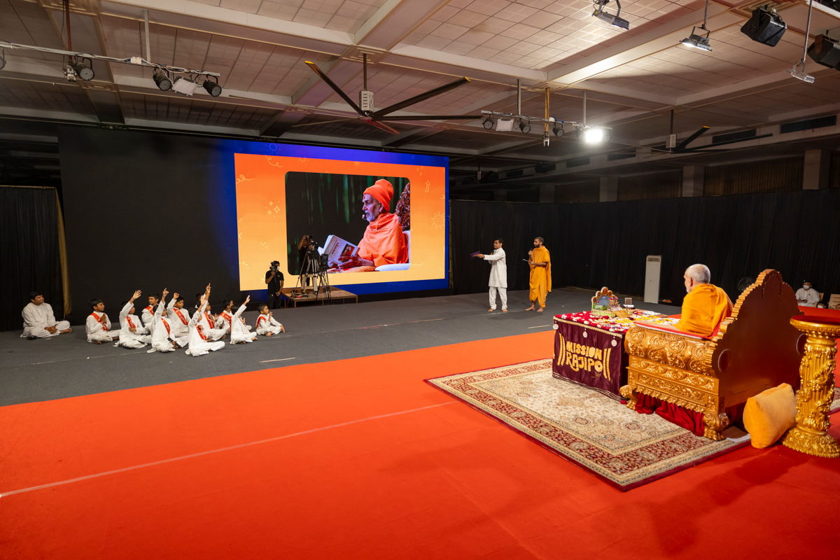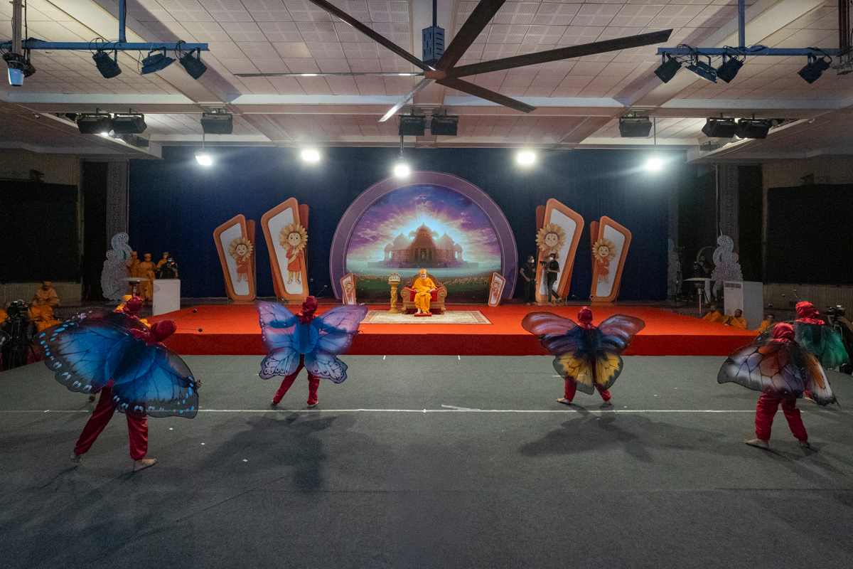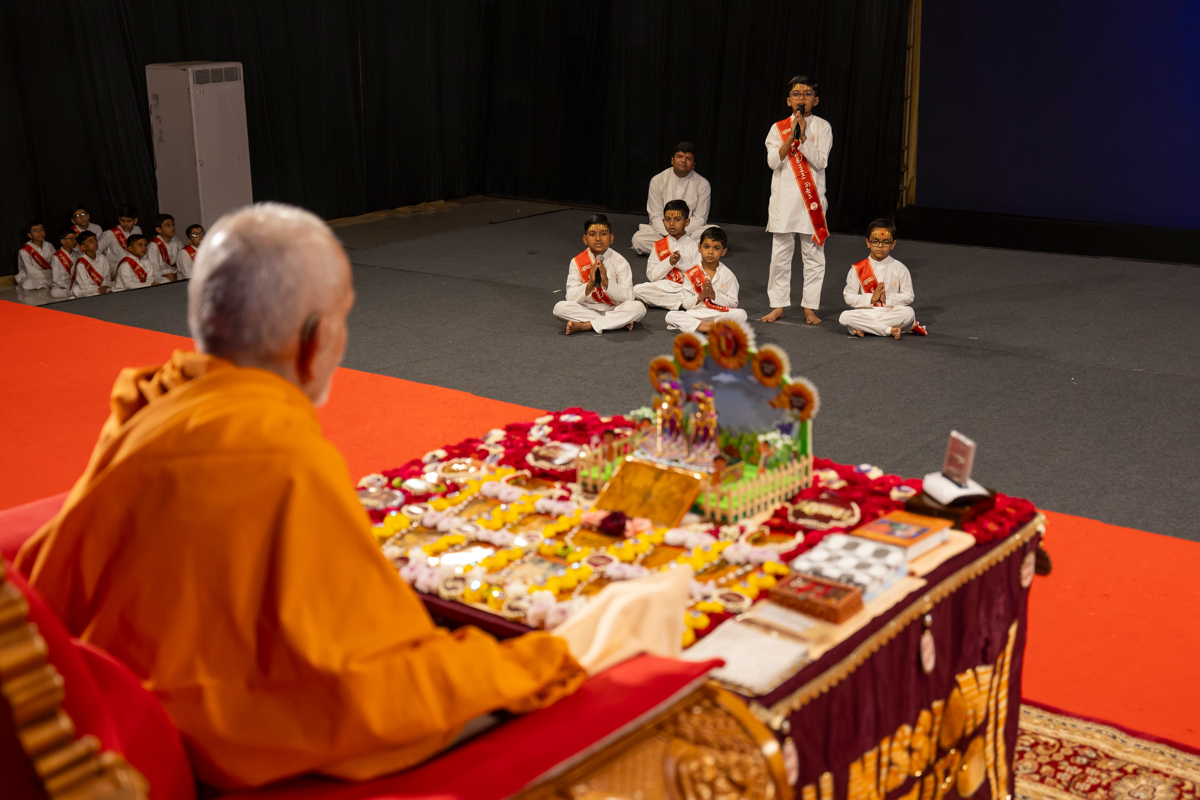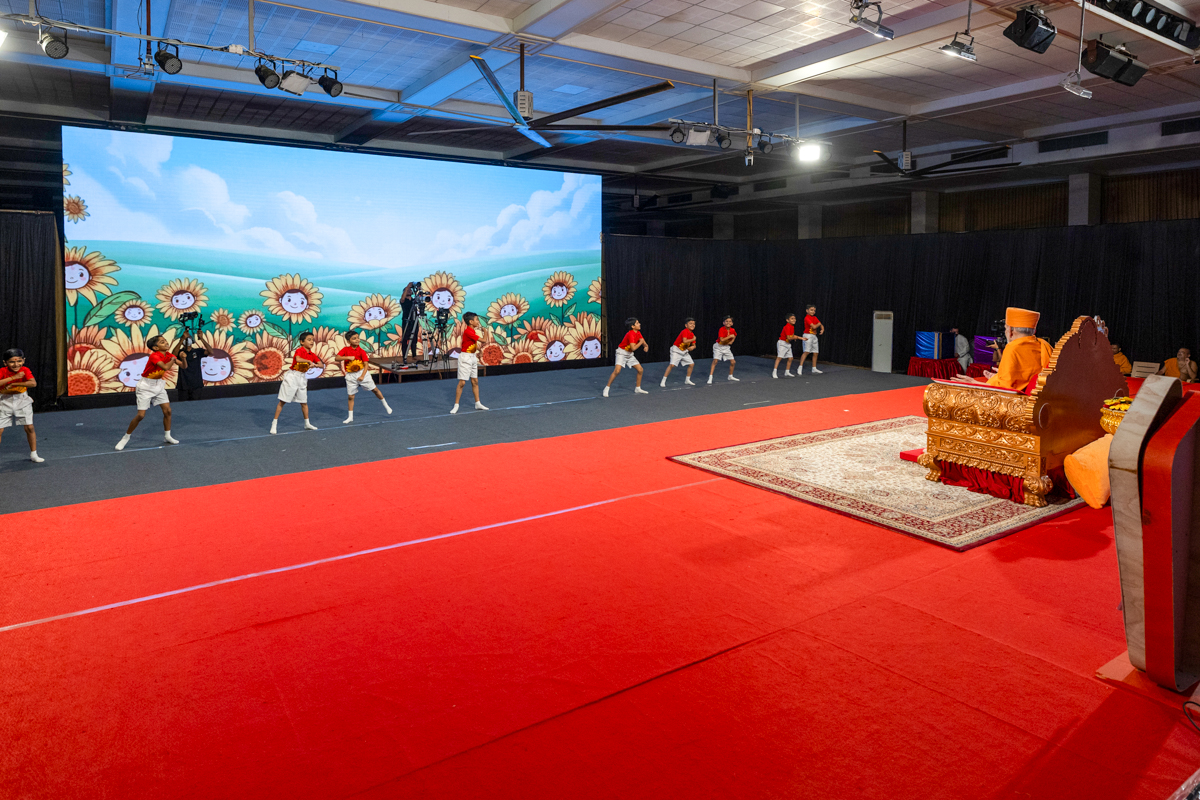 Balaks perform a traditional dance to welcome Swamishri in the evening tribute assembly, honouring the children of Mission Rajipo