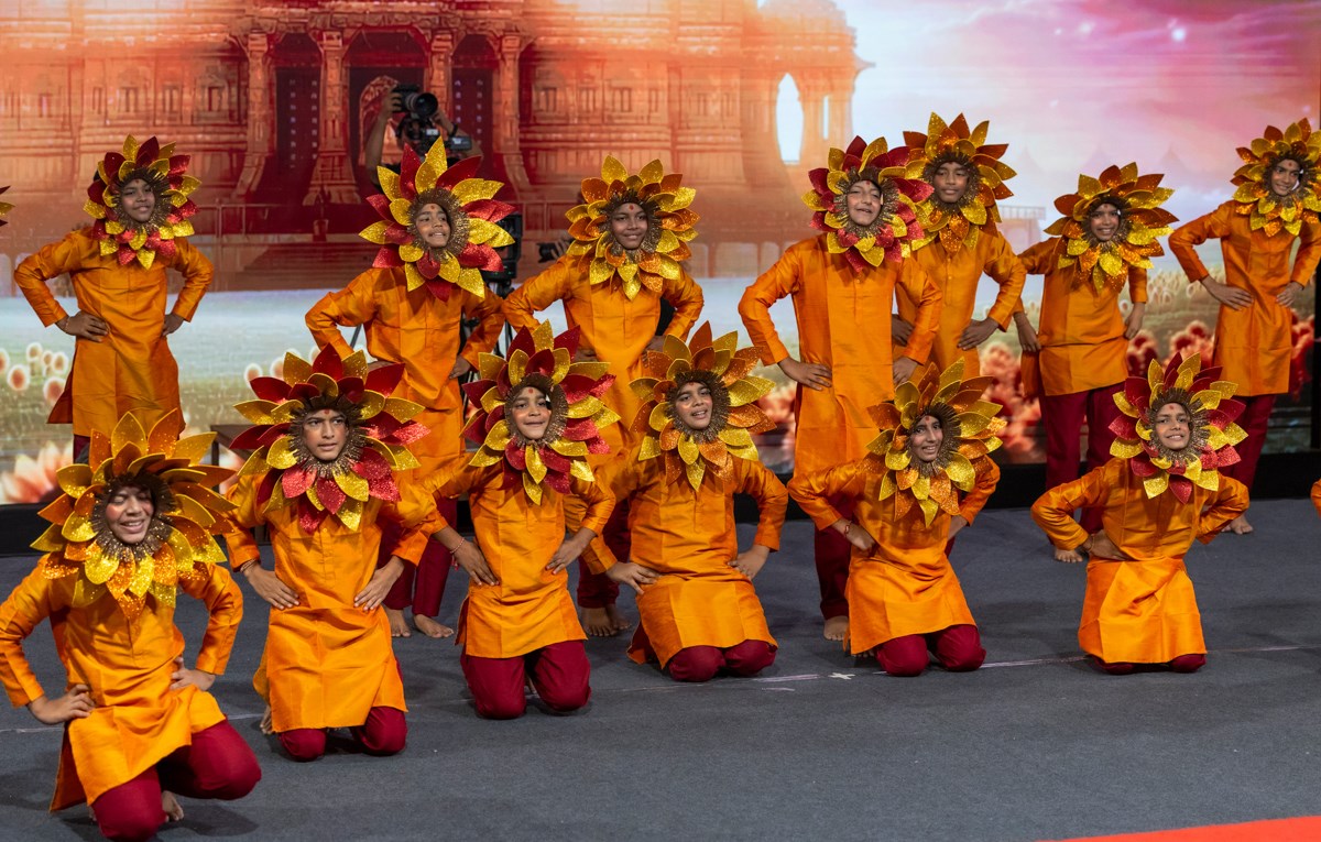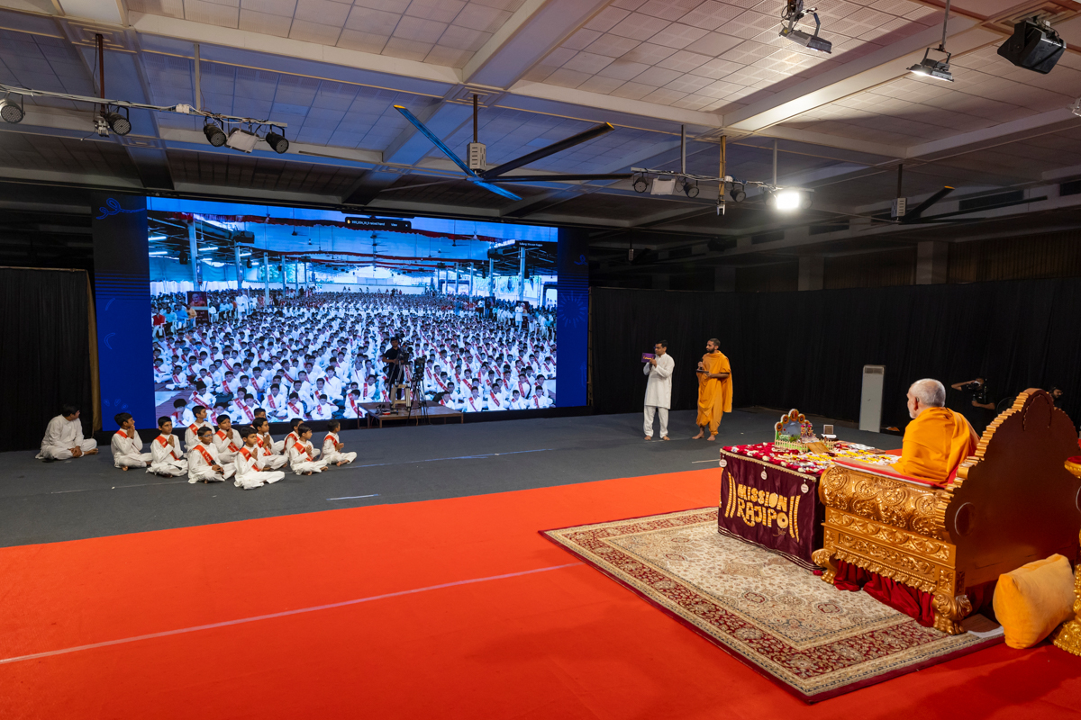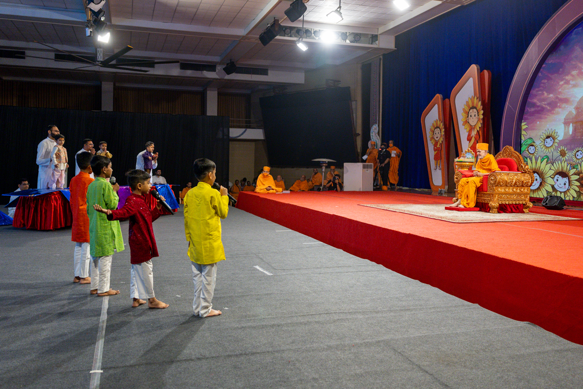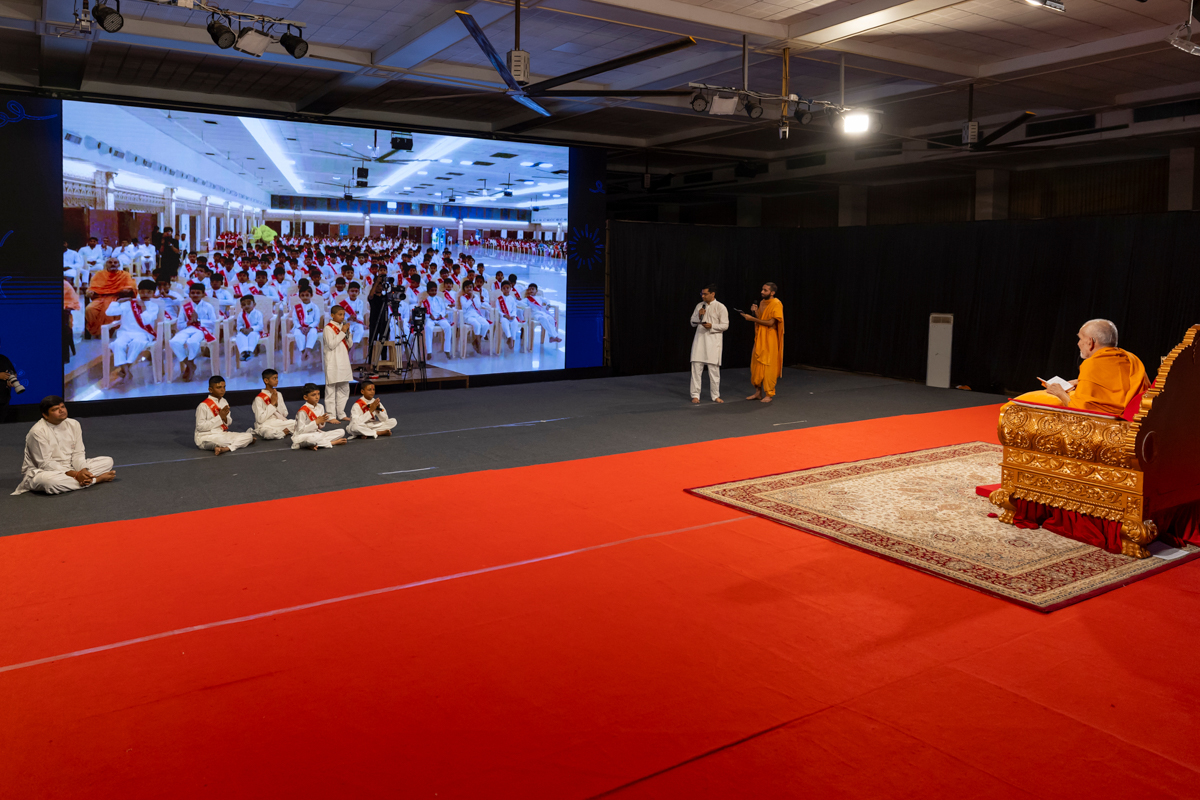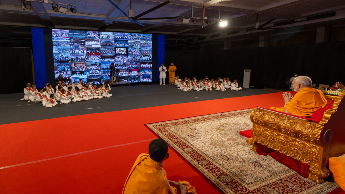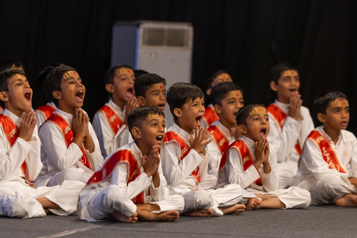 Balaks perform a traditional dance to welcome Swamishri in the evening tribute assembly, honouring the children of Mission Rajipo