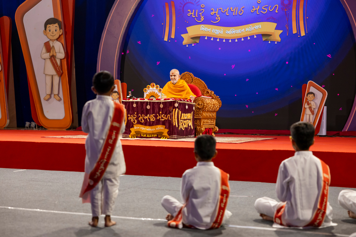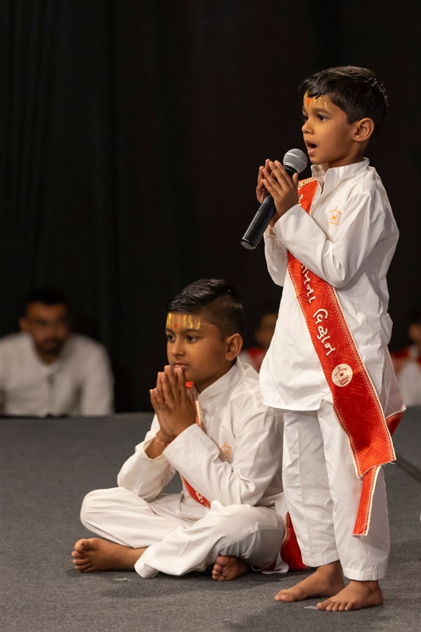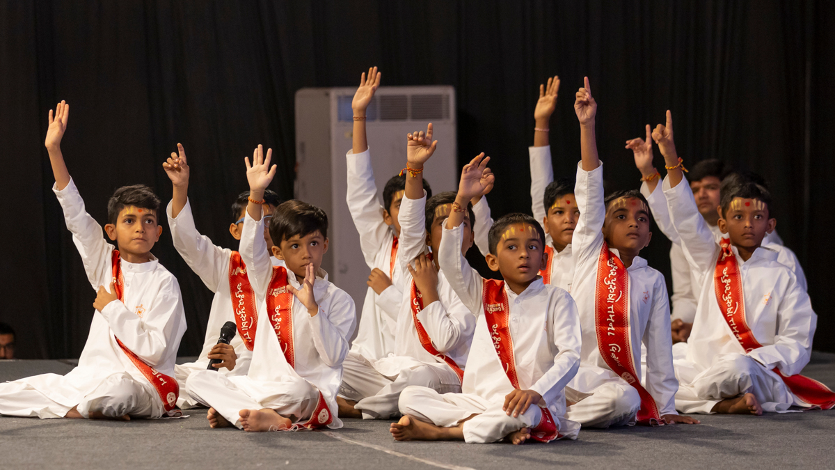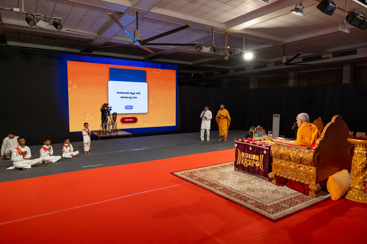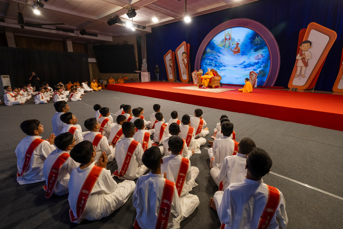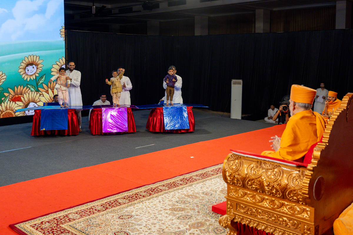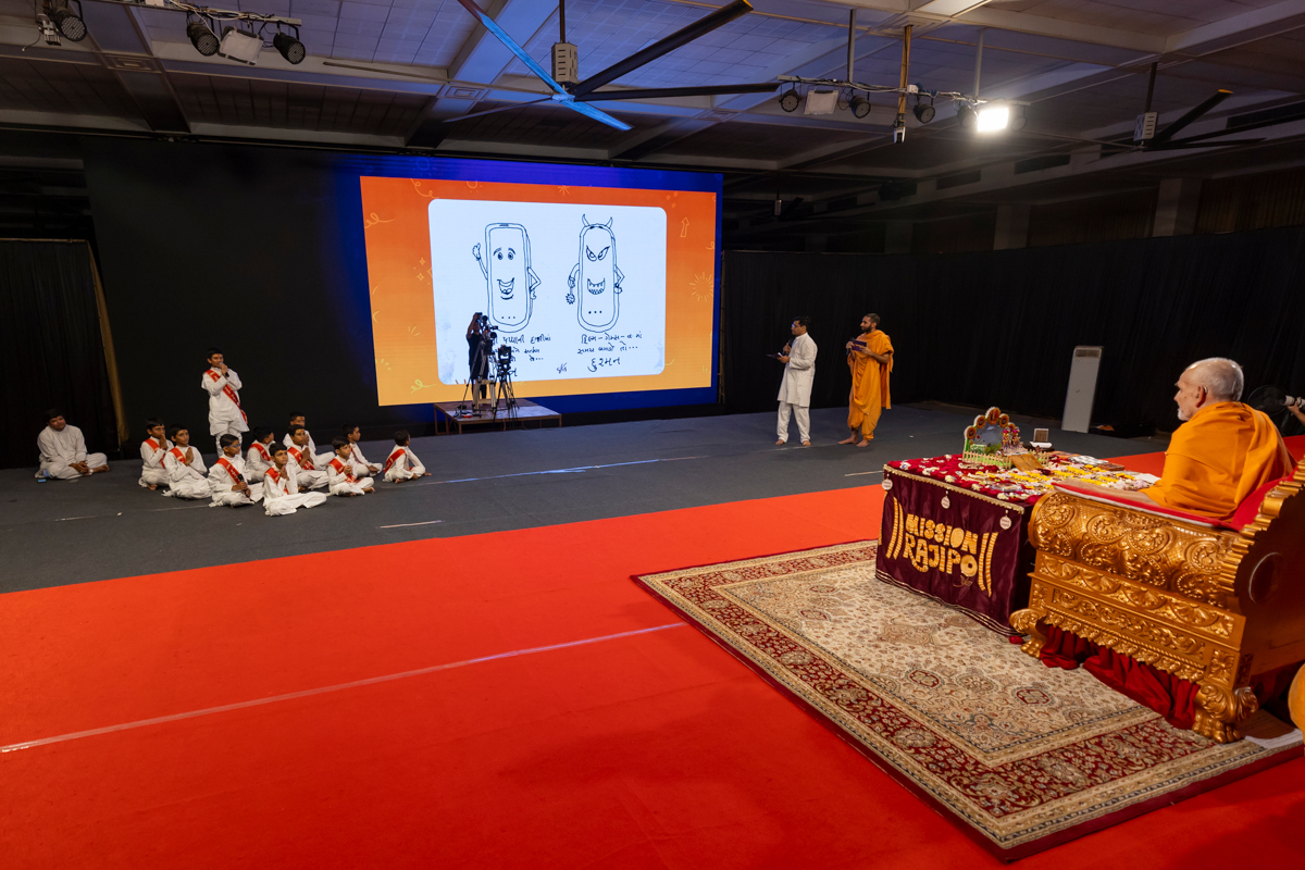Balaks perform a traditional dance to welcome Swamishri in the evening tribute assembly, honouring the children of Mission Rajipo