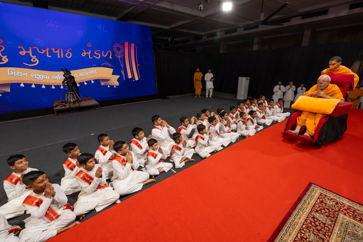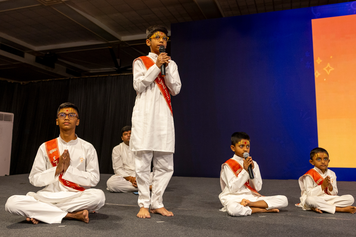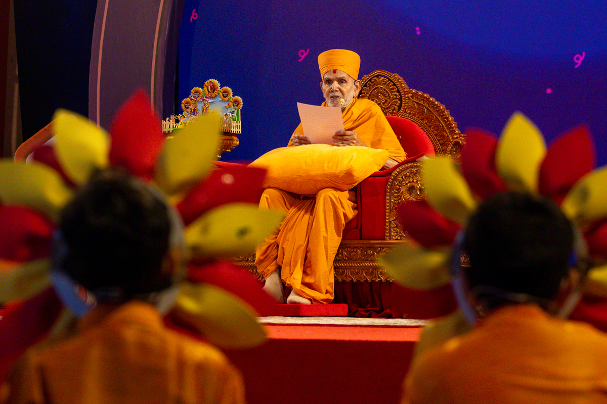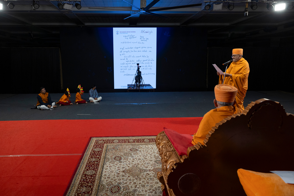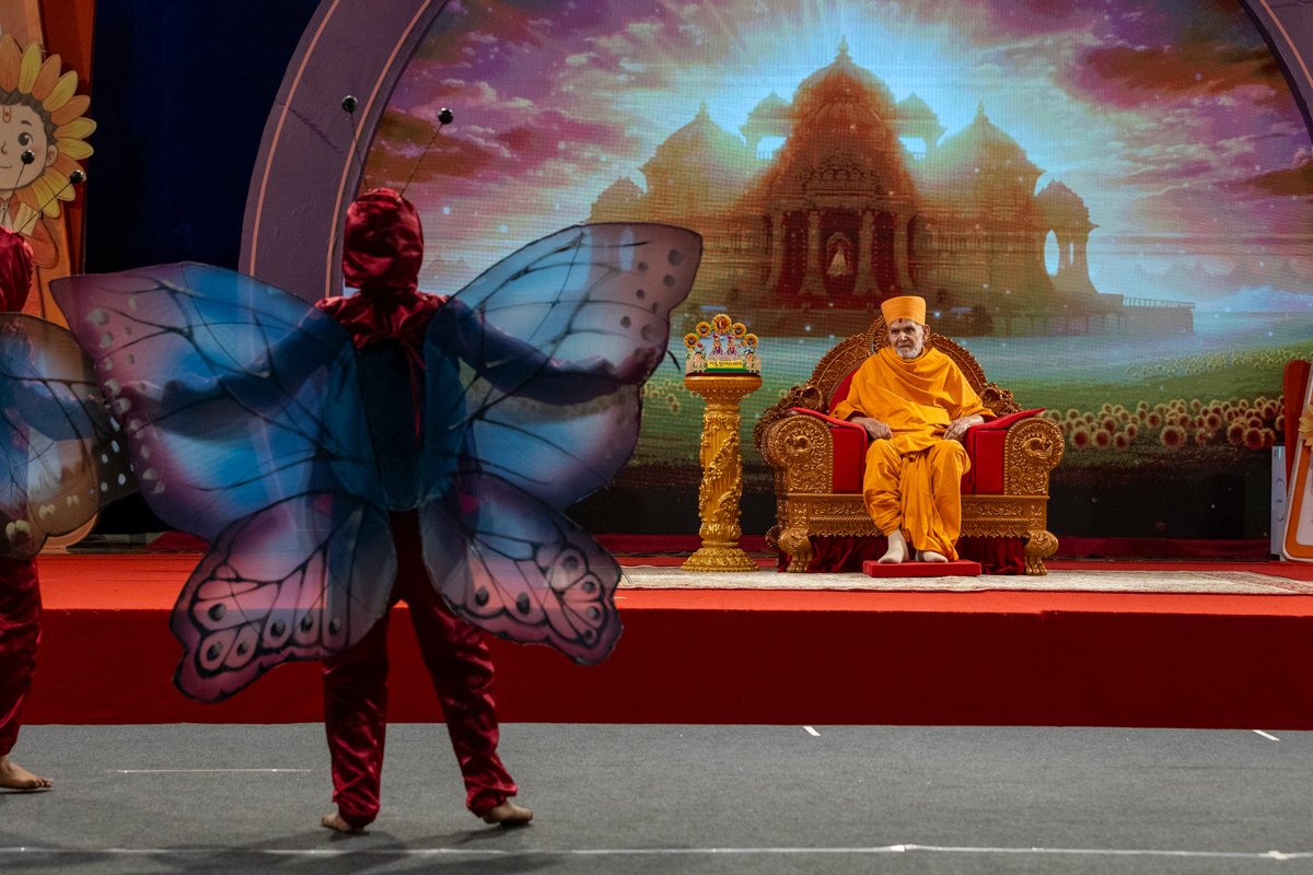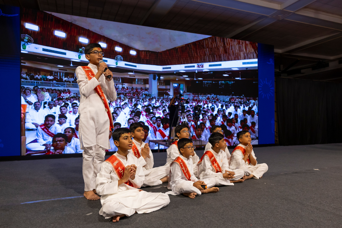 Balaks perform a traditional dance to welcome Swamishri in the evening tribute assembly, honouring the children of Mission Rajipo