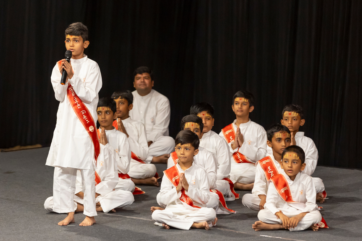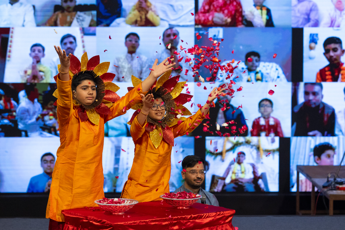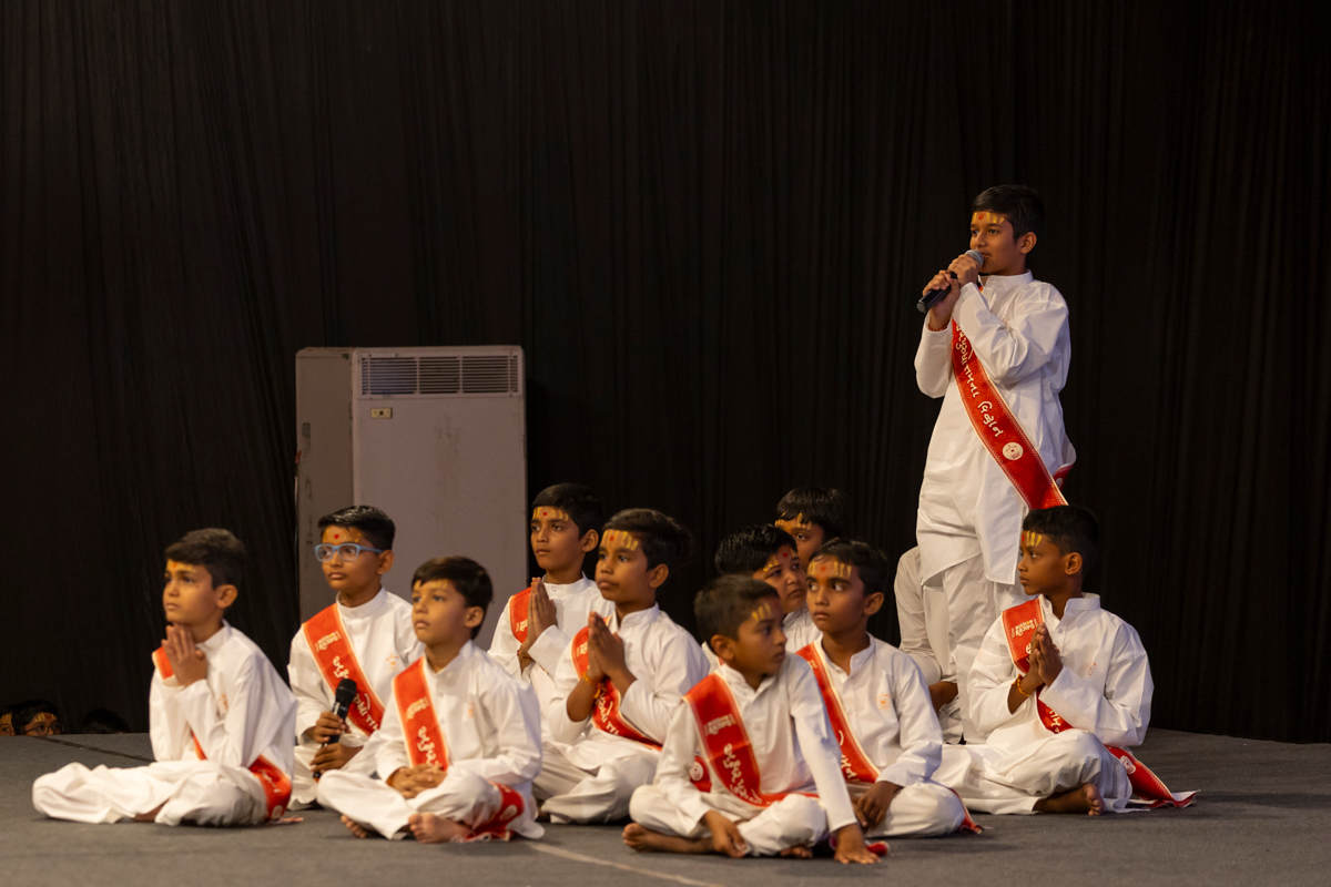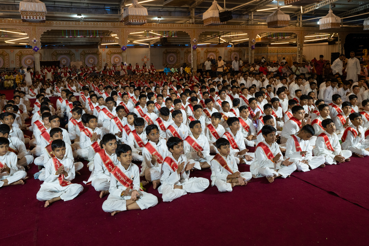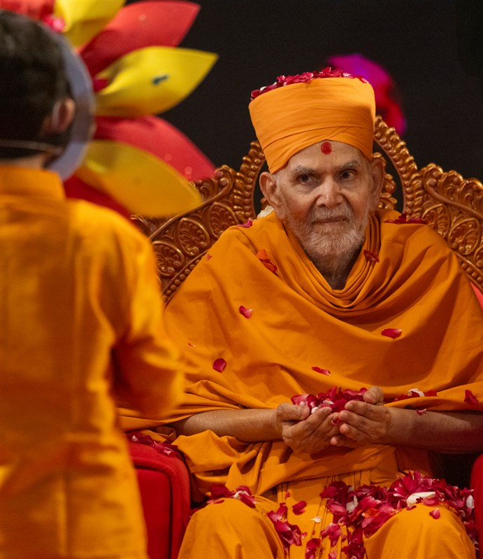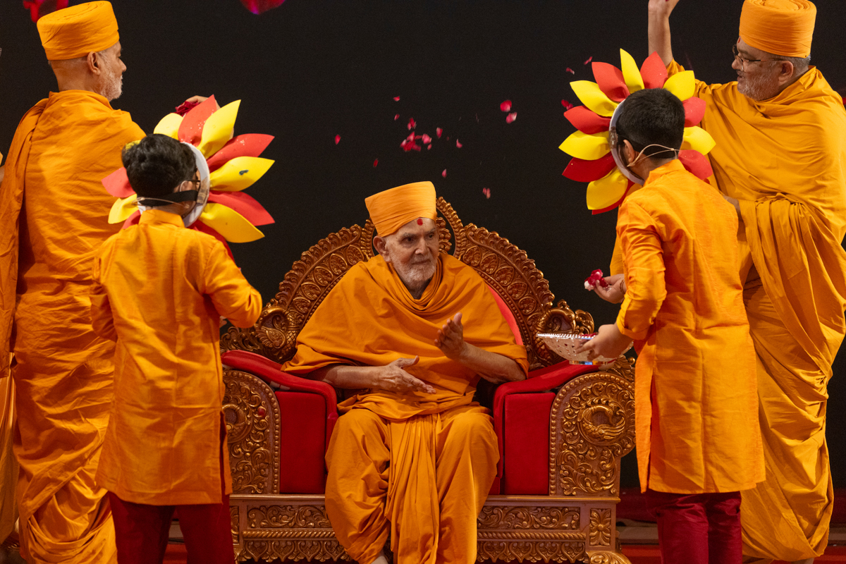 Balaks perform a traditional dance to welcome Swamishri in the evening tribute assembly, honouring the children of Mission Rajipo