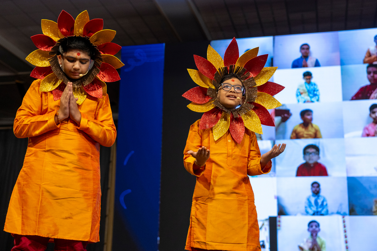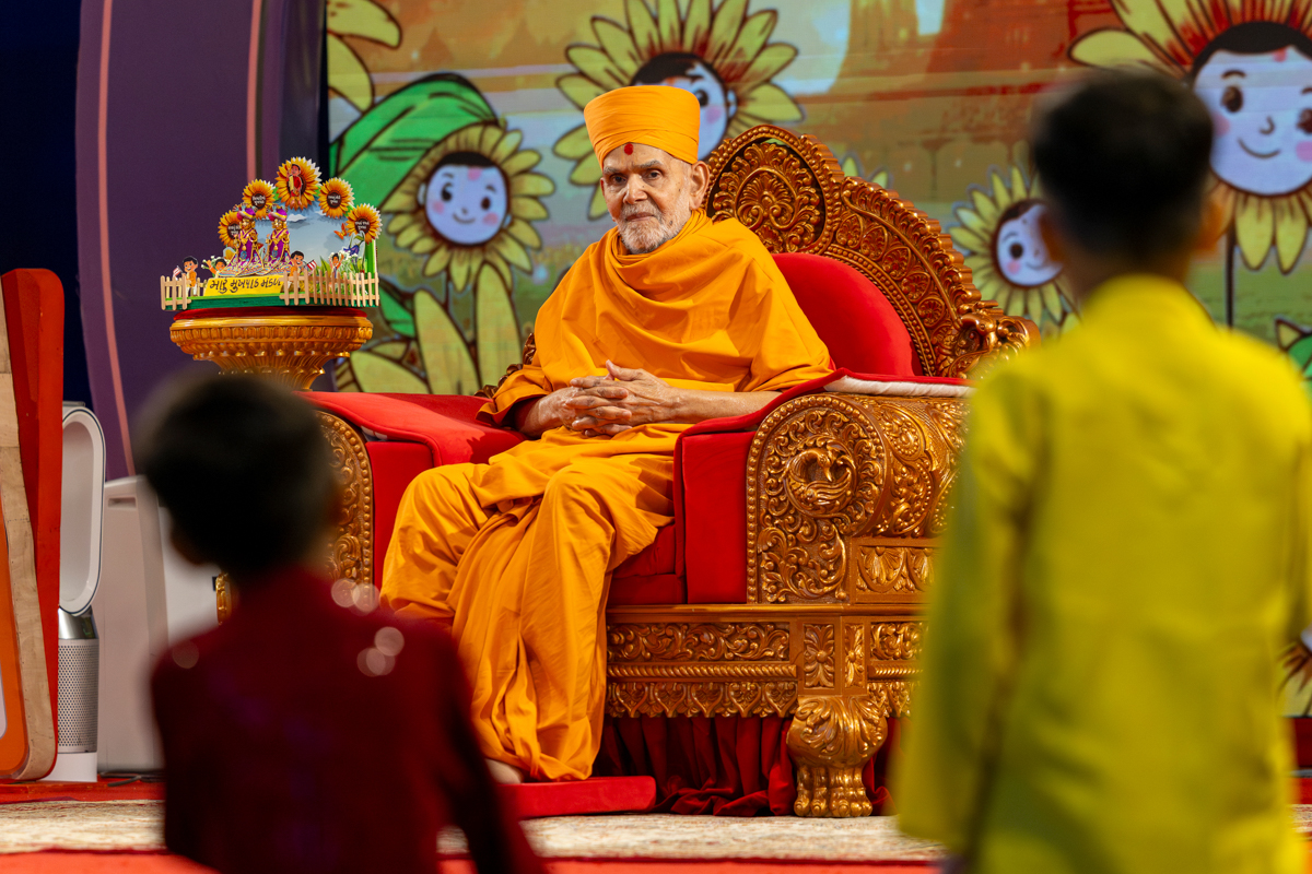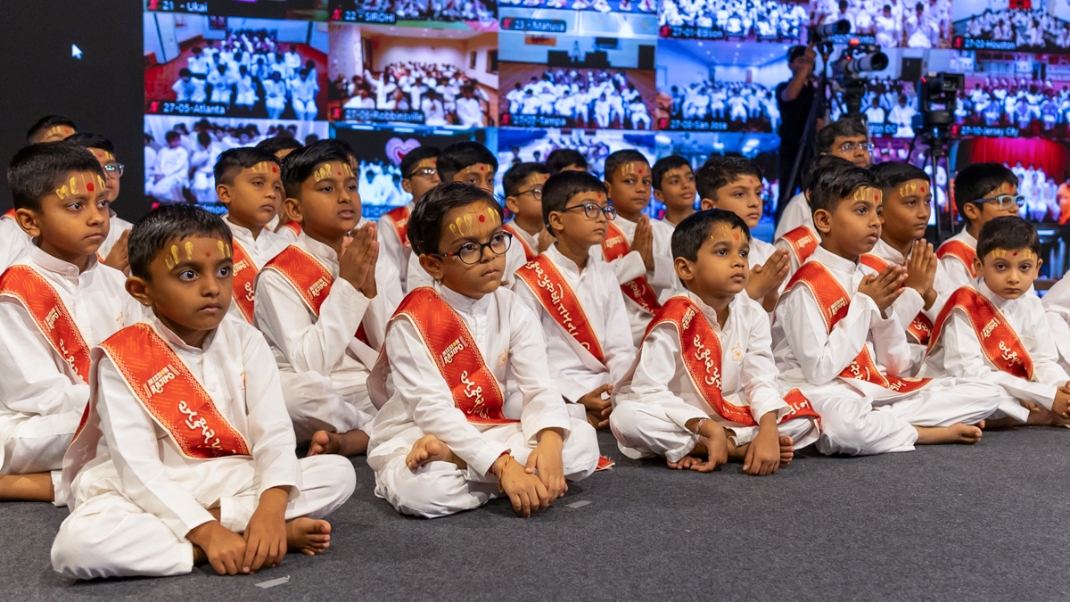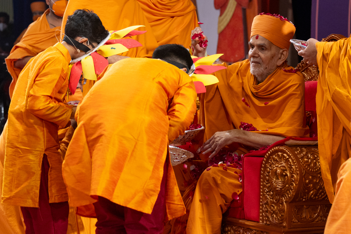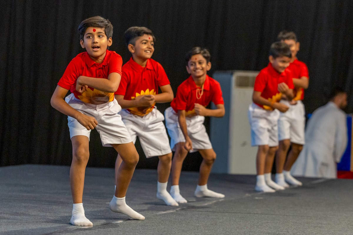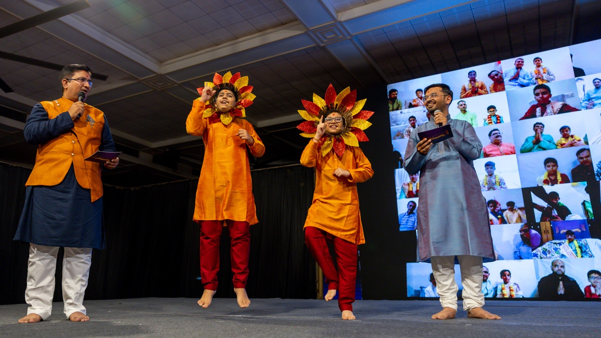 Balaks perform a traditional dance to welcome Swamishri in the evening tribute assembly, honouring the children of Mission Rajipo