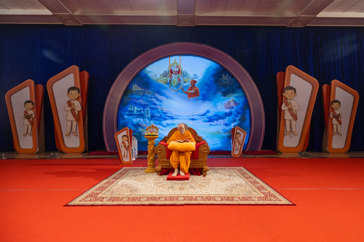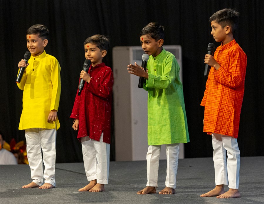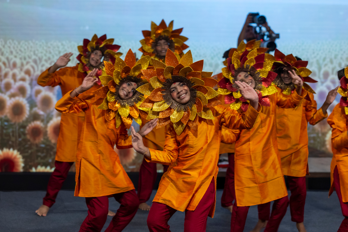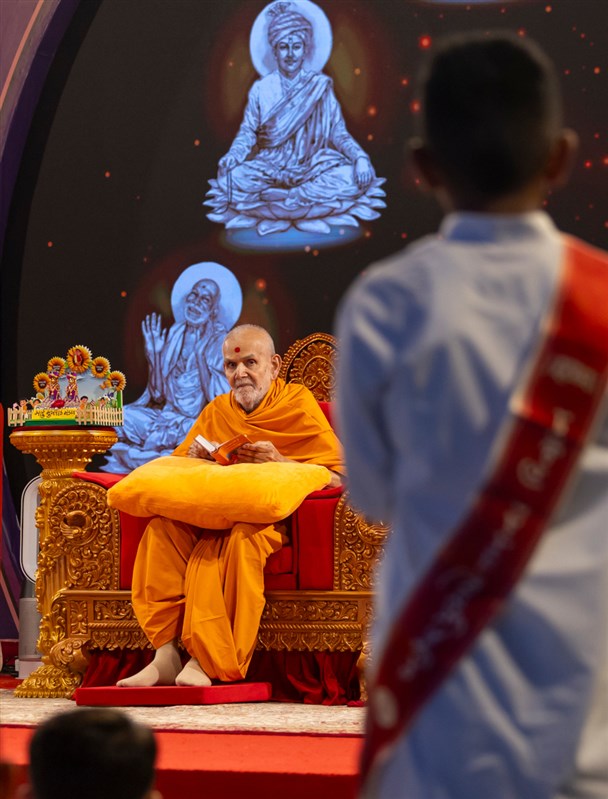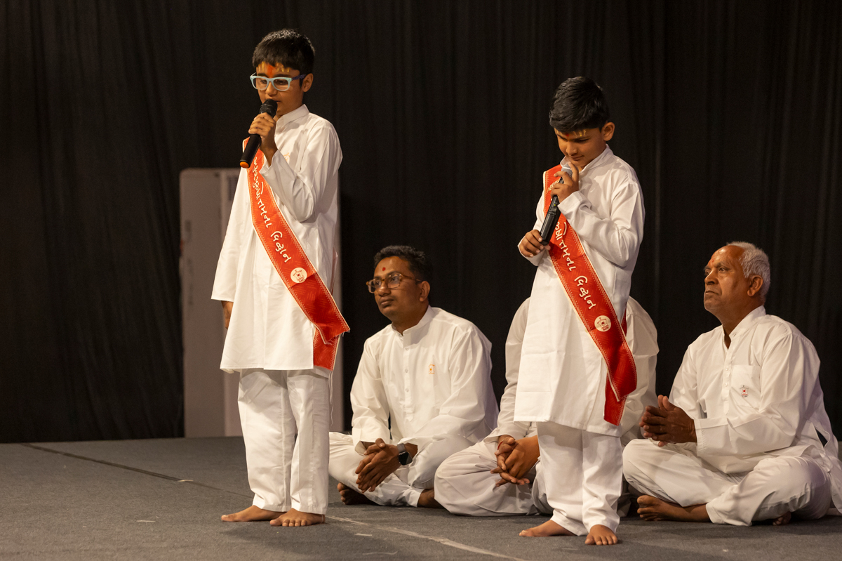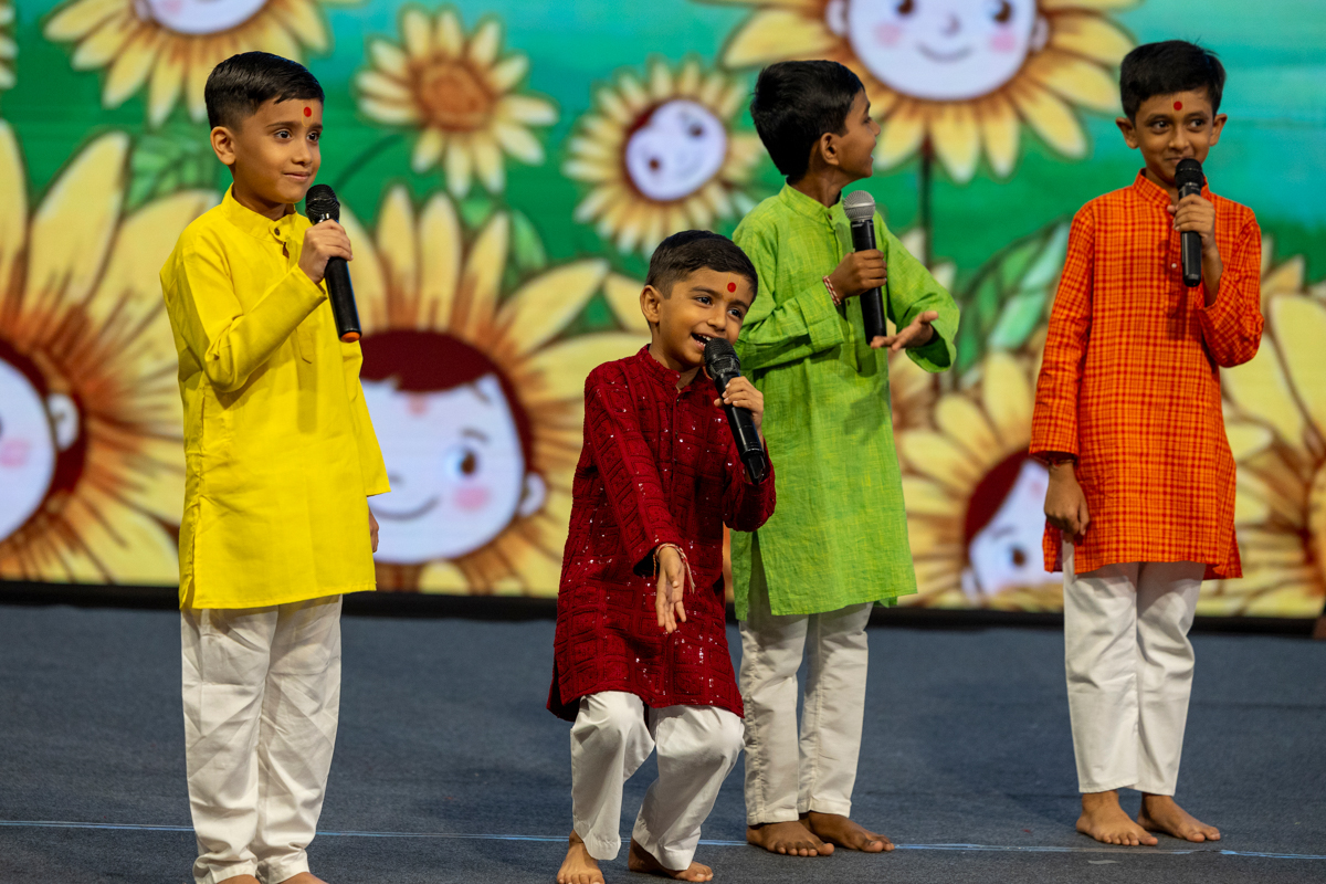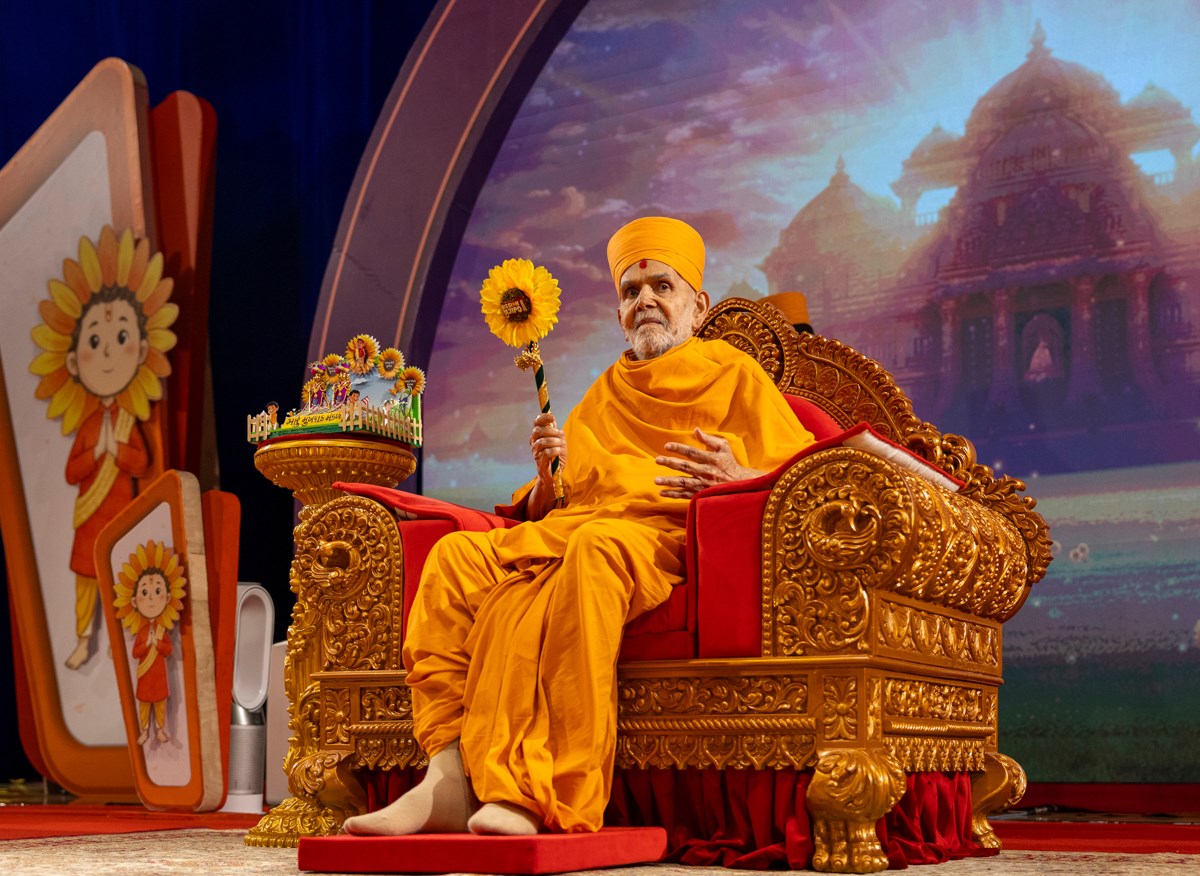 Balaks perform a traditional dance to welcome Swamishri in the evening tribute assembly, honouring the children of Mission Rajipo
