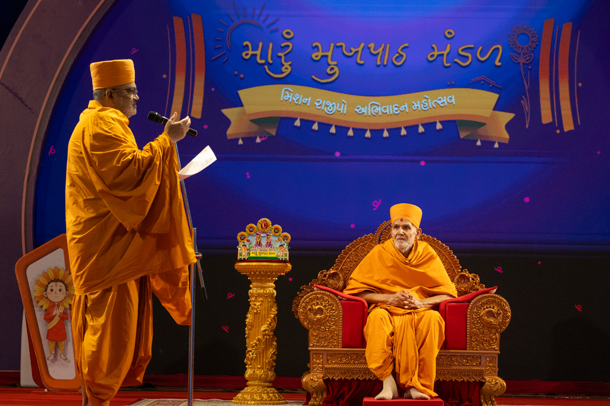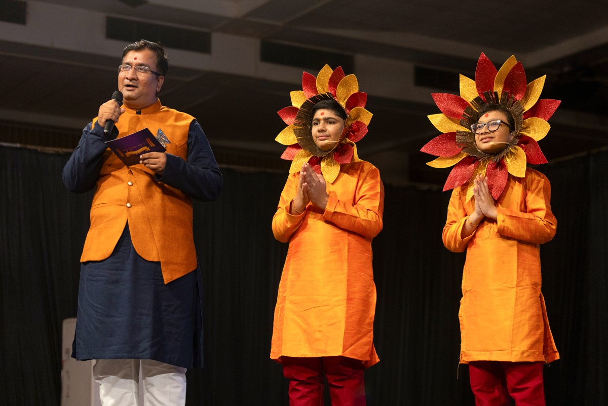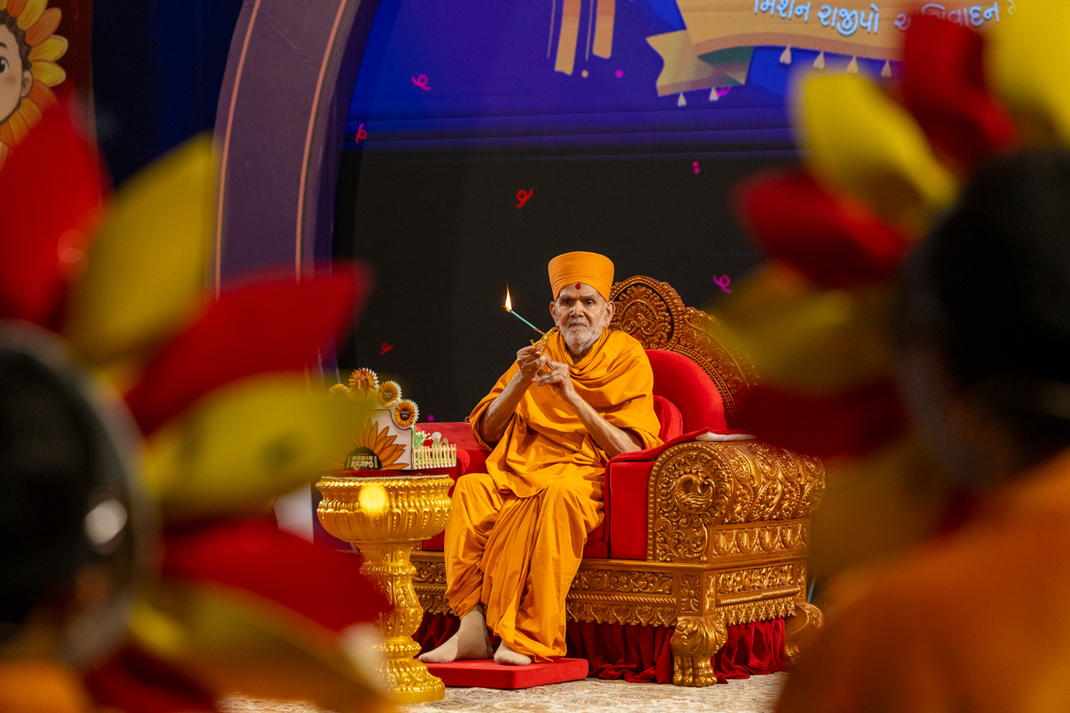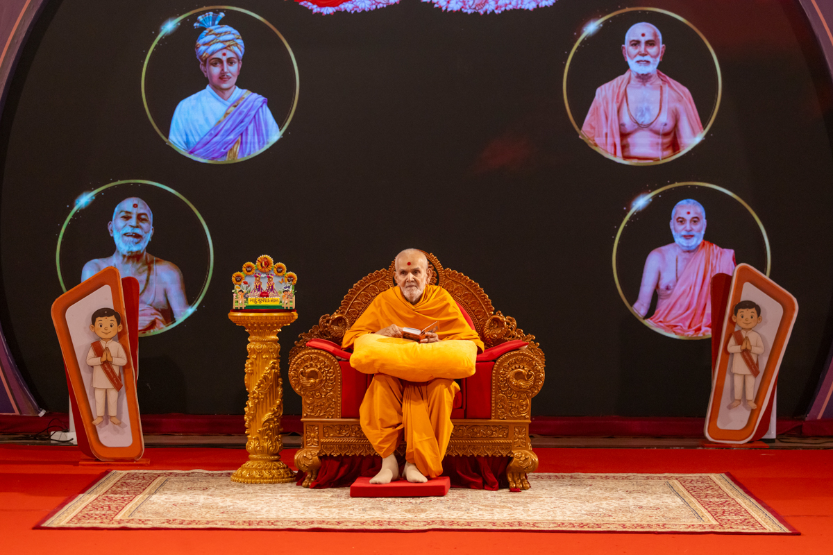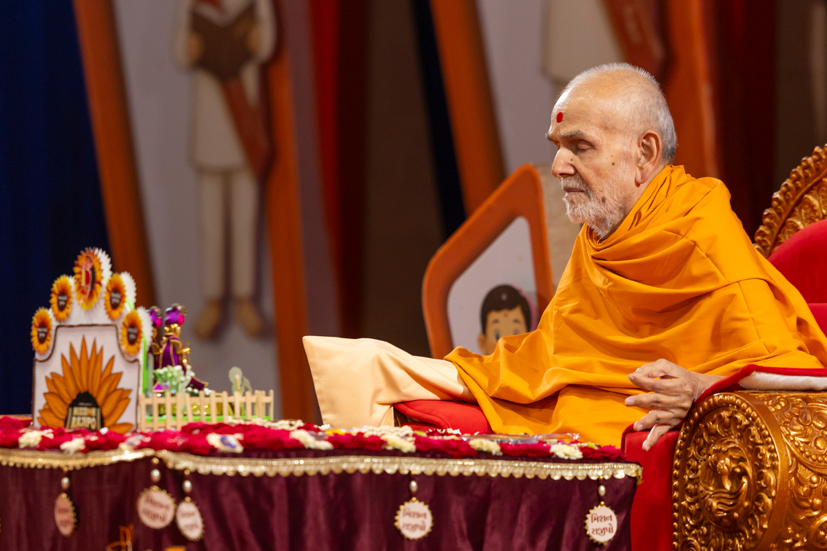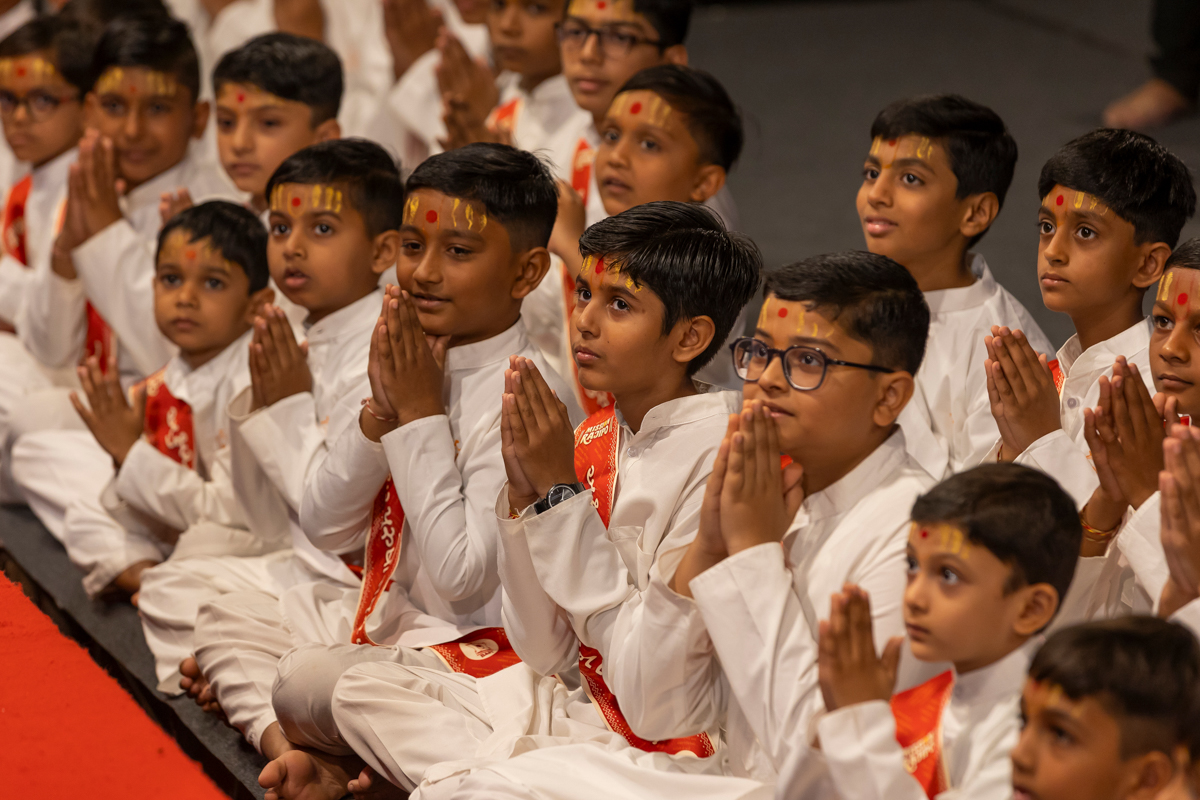 Balaks perform a traditional dance to welcome Swamishri in the evening tribute assembly, honouring the children of Mission Rajipo