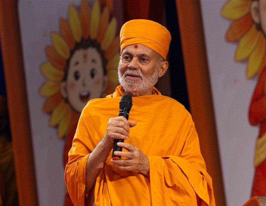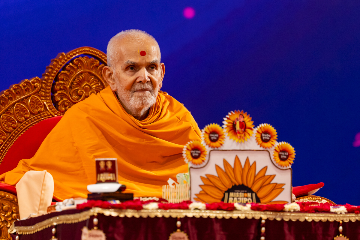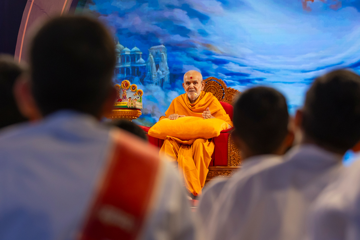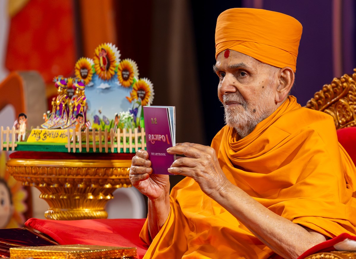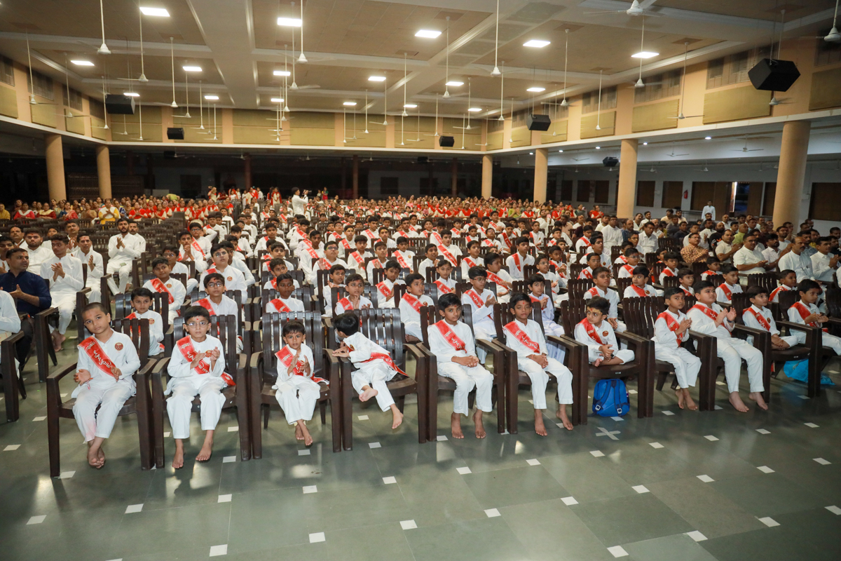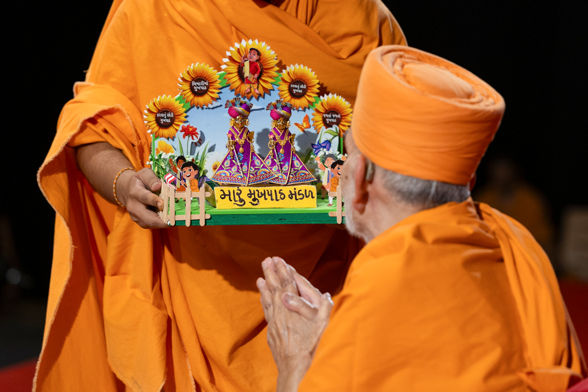 Balaks perform a traditional dance to welcome Swamishri in the evening tribute assembly, honouring the children of Mission Rajipo