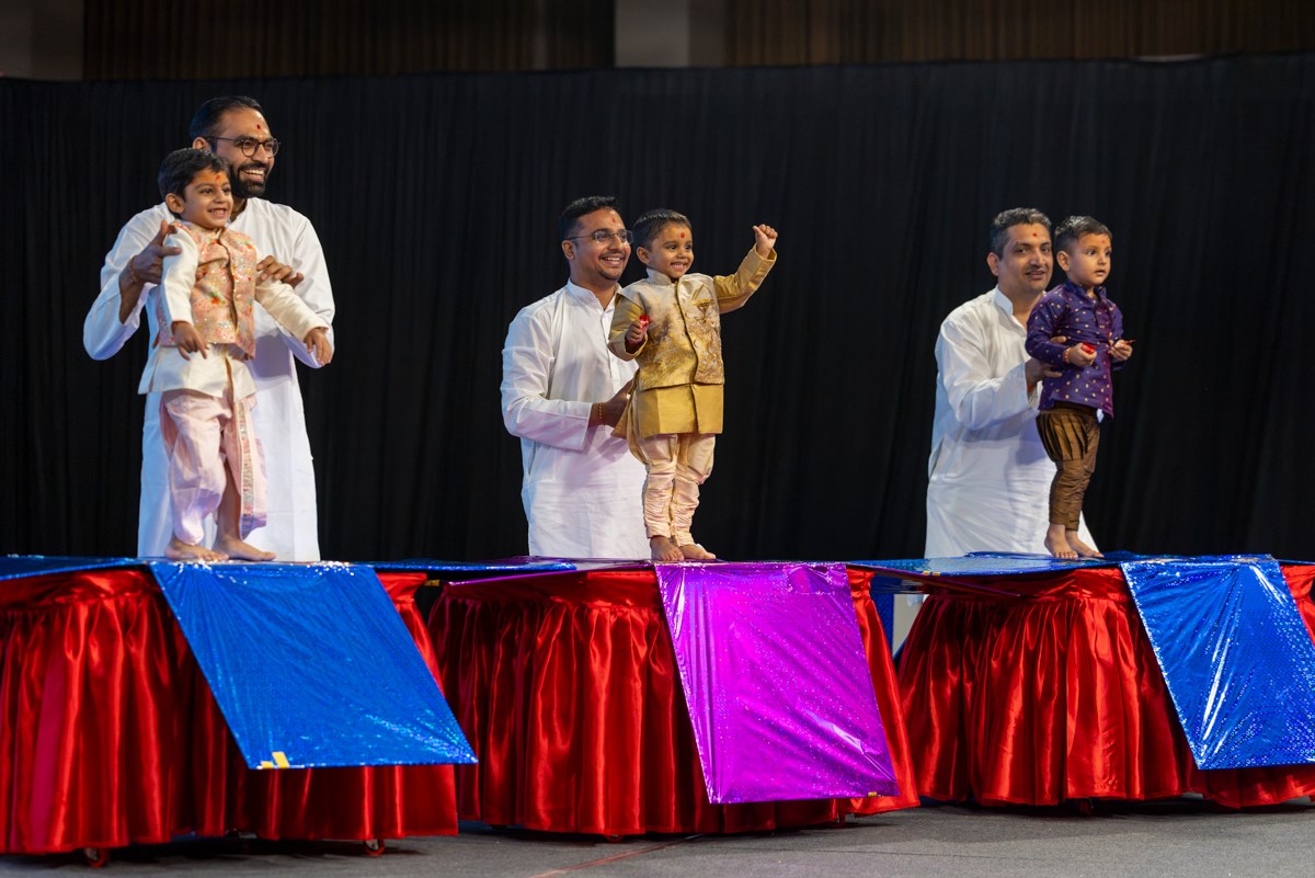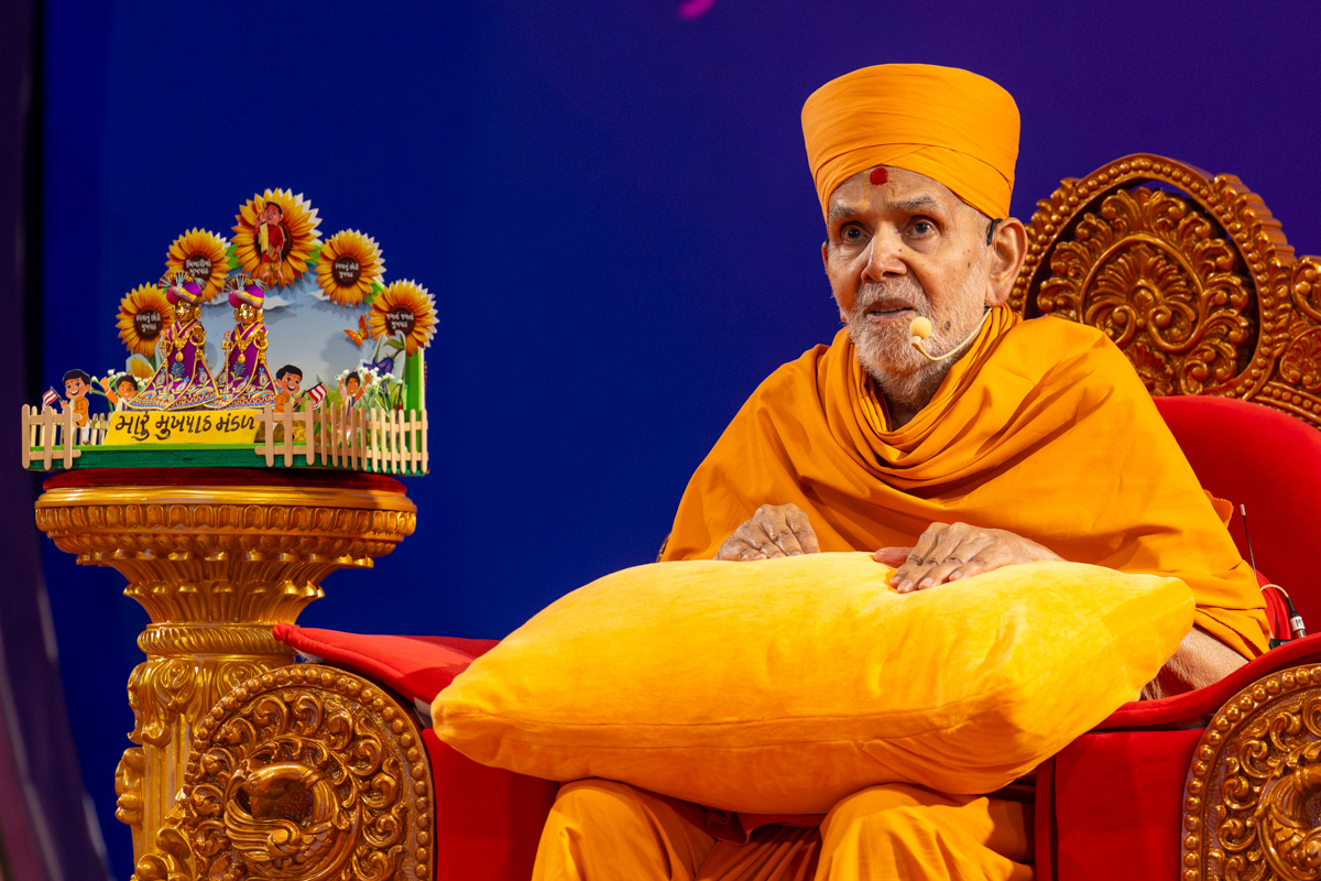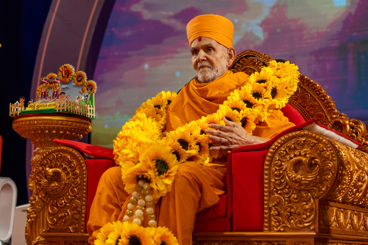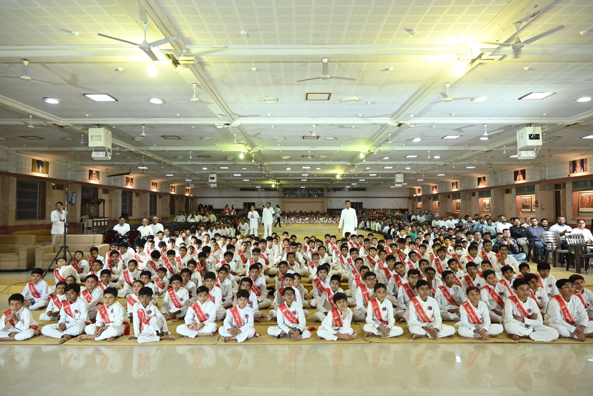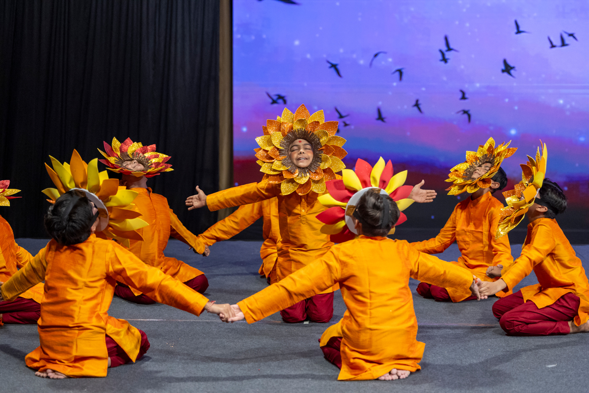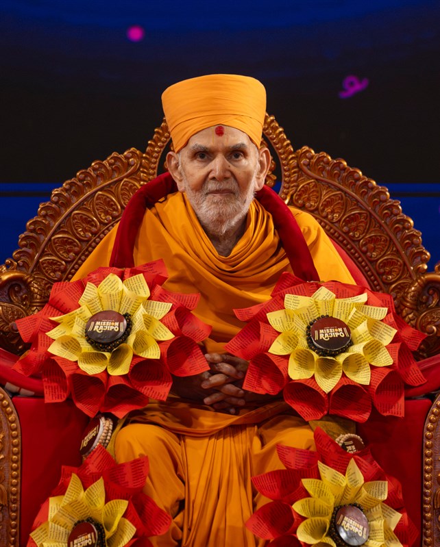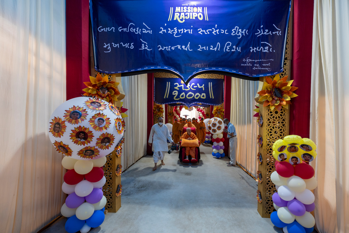Balaks perform a traditional dance to welcome Swamishri in the evening tribute assembly, honouring the children of Mission Rajipo