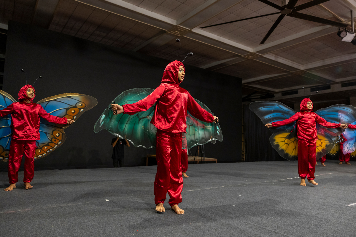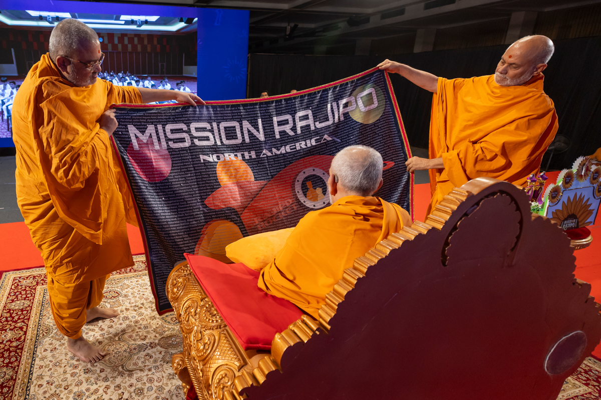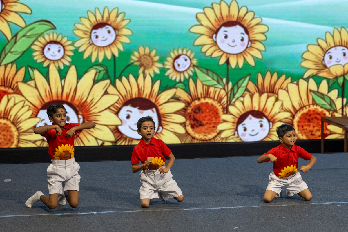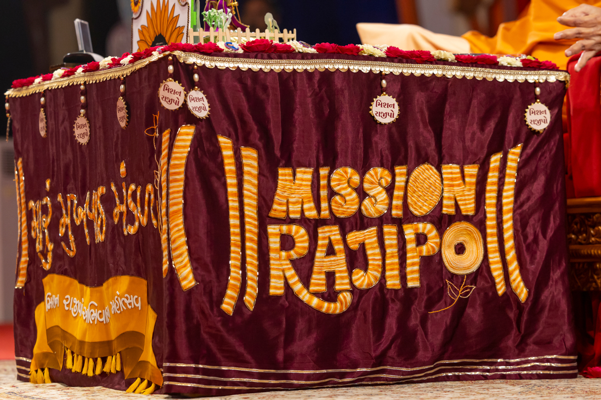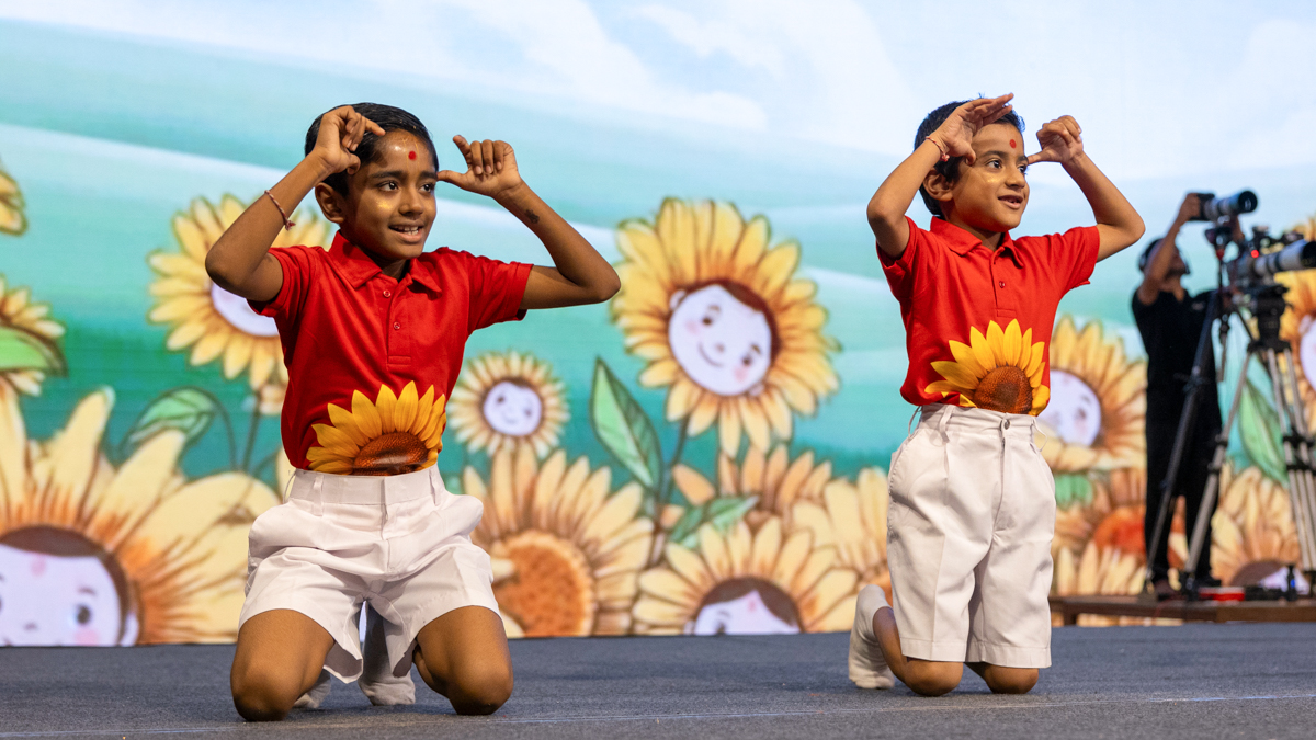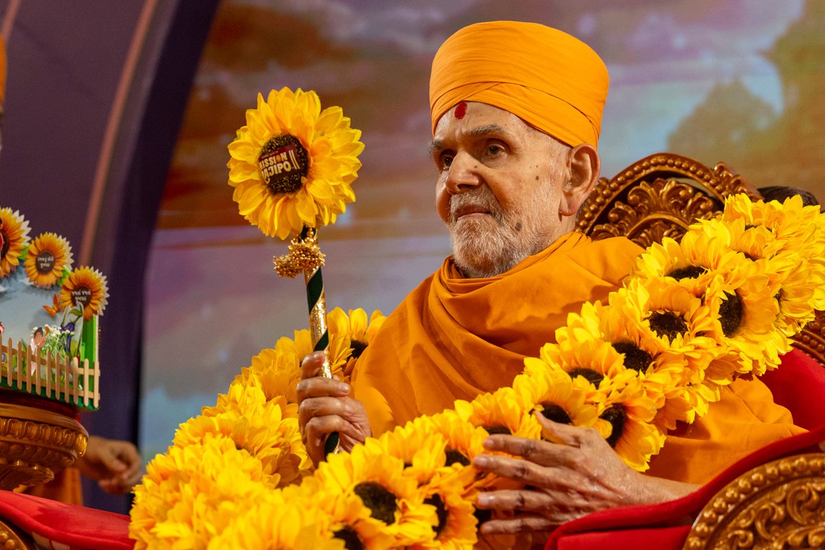 Balaks perform a traditional dance to welcome Swamishri in the evening tribute assembly, honouring the children of Mission Rajipo