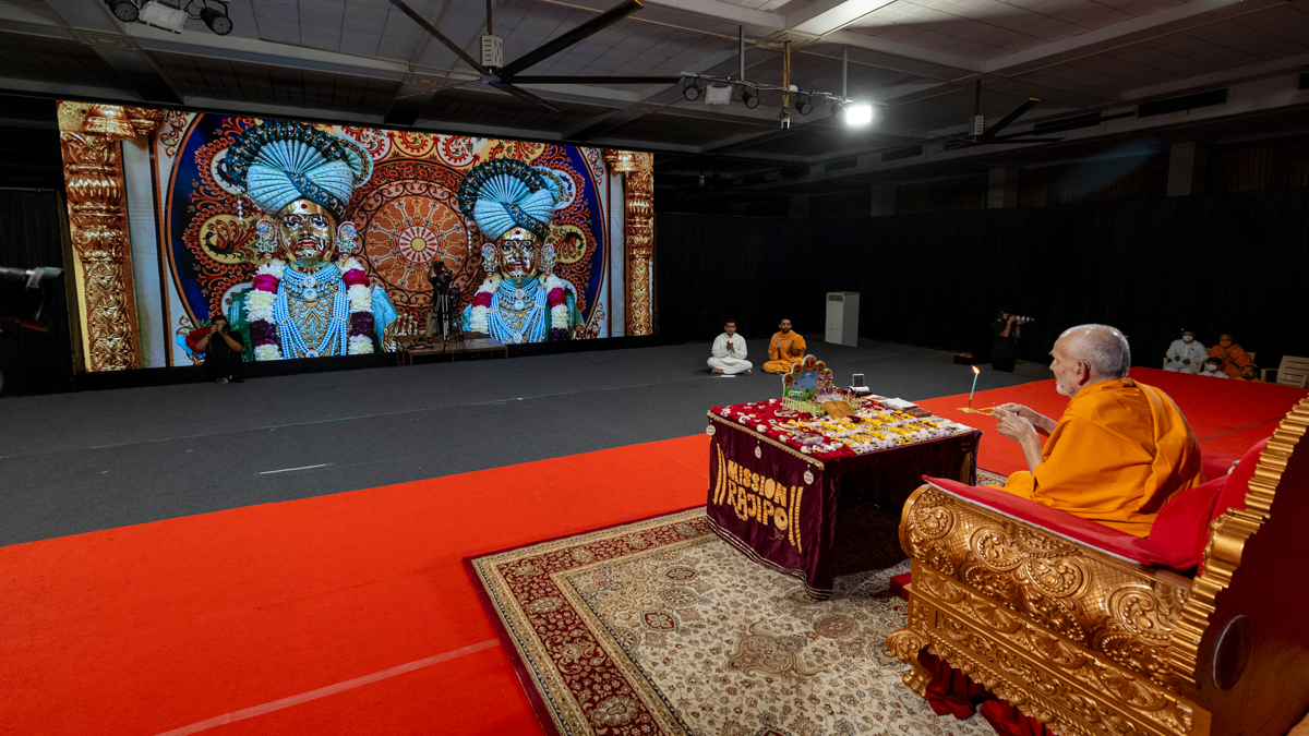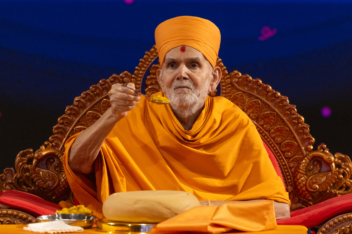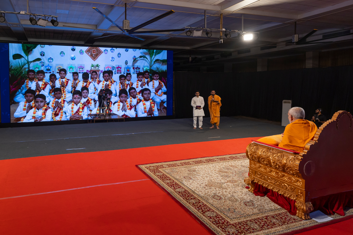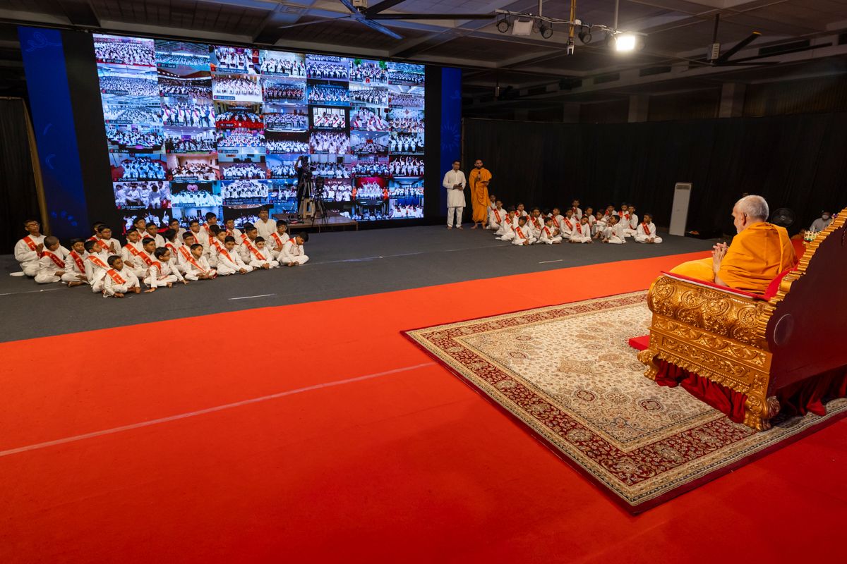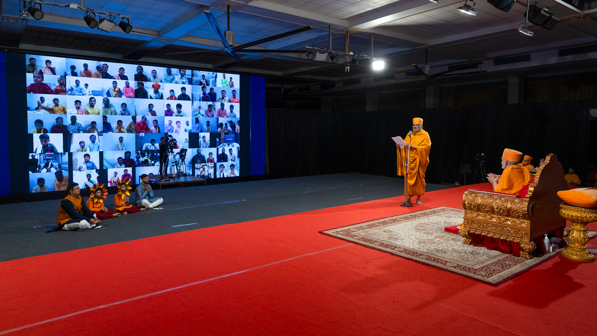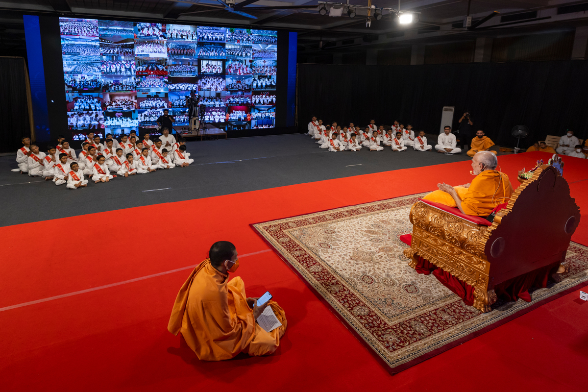 Swamishri offers shiro to balaks, balikas and karyakars via video conference