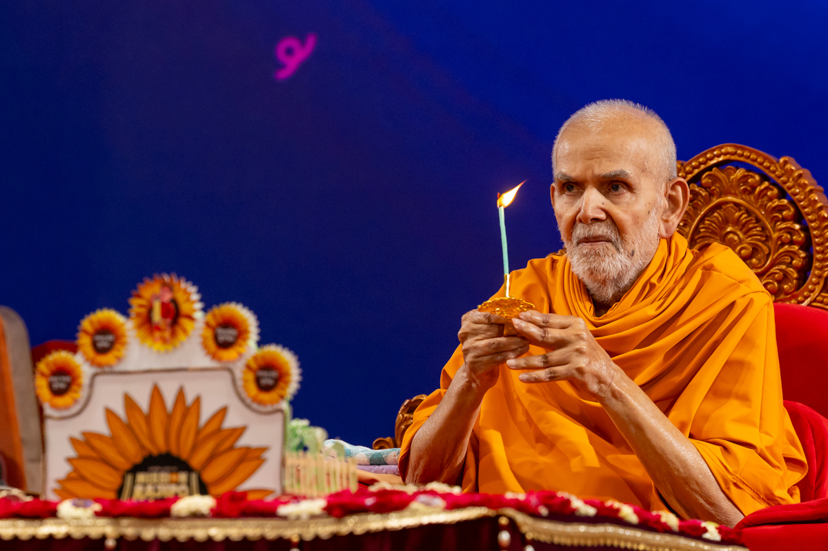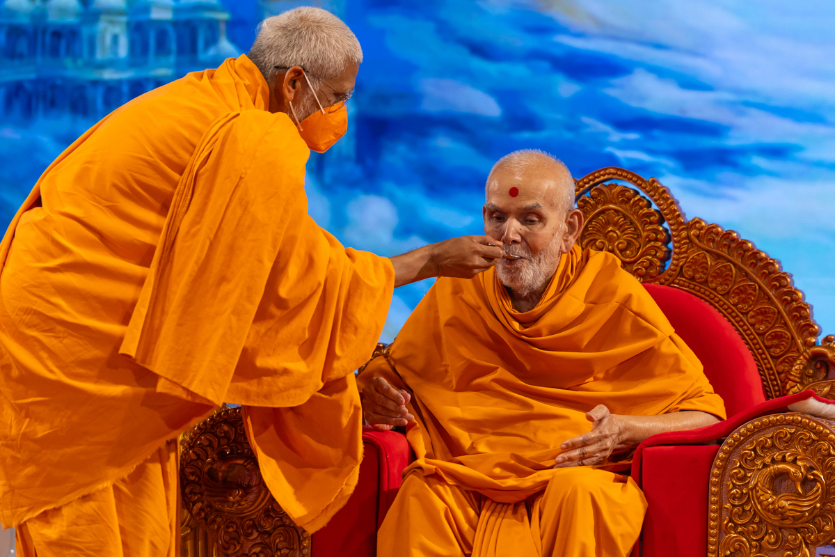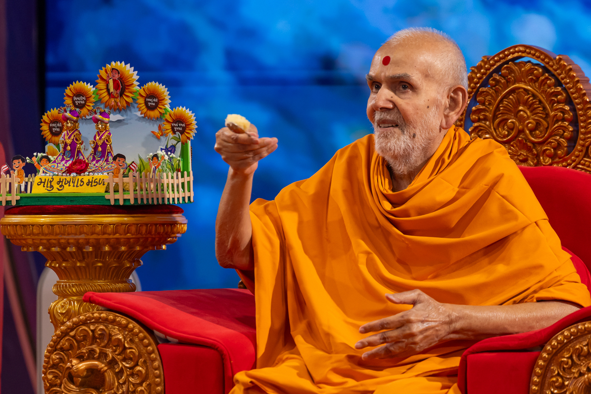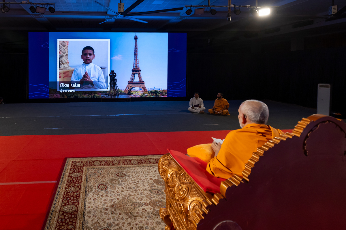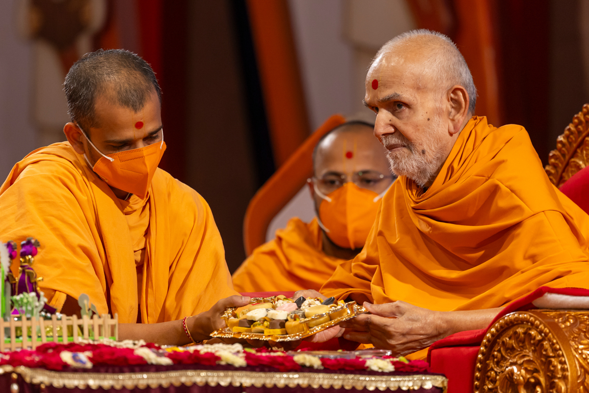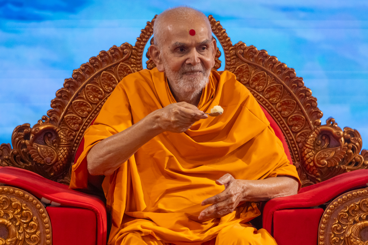 Swamishri offers shiro to balaks, balikas and karyakars via video conference