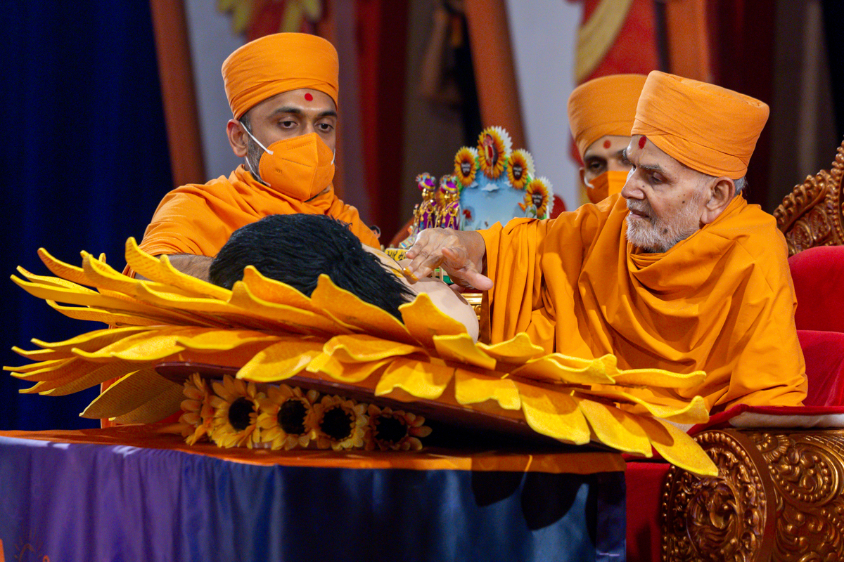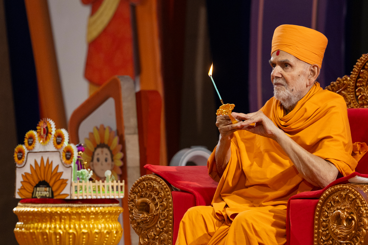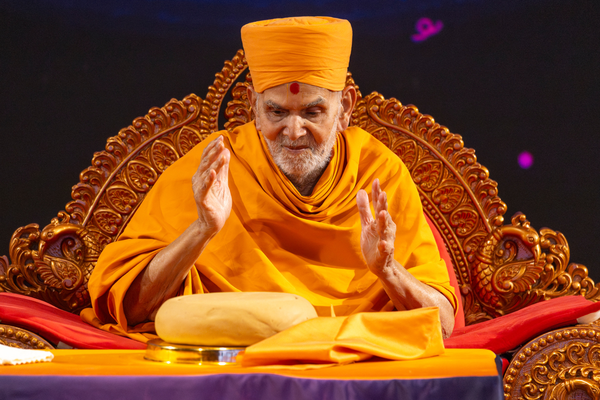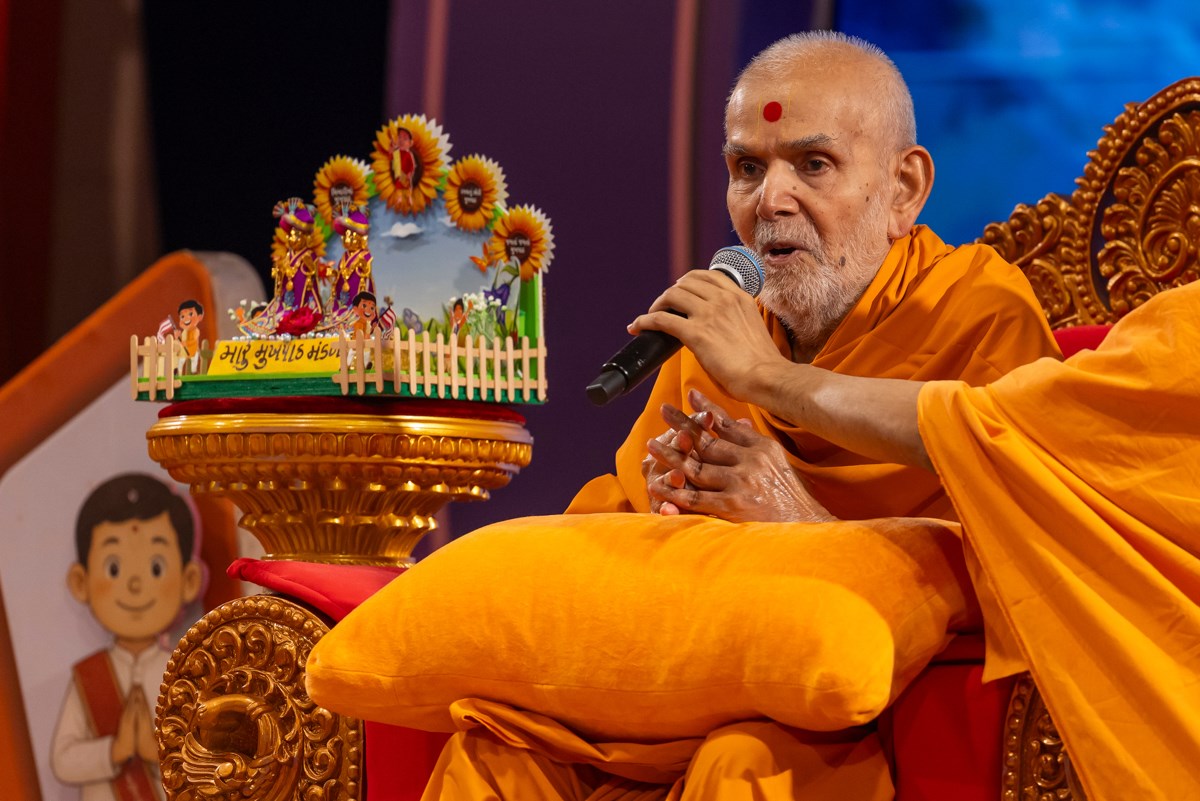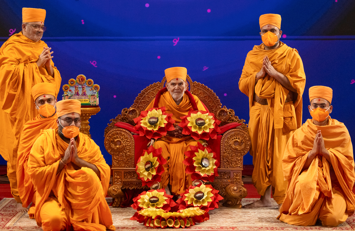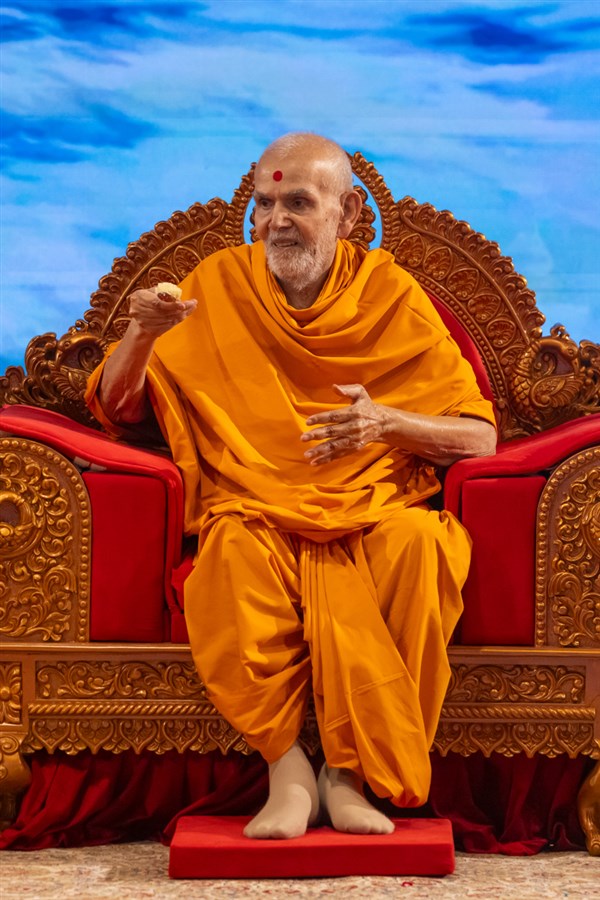 Swamishri offers shiro to balaks, balikas and karyakars via video conference