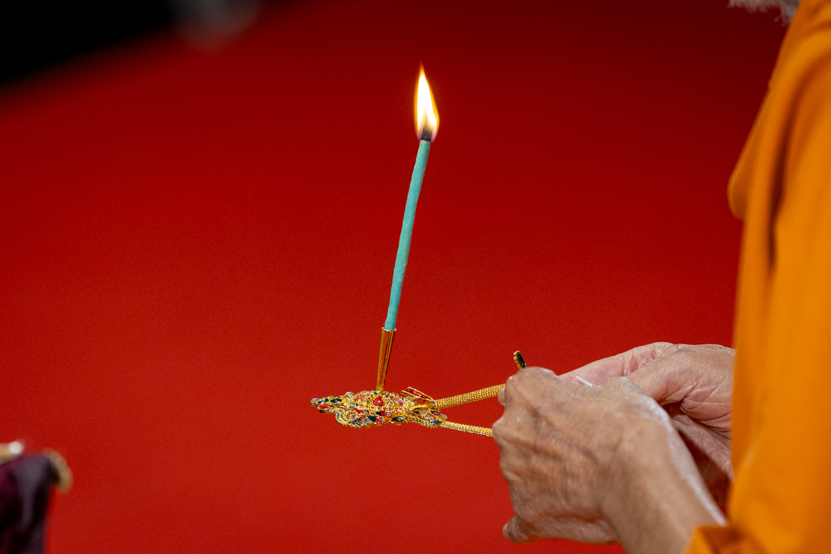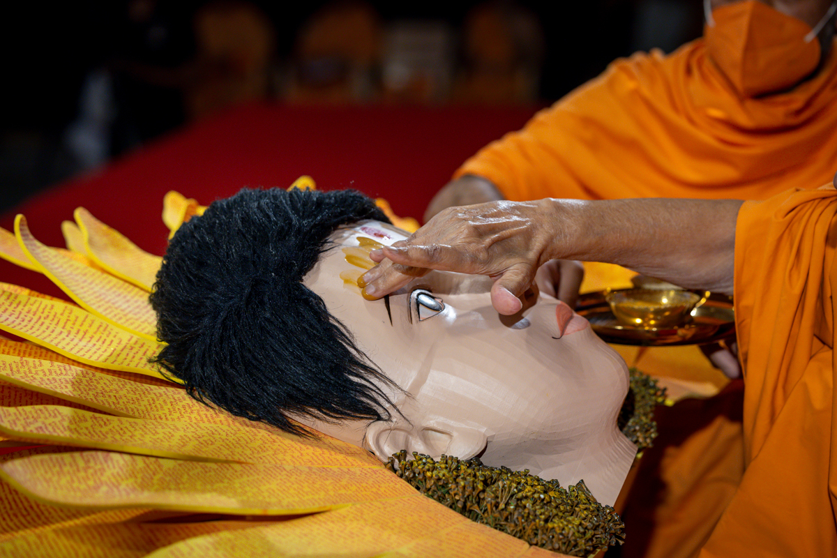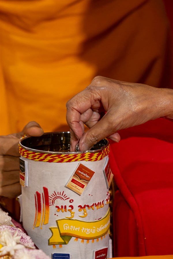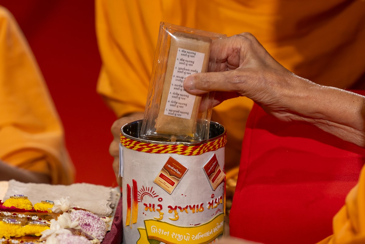 Swamishri sanctifies water with the holy relics of Bhagwan Swaminarayan and the Guru Parampara