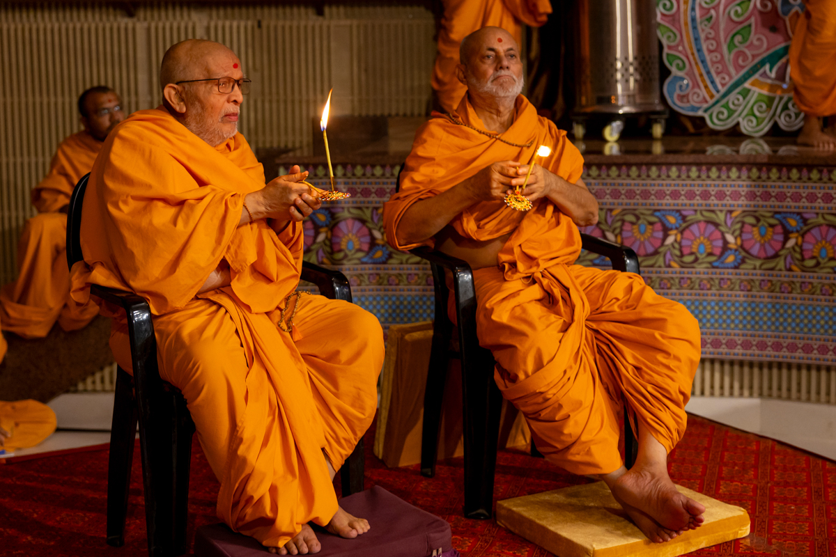 Pujya Ghanshyamcharan Swami and Pujya Viveksagar Swami perform the arti