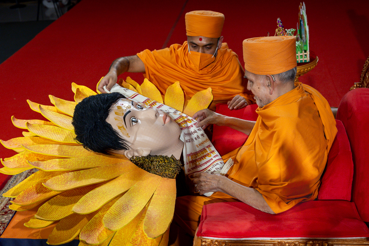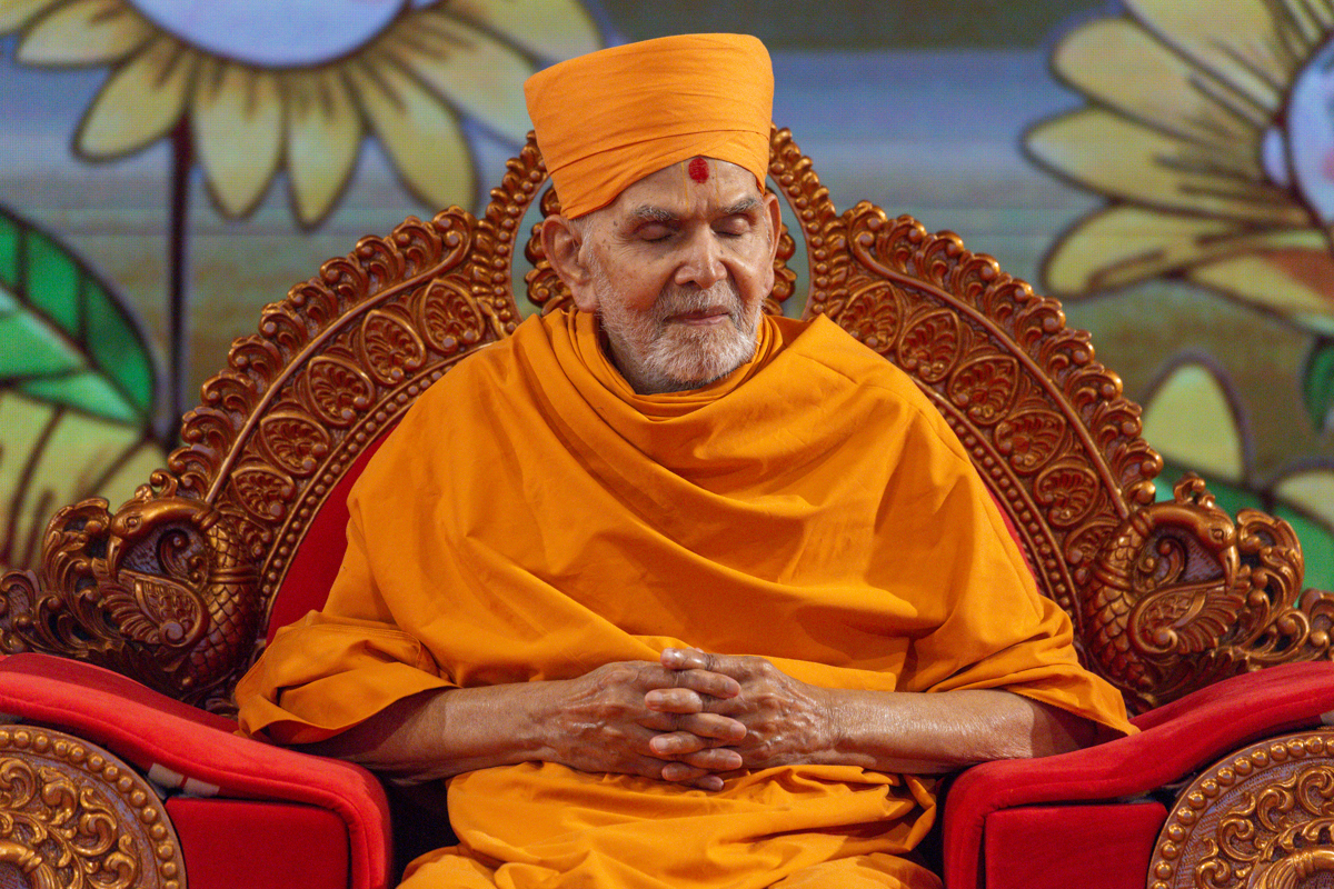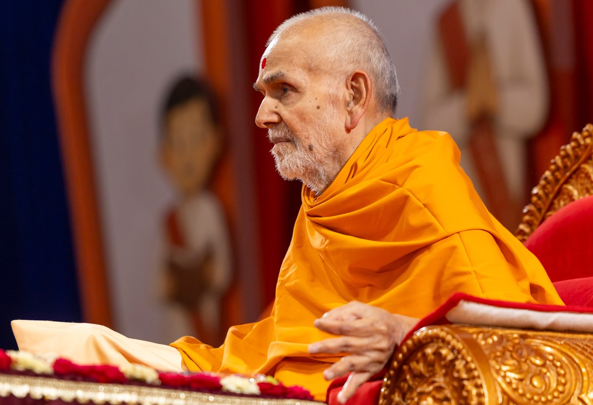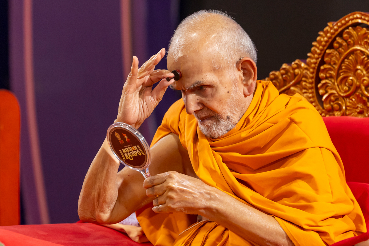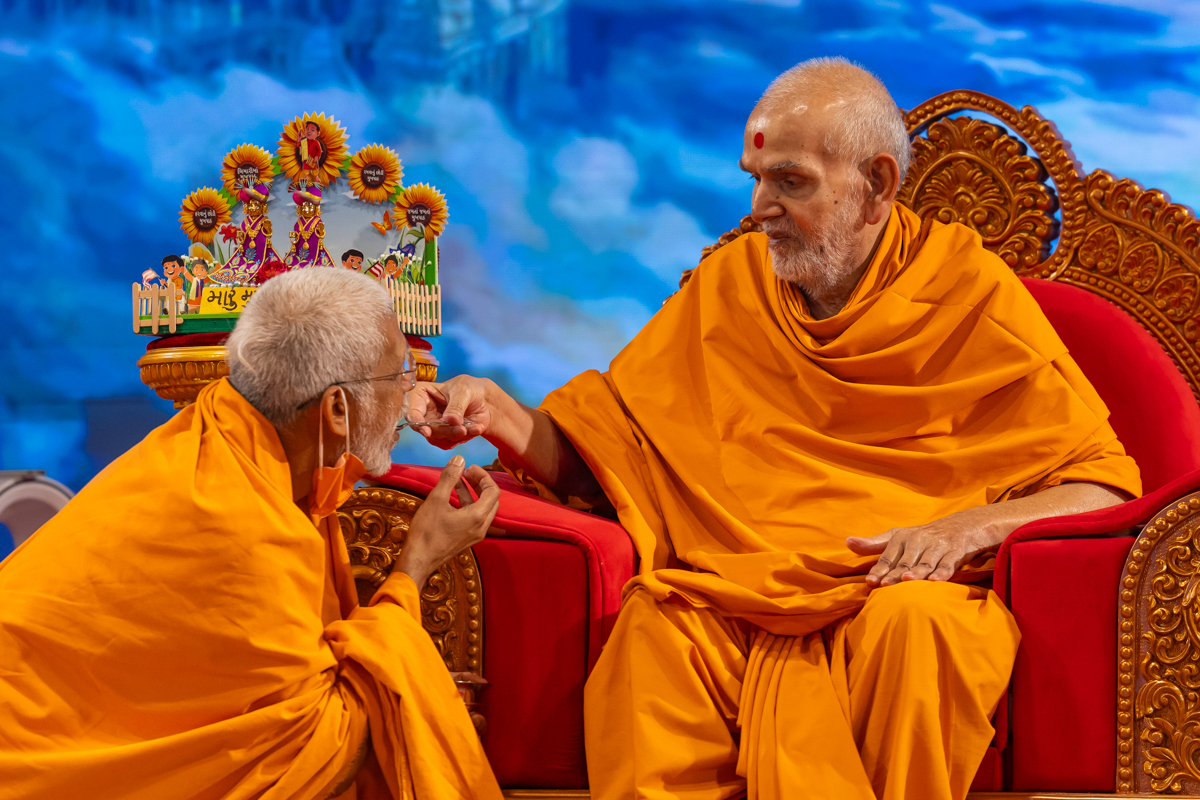 Param Pujya Mahant Swami Maharaj engrossed in darshan of Shri Harikrishna Maharaj and Shri Gunatitanand Swami Maharaj