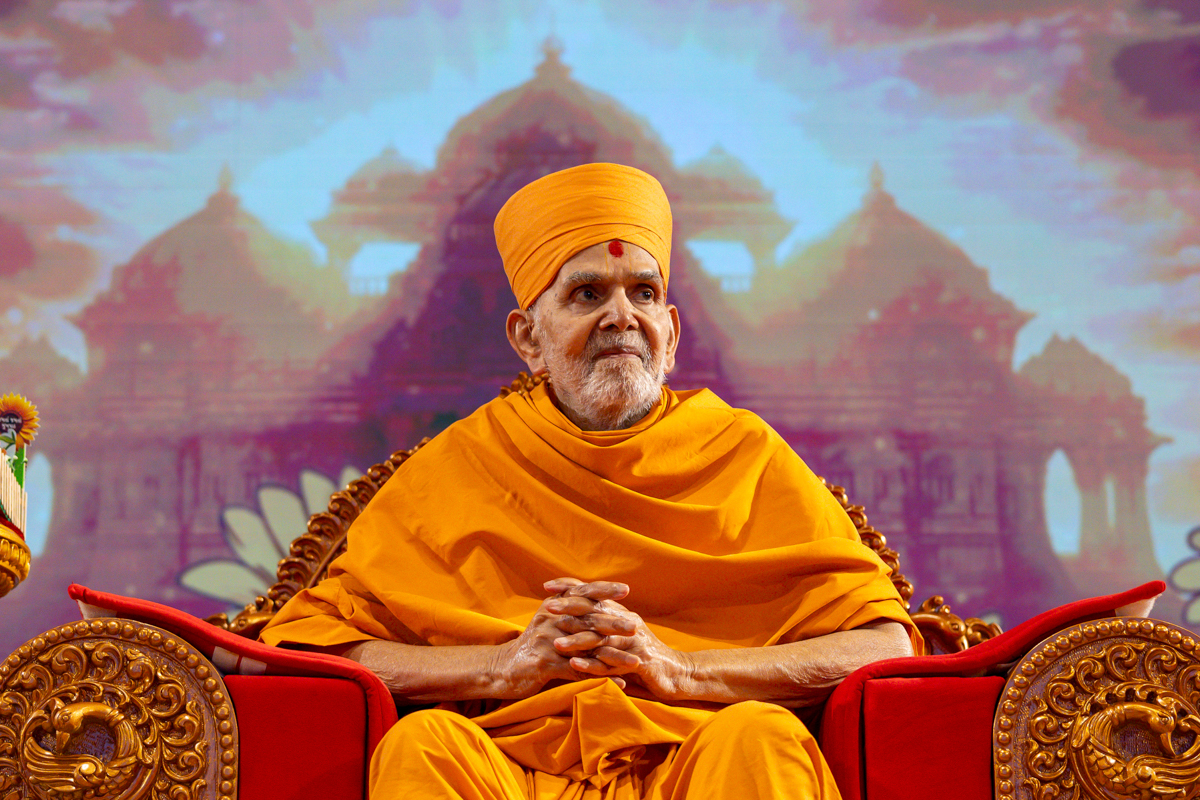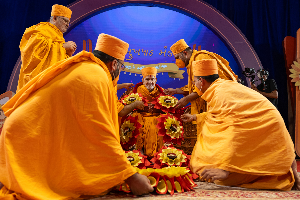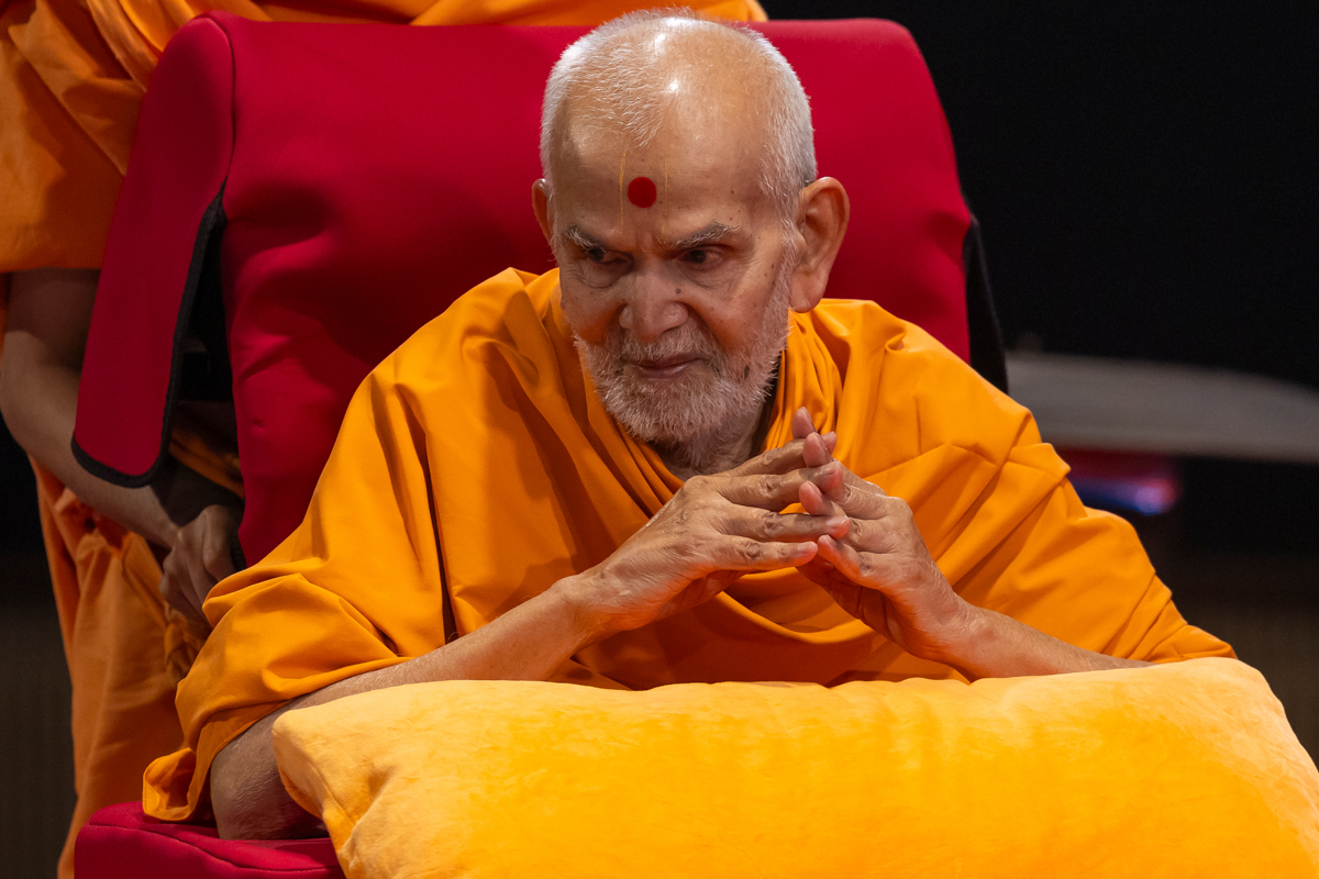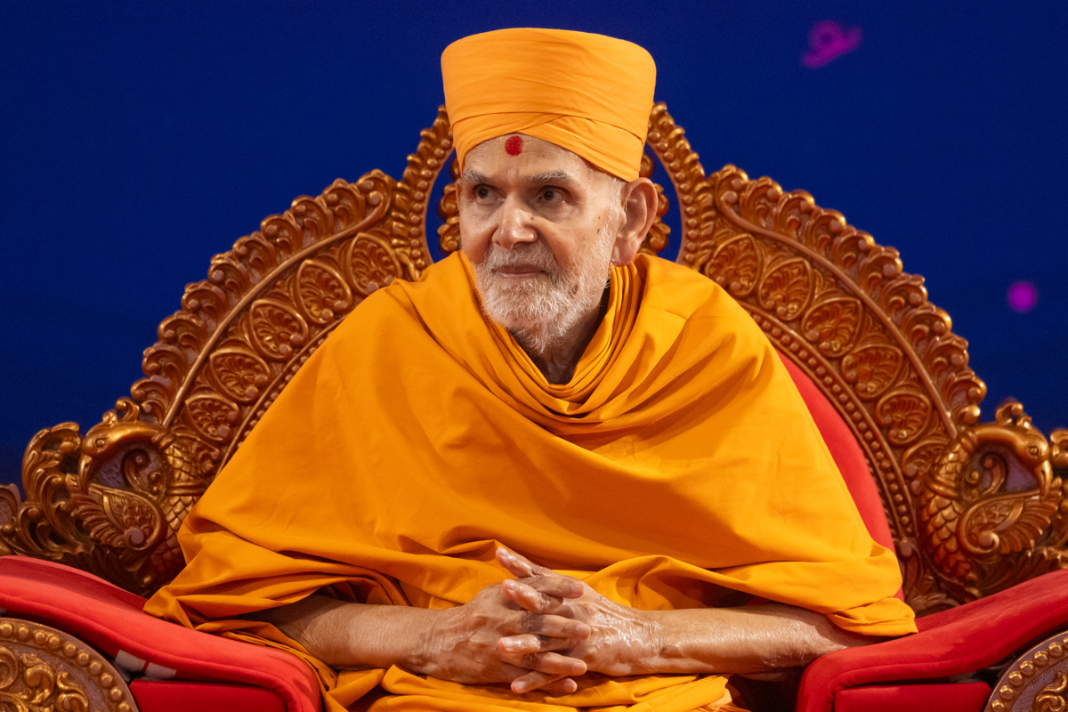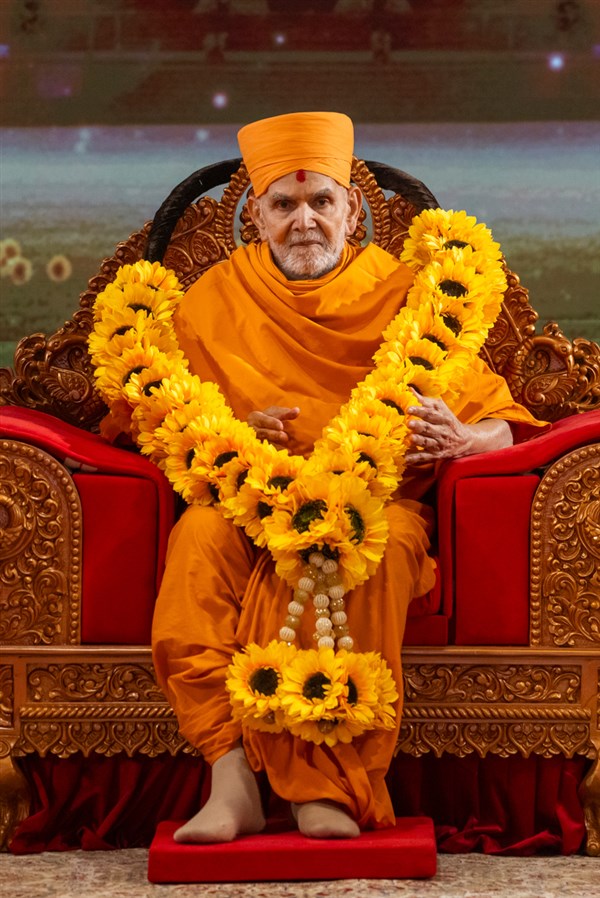 Param Pujya Mahant Swami Maharaj engrossed in darshan of Shri Harikrishna Maharaj and Shri Gunatitanand Swami Maharaj