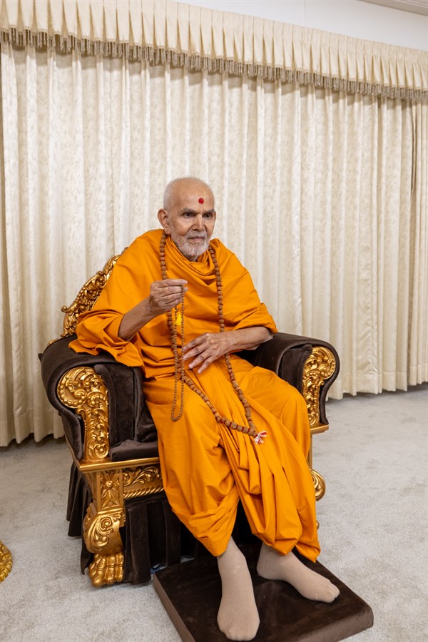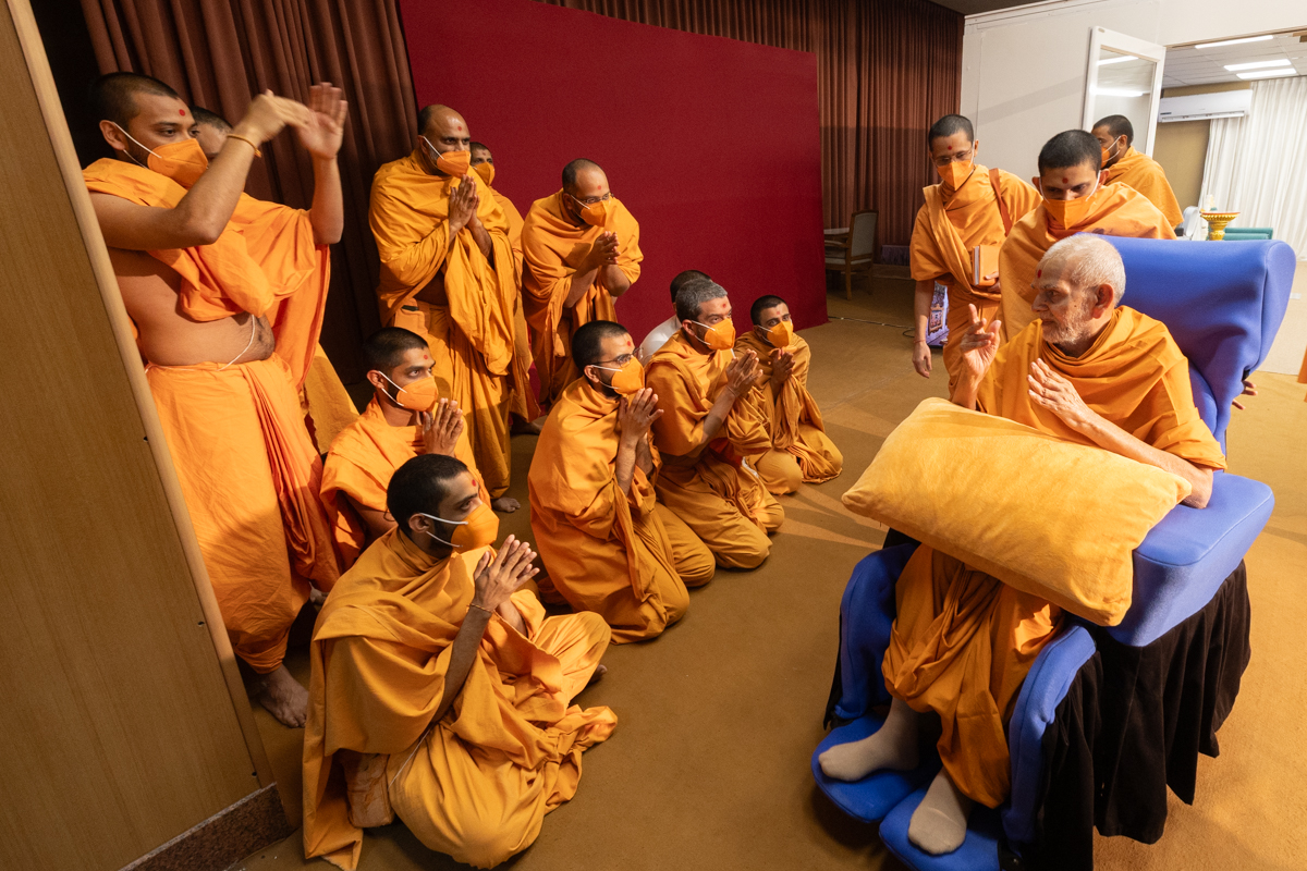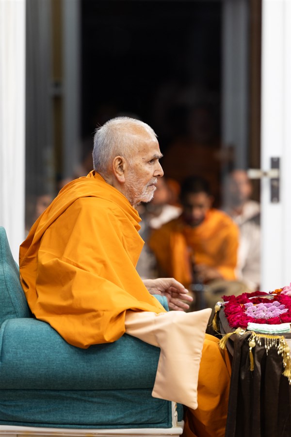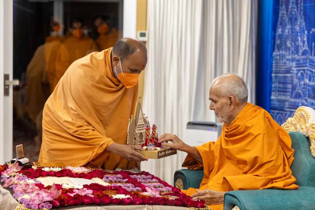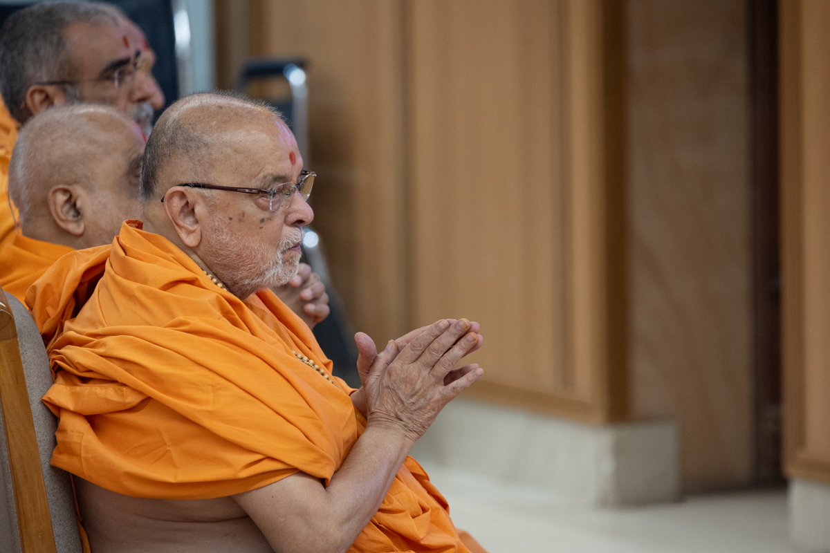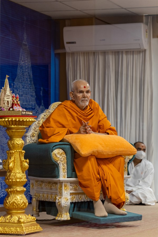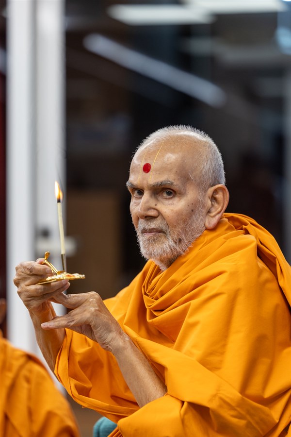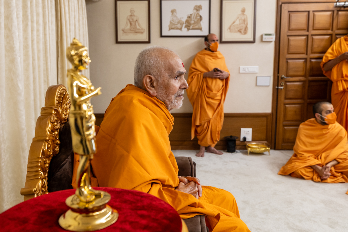 Param Pujya Mahant Swami Maharaj arrives to perform his daily puja