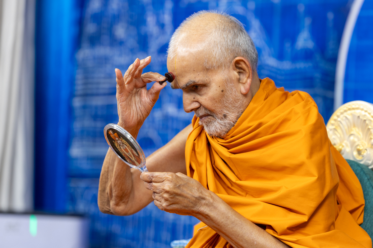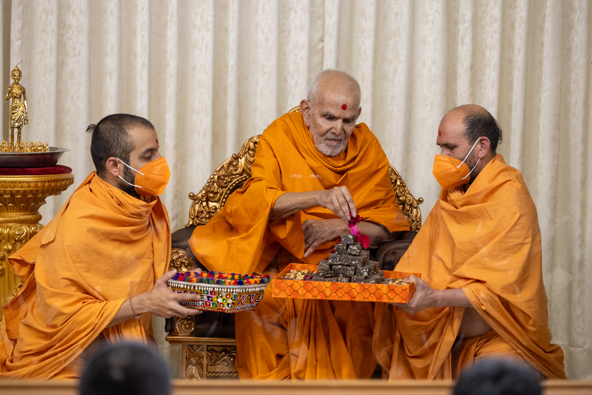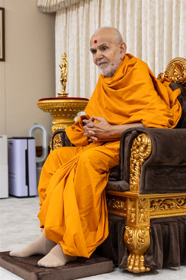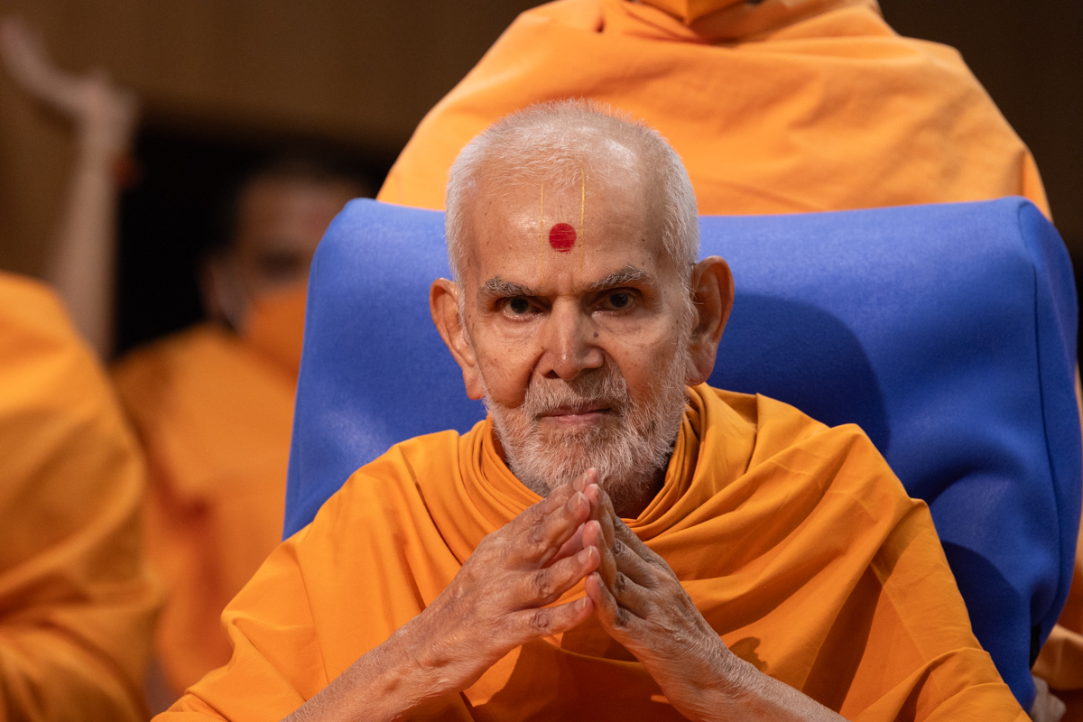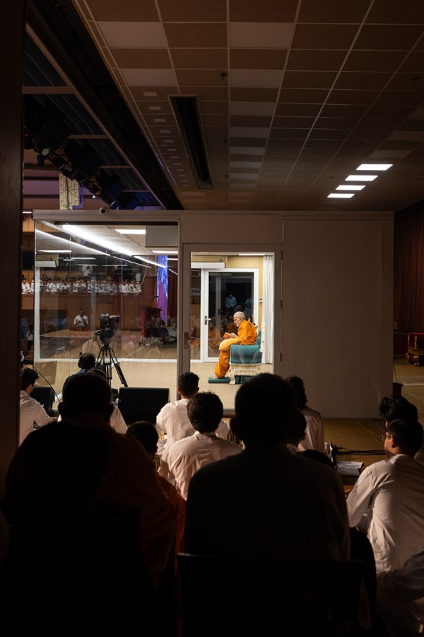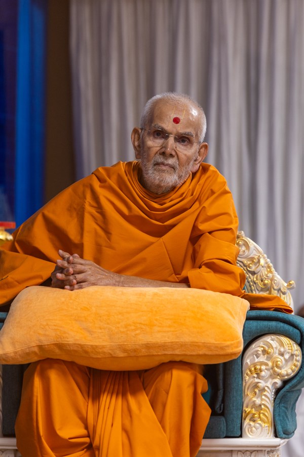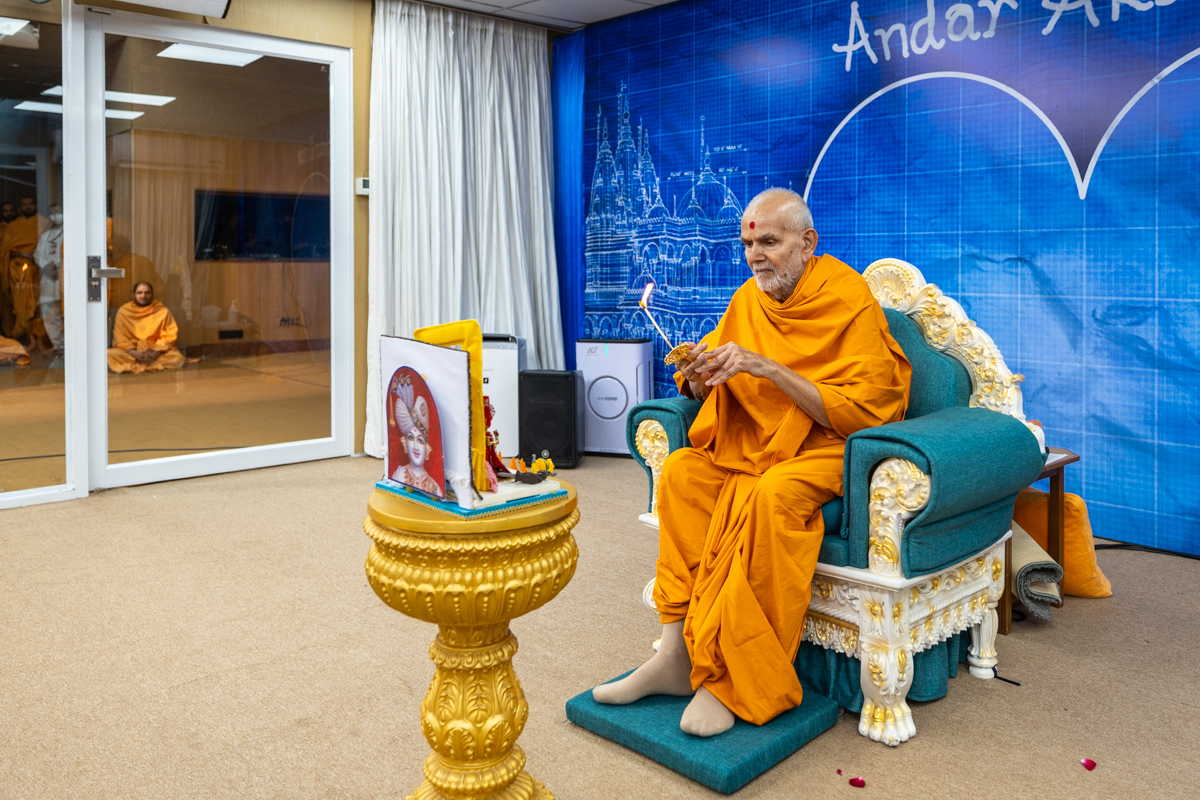 Param Pujya Mahant Swami Maharaj arrives to perform his daily puja